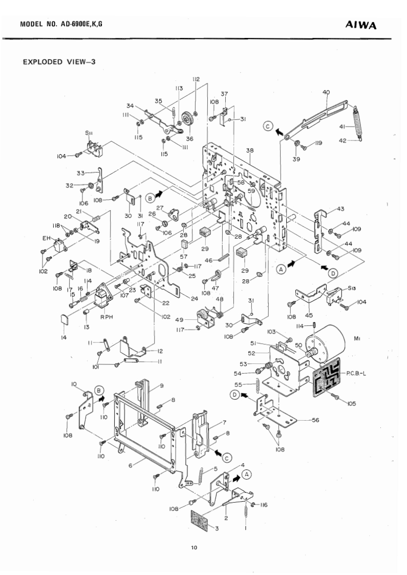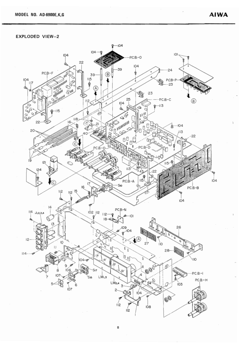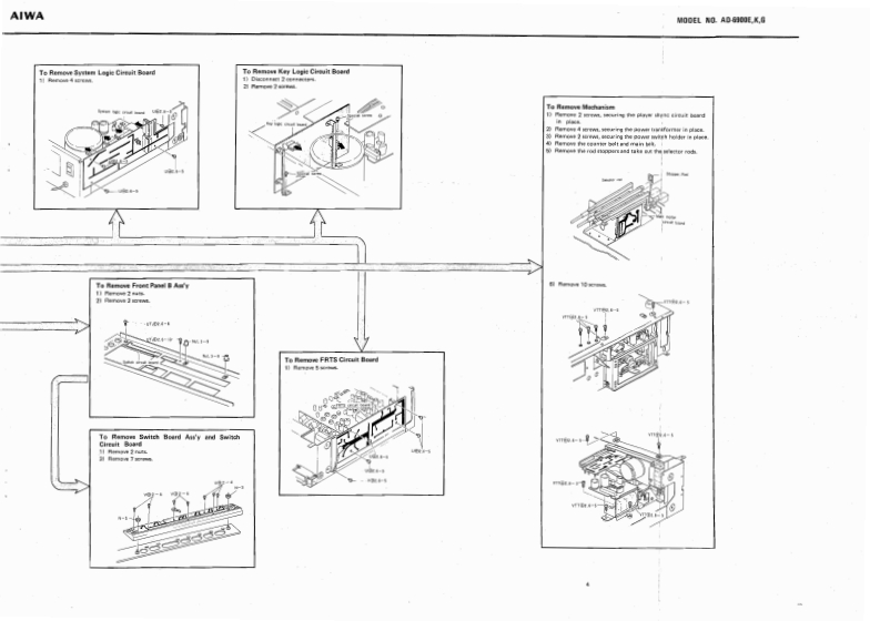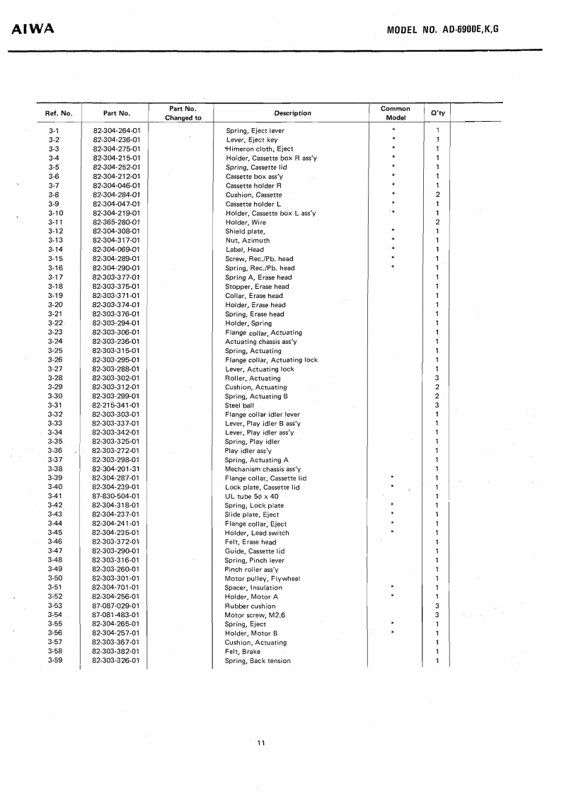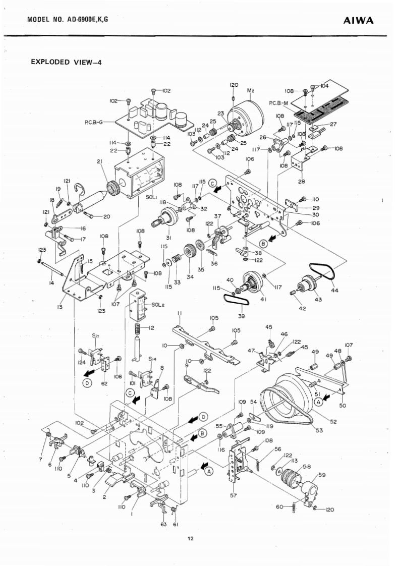 STEREO CASSETTE DECKWITH DOLBYNR SYSTEMMODEL NO.AD-69O▣E,KGAIWA(SERVICE MANUAL】三®®®日DATE OF ISSUE 9/1978SPECIFICATIONSSemiconductors:13IC's,171 transistors,82 diodes,Frequency response:LH type,20~16 kHz12 FET's 6 LED'sPower source:AC 110~120V/220V/240V (E model)2514kz(3d8)AC 120V/240V (K.G model)Power consumption:28chab1e50/60,S0Fe-Cr tape,20~20 kHz25~18 kHz dB)Dimensions:450(W0×120(H)×327ID)mmCrO,tape,20≈19kHzWeight:9.8kgTrack system:4-track 2-channel stereo25-17kz(号aB)Tape spe4.76cm/e405gMotor:38 pulse FG servo motor (for capstan)Wow flutter:Less than 0.04%(WRMS)at PbDC servo motorAutomatic stop system:Full auto-stopHead:V-cut conbination ferrite headAutomatic shut-off action time:[for Rec./Pb)2±0.50euble cap ferrite head (for Erasure)Pinch roller pressure:580+70Input:MICMax.input sensitivity-40g0.25mVTake-up torque:FF&rewind torque:50±10gcm(200 ~10 ks suitable)155±259cmLINE IN:Max.乐品ninactin5365±5s0c.《wlc-60 cassette】(More than 50 kn)DIN:Max,input sensitivityPlayback output:0.58±0.06V(LINE)0.25mv,50k1(TTA-161)Output柱LINE OUT;Standard output levelPlayback noise:Less than 3.5 mV (LH,DOLBY OFF)0.41V(0VU)(Un-Weighted)Less than 1.0 mV (Fe-Cr,CrO2,Optimum load impedanceDOLBY ON)More than 50 knRec./Pb output:0VU±1.0 dB (LINE)DIN:Standard400Hz0VU月Rec./P distorrtion:Less than 1.5%(LH)Optimum ioad impedance(400Hz0VU)Less than 1.0%(Fe-Cr)More than 50 knLess than 1.5%(CrO,)PHONES;8n~150nRec./Pb S/N:More than 40/45 dB LH,DOLBY(400 Hz 0 VU)OFF/ON)[Un-Weighted)More than 43/46 dB (Fe-Cr,CrO.DOLBY OFF/ON)Channel separation:More than 30 dB(1 kHz 0 VU)Cross talk:More than 60 dB(1kHz0VU】More than 60 dBVU meter display error:0VU±0.5dBSpecifications and external appearance are subject totoVU月change without notice due to product improvement.Peak meter display error:0VU+7d8)+7dB±1dB.Dolby Noise Reduction System is licensed from Dolby0VU-10dB)-10dB±1dBLaboratories Incorporated(0 VU-20 dB)-20 dB 12 dBThe name "Dolby"and the "Double D"symbol areBias frequency:105 kHztrademarks of Dolby Laboratories Incorporated.