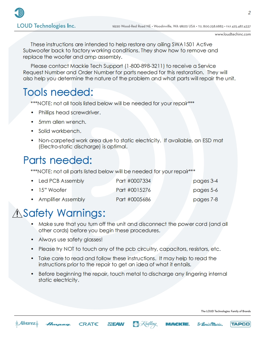 mackie_swa1501_repair-manual_[ET]找手册网2小时前发布关注私信0.51MB8页037mackie_swa1501_repair-manual_[ET]此内容为付费资源,请付费后查看¥19¥21黄金会员免费钻石会员免费立即购买您当前未登录!建议登陆后购买,可保存购买订单付费资源 第1页 / 共8页 第2页 / 共8页 第3页 / 共8页 第4页 / 共8页 第5页 / 共8页 第6页 / 共8页 第7页 / 共8页 第8页 / 共8页 已完成全部阅读,共8页 THE ENDMackie 文本预览 1LOUD Technologies Inc.16220 Wood-Red Road NE.Woodinville,WA 98072 USA.TEL800.258.6883 FAX 425.487.4337www.loudtechinc.comSWA1501 REPAIR MANUAL⊙◎◎◎O◎0The LOUD Technologies Family of BrandsAlvarezCRATE丑EAW亚飞MACKIE.SSouismusie.TAPCO 查看更多 收起部分 喜欢就支持一下吧收藏
