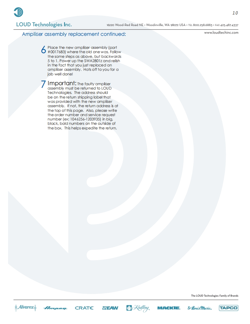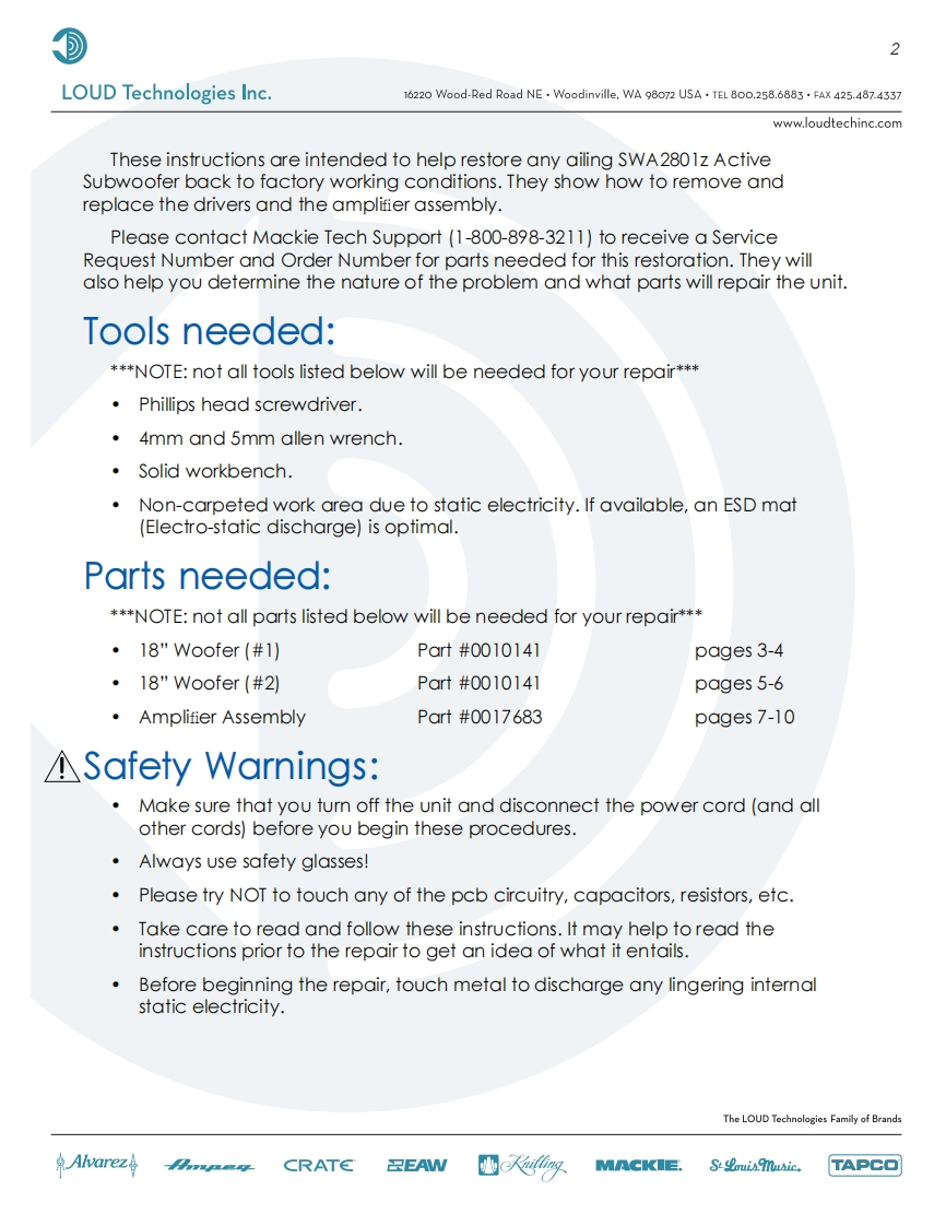 Mackie_SWA2801z_Repair_Manual找手册网2小时前发布关注私信0.67MB10页032Mackie_SWA2801z_Repair_Manual此内容为付费资源,请付费后查看¥19¥21黄金会员免费钻石会员免费立即购买您当前未登录!建议登陆后购买,可保存购买订单付费资源 第1页 / 共10页 第2页 / 共10页 第3页 / 共10页 第4页 / 共10页 第5页 / 共10页 第6页 / 共10页 第7页 / 共10页 第8页 / 共10页 第9页 / 共10页 第10页 / 共10页 已完成全部阅读,共10页 THE ENDMackie 文本预览 1LOUD Technologies Inc.16220 Wood-Red Road NE.Woodinville,WA 98072 USA.TEL 800.258.6883.FAX 425.487.4337www.loudtechinc.comSWA2801z REPAIR MANUALThe LOUD Technologies Family of BrandsAlvarezCRATE REAW亚飞MACKIE.SuismunieTAPCO 查看更多 收起部分 喜欢就支持一下吧收藏