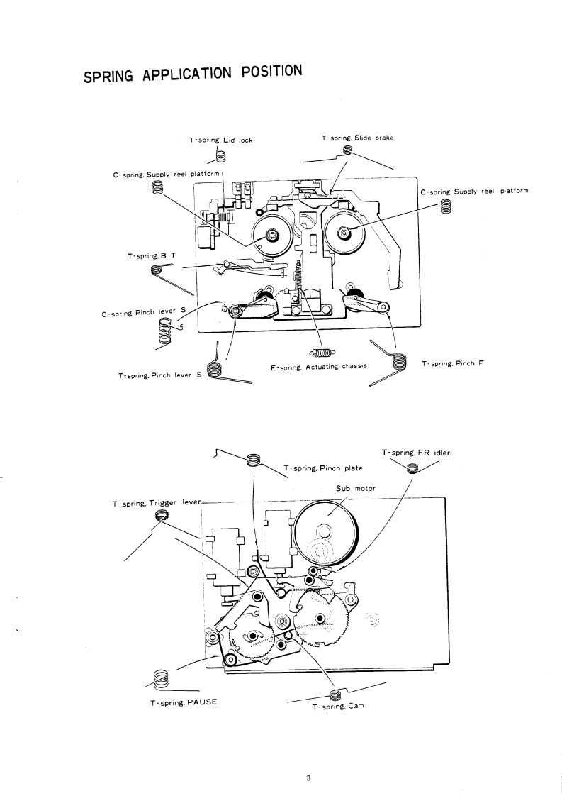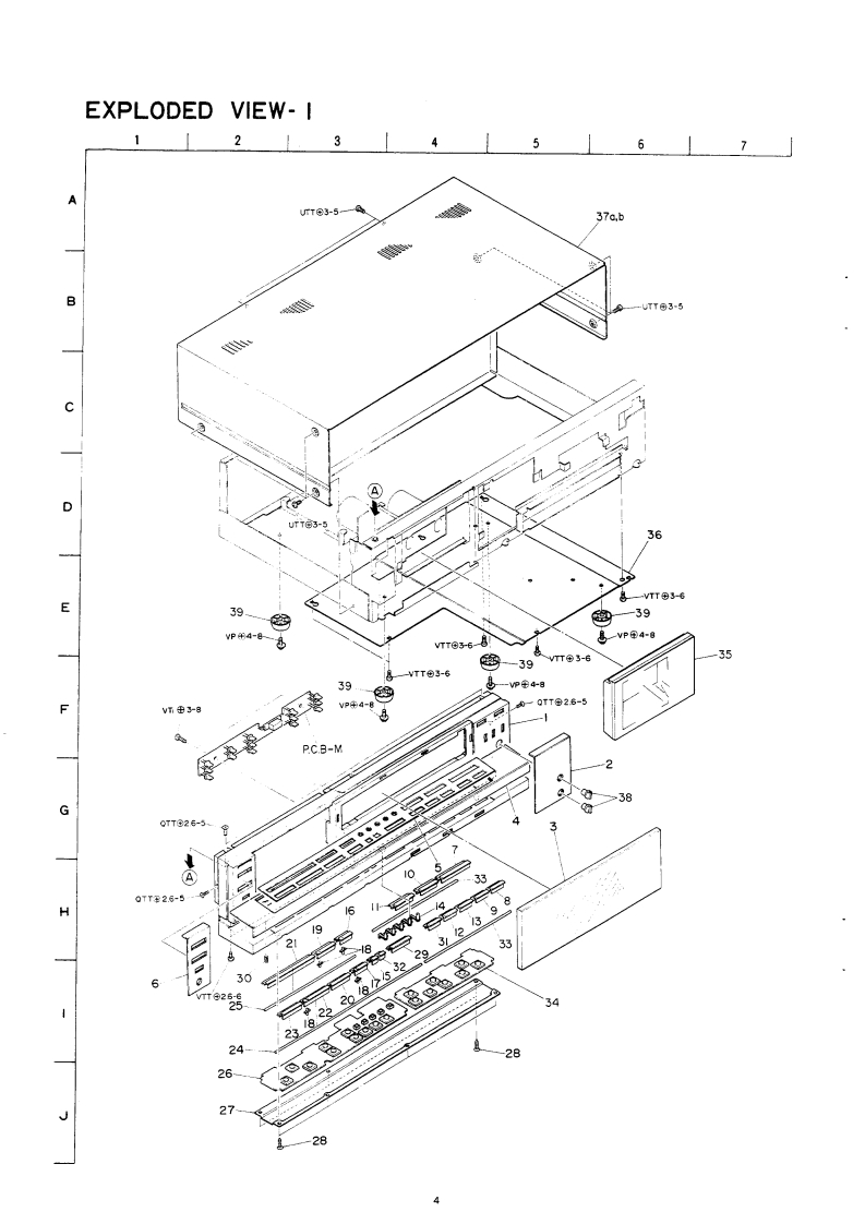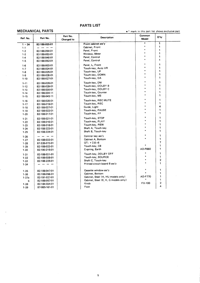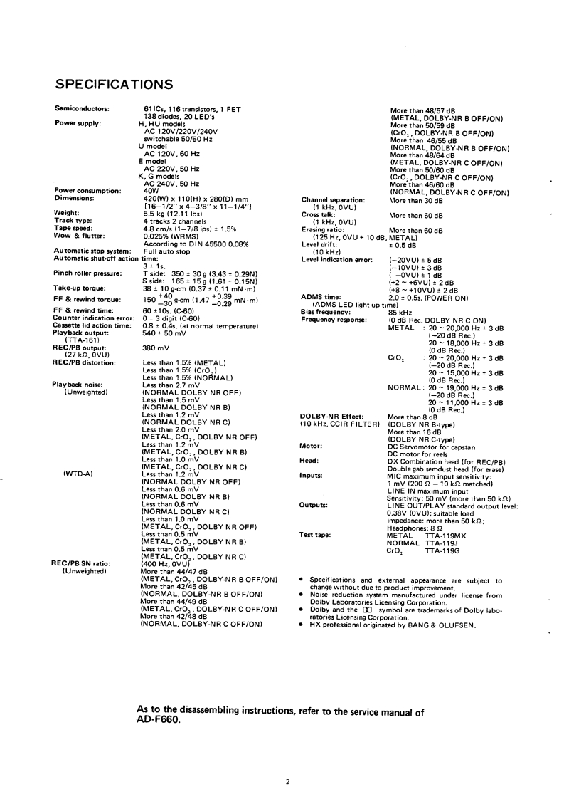 AIWAS/M Code No.83-014DATE OF ISSUE 5/1983SERVICEMANUALMODEL NO.STEREO CASSETTEDECKA▣-F99OTYPE.H,HU,U,E,K GFollow the instructions carefully,which will allow the user to optimise the products'performance and give many years of serivce.1.No scratch and melting shall be made to covered lead-wires of an 6.General instructions for mechanism repaira.c.primary circuit including mains leads.11 The heads,capstan and pinch roller shall be cleaned of good2 No illegibility shall be given to the specification plate,the cau.quality alcohol after repaired,because dirty heads shall causetion labels,the fuse labels and others.distorted sounds while dirty capstan and pinch roller shall3.When,on pattern sides of circuit boards,additional repair-partsoccur wow/flutter and take-up fault.have been made up,the parts shall be firmly glued to circuit2)Lubricants been stained the surfaces of transmitting portionboards or other components,unless the parts can be attachedof the belts,idlers,capstan and pinch roiler shall be removed,firmly.because slippery and faulty tape travel shall be caused.4.The following matters shall be maintained as they are,when3)When oiling,only one or two drops shall be applied so asrepairing.not to run over and be dispersed.Note should be taken of the1)Soldering of lead-wire endsmetal fitting for the capstan and rotating portions of the*Care should be taken of the space distance in an a.c.priidlers and pinch roiler,especially.mary circuit as well as soldering.4)E-rings and poly slider washers shall be replaced with new2)Wiring and holding of lead wires with wire.clips and bindersones,if once those have been removed.No re-utilization3)Materials of lead-wiresdue to unreliability."e.g.;For UL models,lead-wires to be used shall be ap.5)Regular spare-parts shall always be used for repair,becauseproved or accepted by the UL.using irregular parts and tampering with the products shall4)Location of all kinds of insulatorscause deterioration,mulfunction and damage5)Setting of voltage selector switch'Set the Voltage Selector Switch to 240V,220V,or 120VAccording to your Local Voltage.5.After repaired,the insulation resistance or leakage current shallbe measured with 500 5V D.C and shall be not less than 1Ms.Measuring PointComect tn Caxsis r Dutsde nt Pin JackRatinng More than 1M '500V DCPn Jark(-》