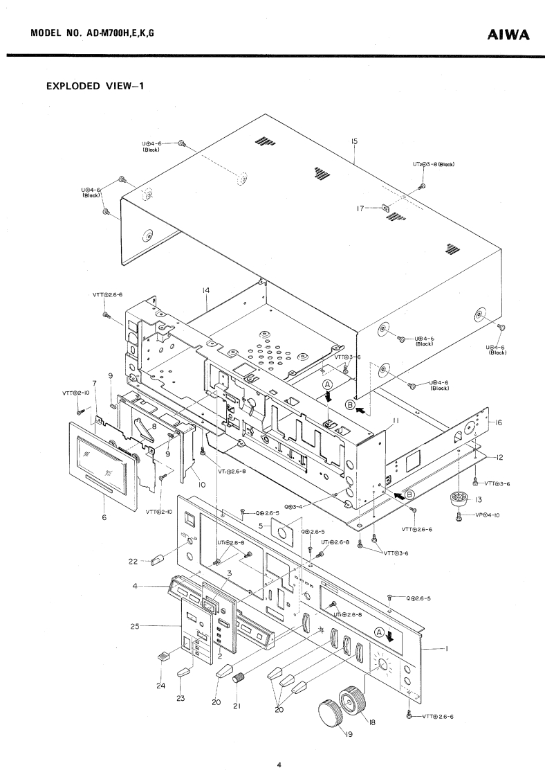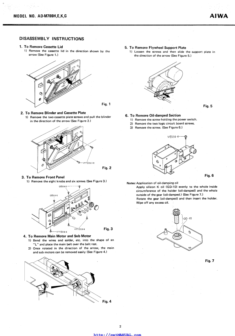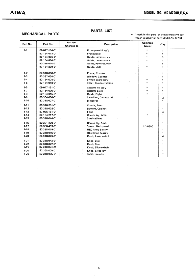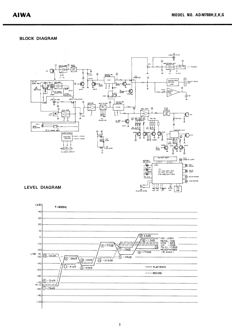 gMSTEREOCASSETTE DECKWITH DOLBY-NR SYSTEMMoDEL No.AD-M700H,E,K,GAIWA(SERVICE MANUAL】Code No.96770-00052DATE OF ISSUE 10/1979SPECIFICATIONSSemiconductor:VU meter display error:0VU±0.5dB(O VU)(H model only]Bias frequency:105 kHz8 IC's,75 transistors,49 diodesFrequency response:OVU12 LED'sMETAL:30~12.500 Hz(E,K,G model only)30-8.000HzPower source:AC110V120V/220V/240W-20v元Switchable 50/60 HzMETAL:20~19,000 Hz(H model)20-18,00H2AC110120V220wSwitchable 50/60 HzLH:20-18,000H8MEr~16.000HIE model)Bias adjustment range:AC120V240VSwitchable 50/60 Hz±20%LH,FeCr,Cr0,)Motor:DC servomotor【capstan(K,G model)DC motor (reels]Power consumption:20WHead:Recording/PlaybackDimensions:450w)×120(H)×270(D)mmV-cut Combination sendust headWeight:7 kgErasureTrack system:4 track 2 channel stereoDouble gap ferrite headTape speed:4.Bcm/s±1%Recording system:AC biasWow flutter:Less than 0.04%(WRMS)Full auto stopErase system:AC eraseAutomatic stoo svAutomatic shut-off action timeInput:MIC:Max.input sensitivity0,3mV412mkeuplerigaures(200 2~10 ks suitablel450±40g4.41±0.39N98 mN-m)LINE IN::10Max.input sensitivity50 mVorque:&rewind time(More than 50 k)Less than(w/-60ca5 sette】DIN:Max.input sensitivitylayback output0.58±0.05V(LINE,D1N】0.1mV/k32.7kTTA-161)Output:LINE OUT:Standard output levelPlayback noise:Less than 1.3 mV (METAL0.41V0VU(Un-Weighted)CrO,,Fe-Cr.DOLBY NR ON)Less than 2.8 mV (LH.DOLBYNR OFF)Rec./Pb output:0VU±1.5 dB (LINE OUT.DIN(400 Hz 0 VU)DIN;OUT)Rec./Pb distortion:than 1.2%(METAL)400Hz0VUOptimum loadLess than(Cr02impedance More thanLess than 1Cr50 kness Inan 1.5%(LHPHONES:8More than 43/46 dB [METAL,CrO,,Fe-Cr.DOLBY NR OFF/ON)Specifications and external appearance are subject to changeMore than 40/45 dB (LH,DOLBYwithout notice due to product improvemNR OFF/ON]Dolby Noise Reduction System is licensed from DolbyChannel separation:More than 35 dB(1 kHz 0 VU)nd the "Double D"symbol are tradeCross talk:Mor阳than60dBmarks of Dolby Laboratories Incorporated.(1 kHz 0 VU】Erasing ratio:More than 60 dB(METAL 125 HzCrO,,Fe-Cr.LH400 Hz,0 VU+10 dB)