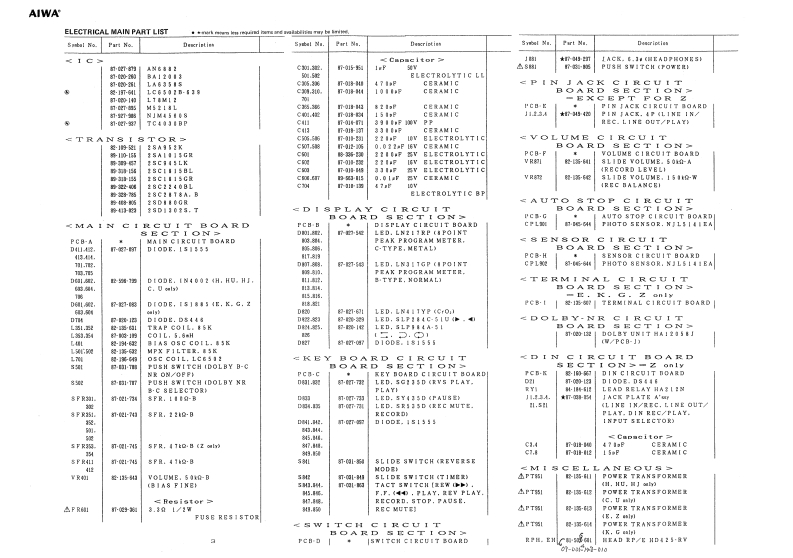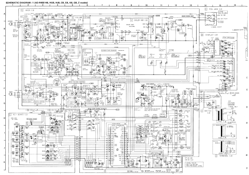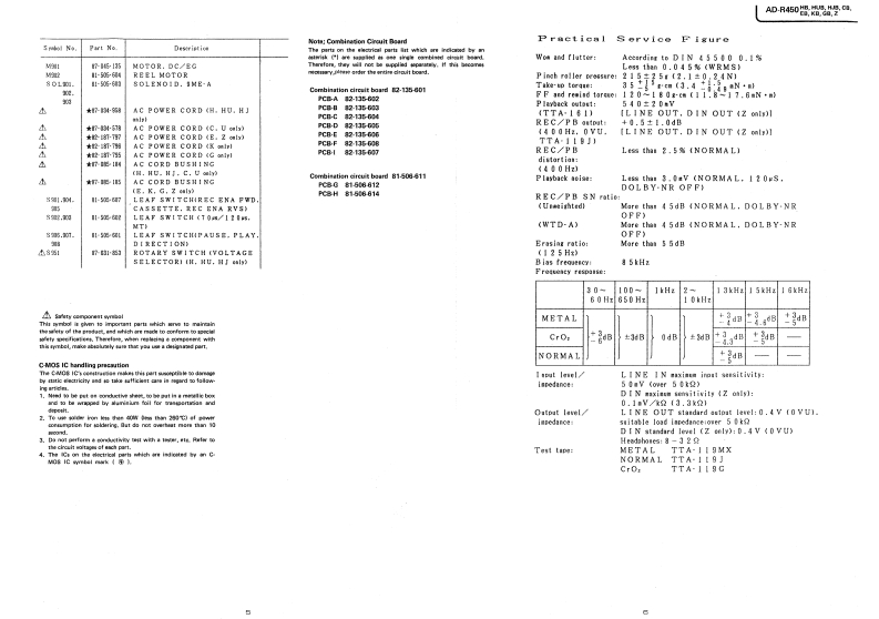 AIWAS/M Code No.84-025DATE OF ISSUE 9/1984SERVICEMANUALMODEL NO.STEREO CASSETTEDECKAD-R450TYPE.HB,HUB,HJB,CB,EB,KB,GB,ZSPECIFICATIONSTypeStereo cassette tape deckRecording system AC bias (frequency 85 kHz)Track format4 tracks 2 channelsErase systemAC erasePower supplyAD-R450 E.ZMotorDC Servomotor x 1,DC Motor x1AC220V,50/60HzHeadDX headAD-R450K.GInputsLINE IN maximum inputAC240V,50/60Hzsensitivity:50 mV (over 50 kn)AD-R450U,CDIN max sensitivity (Z model only)AC 120V,60 Hz0.1 mV/kn (3.3 kn)AD-R450 H,HU.HJOutputsLINE OUT standard output level:AC 120 V/220 V-240 V switchable,0.4 V (0 VU);suitable load50/60Hzimpedance:over 50 kn;PowerDIN standard level (Z model only):consumption15W0.4V(0 VU)FrequencyHeadphones:8-32nresponseMETAL tape:20-18,000HzDimensions4200WM×110H)×300(D)mmCrO:position tape:20-17,000 HzWeight4.4kgNORMAL tape:20-16.000HzAccessoriesStereo pin cord(2)Signal-to-noiseratio73 dB (METAL tape DOLBY C NRON)Design and specifications are subject to change withoutWow and flutternotice,According to DIN 45 500 0.1%Noise reduction system manufactured under license0.04%(WRMS)from Dolby Laboratories Licensing Corporation.Tape speed4.8 cm/sec.(1-7/8 ips).Dolby and the a symbol are trademarks of DolbyRewind time70sec.(C-60)laboratories licensing corporation.Fast forward time 70 sec.(C-60)