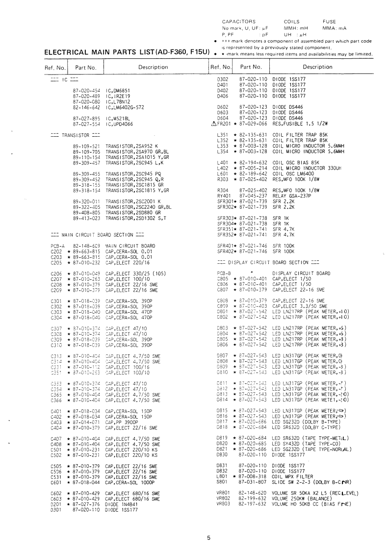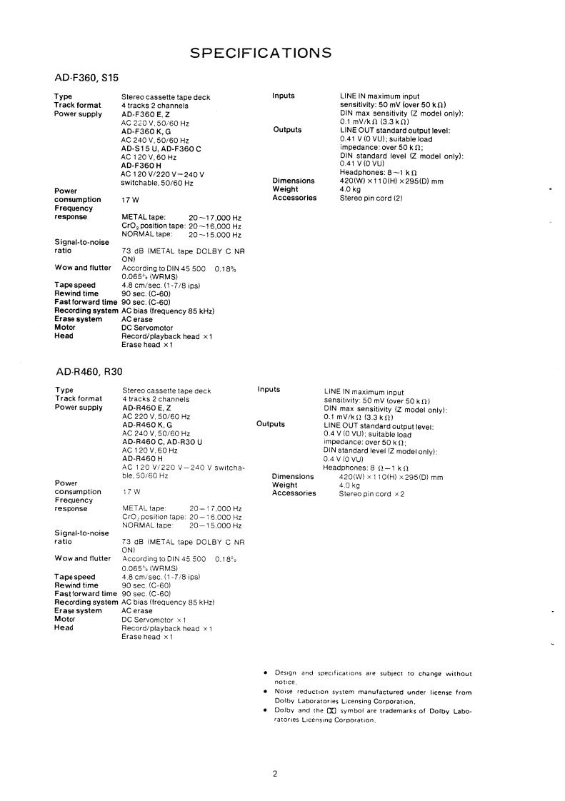 AIWAS/M Code No.86-026DATE OF ISSUE 6/1986-ZSERVICEMANUALSTEREOCASSETTE DECKMO▣ELNO.AD-F360,S15STEREO CASSETTE IECKMODEL NO.A▣-R4G▣R3OBasic mechanism 2ME-1 (AD-R460/R30),2ME-4 (AD-F360/S15)TYPE.HB,HJB,CB,EB,KB,GB,ZB(AD-F360)UB(AD-S15)HB,HJB,CB,EB,KB,GB,ZB(AD-R460)UB(AD-R30)Follow the instructions carefully,which will allow the user to optimise the products'performance and give many years of serivce.1.No scratch and melting shall be made to covered lead-wires of an 6.General instructions for mechanism repaira.c.primary circuit including mains leads.1)The heads,capstan and pinch roller shall be cleaned of good2.No illegibility shall be given to the specification plate.the cau-quality alcohol after repaired,because dirty heads shall causetion labels,the fuse labeis and others.distorted sounds while dirty capstan and pinch roller shal3.When,on pattern sides of circuit boards,additional repair-partsoccur wow/flutter and take-up fault.have been made up,the parts shall be firmly glued to circuit2)Lubricants been stained the surfaces of transmitting portionboards or other components.unless the parts can be attachedof the belts,idlers,capstan and pinch roller shall be removed.firmly.because slippery and faulty tape travel shali be caused.4.The following matters shall be maintained as they are,when3)When oiling.only one or two drops shall be applied so asrepairing.not to run over and be dispersed.Note should be taken of the1]Soldering of lead-wire endsmetal fitting for the capstan and rotating portions of theCare should be taken of the space distance in an a.c.pri.idters and pinch roller,especially.mary circuit as well as soldering.4)E-rings and poly slider washers shall be replaced with new2)Wiring and hoiding of lead-wires with wire-clips and bindersones,if once those have been removed.-No re-utilization3)Materials of lead-wiresdue to unreliability.e.g.:For UL models,lead-wires to be used shall be ap-51 Regular spare.parts shall always be used for repair,becauseproved or accepted by the UL.using irregular parts and tampering with the products shall4)Location of all kinds of insulatorscause deterioration,mulfunction and damage5)Setting of voltage selector switchSet the Voltage Selector Switch to 240V,220V,or 120VMeasuring PeintAccording to your Local Voltage.15但.500VD5.After repaired,the insulation resistance or leakage current shallbe measured with 500:5V D.C and shall be not less than 1M.Crasss()C Poaer Cer【+34