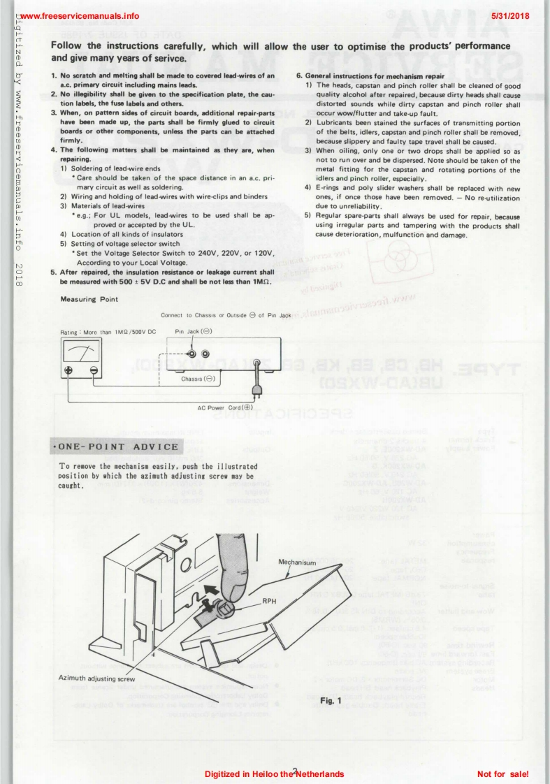 D1151AlWAS/M Code No.85/342018DATE OF ISSUE 7/1985edSERVICEMANUALMODEL NO.STEREO DOUBLECASSETTE DECKAD-WYW品1nt0 eFree service2018Gratis scDigitized bywww.freeservicemanuals.infoTYPE.HB,CB,EB,KB,GB,ZBCAD-WX200,UB(AD-WX20)SPECIFICATIONSTypeStereo cassette tape deckInputsLINE IN maximum inputTrack format4 tracks 2 channelssensitivity:50 mV (over 50k n)Power supplyAD-WX200E.ZOutputsLINE OUT standard output levelAC220V,50/60Hz380 mV(O VU):suitable loadAD-WX200K,Gimpedance:over 50k n:AC240V.50160HzHeadphones:8nAD-W20U.AD-WX200CDimensions4200W0)×110(H)×317(D)mmAC 120 V,60 HzWeight5.6kgAD-WX200HAccessoriesStereo pin cord2】AC120V1220V/240Vswitchable,50/60 HzPowerconsumption32WFrequencyresponseMETAL tape20-16.000HzCrO:tape:20-15.000HzNORMAL tape20-14,000HzSignal-to-noiseratio73 dB (METAL tape DOLBY C NRON)Wow and flutterAccording to DIN 45 500 0.18%0.06%WRMS)Tape speed4.8 cm/sec.(1-7/8 ips),9.5 cm/sec(Dubble speed)Rewind time90sec.(C-60)Fast forward time 90 sec.(C-60)Recording system AC bias(frequency 100 kHz)Erase systemDesign and specifications are subject to change withoutAC eraseMotorDC Servomotor×2,DC motor×2noticeHeadsPlayback head:SH headNoise reduction system manufactured under license fromRecord/playback head:DX headDolby Laboratories Licensing Corporation.Erase head:Double-gap ferriteDolby and the CO symbol are trademarks of Dolby Laboheadratories Licensing Corporation.Digitized in Heiloo the NetherlandsNot for sale!