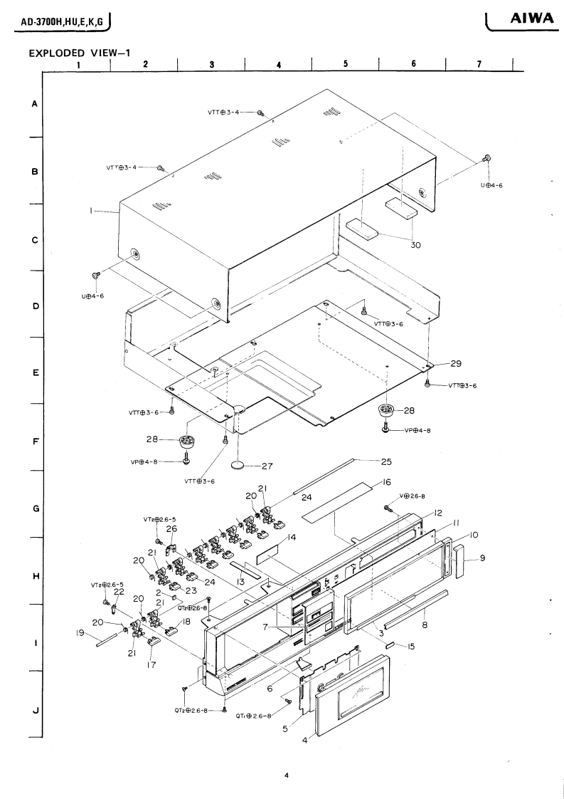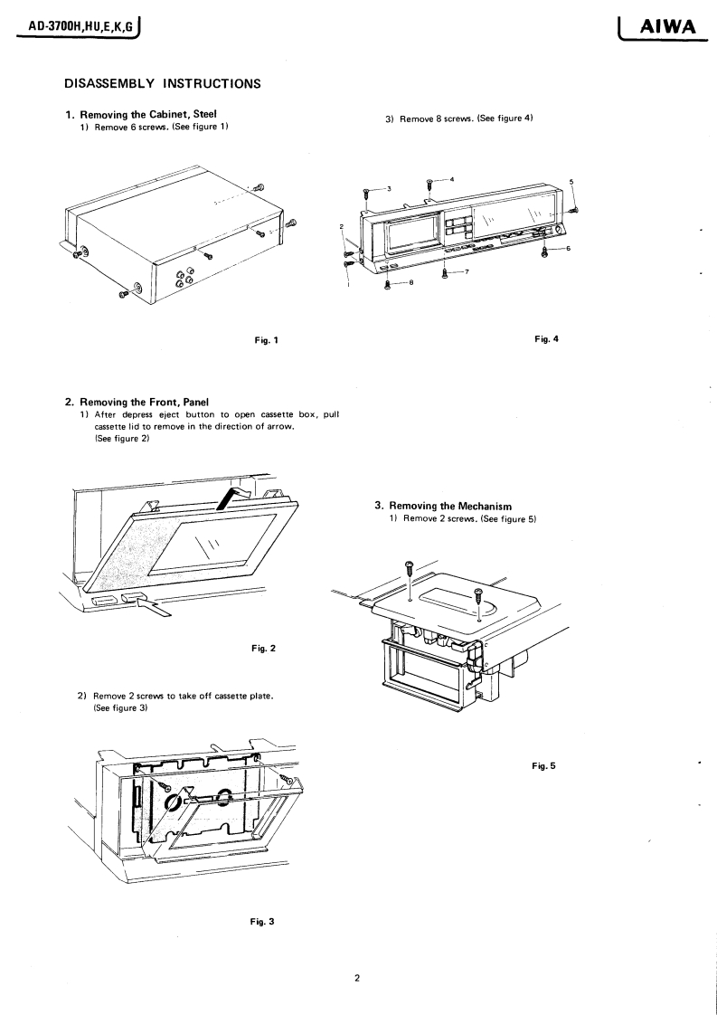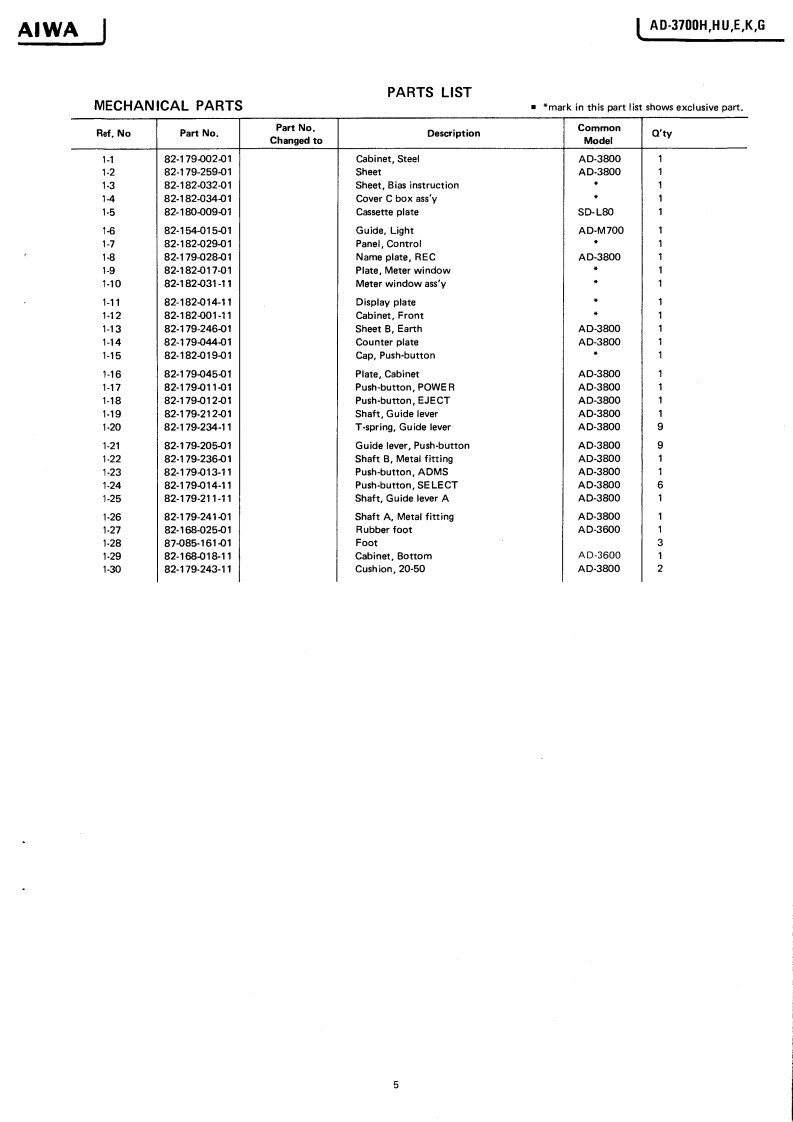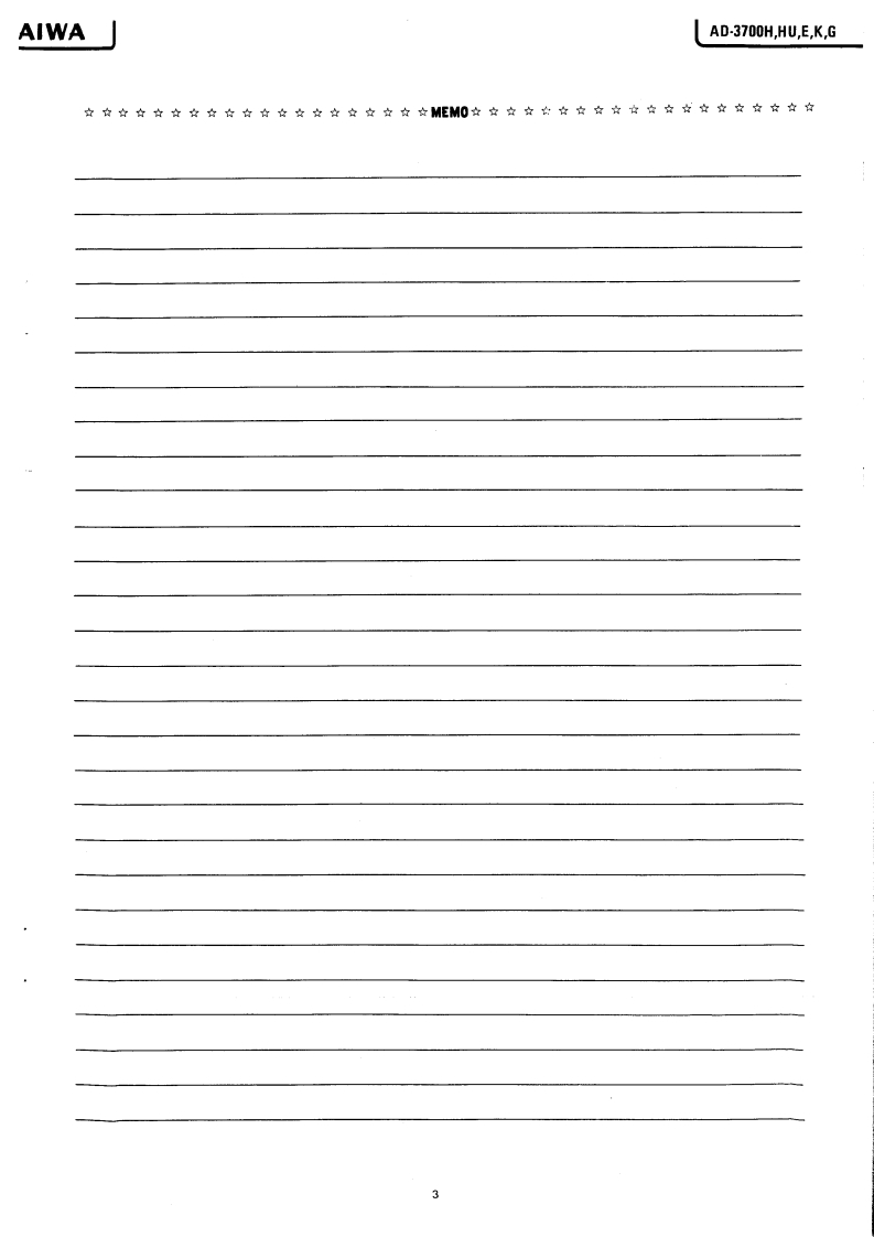 AsSERVICE MANUALMODEL NO.STEREO CASSETTE DECKAD-37▣▣Code No.04-370-000-58TYPE.H,HU,E,K,GDATE OF ISSUE 3/1982SPECIFICATIONSSemiconductors:13 ICs,113 transistors,(WTD-A)More than 62/68 dB75 diodes,13 LED's(METAL,DOLBY NR B-type/C-type)Power supply:H,HU modelMore than 62/68 dBAC120W/220V/240W(CrO,,DOLBY NR B-type/C-type)More than 60/66 dBswitchable 50/60 Hz(LH,DOLBY NR B-type/C-type)EmodelChannel separation:More than 30 dBAC220V,50/60Hz(1 kHz,0 VU)K,G modelCross talk:More than 60 dBAC240V,50/60Hz(1 kHz,0VU)Power consumption:24WErasing ratio:More than 60 dBDimensions:420W)×110(H)×265(D1mm(135Hz,0VU+10dB)Bias frequency:85 kHzWeight:5.1kgFrequency responseMETAL2020.000HzTrack type:4 tracks 2 channelO:20-19,000HzTape speed:4.8cm/s±1.5%Less than 0.028%(WRMS)LH20~17.000HzWow an flutter:Full auto stopMotor:DC Servomotor for capstanAutomatic stop system:motor for reelsAutomatic shut-off action time:Less than 5s.Head:DX head (for Rec/Pb)Inputs:MIC max.sensitivity 0.3 mVPinch roller pressure:T350±30g3.43±0.30N)S180±20g(1.76±020N)(200~10 ks suitable)50±10g-cm(0.49±0.098mN.mjLINE INTake-up torque:max.sensitivity50 mV15o89-6m14788。0,294mN.ml(Optimum loadFF&rewind torque:impedance moreFF&rewind time:70±10s.(C60)than 50 kn)Playback output:730±60mV(LINE)Outputs:LINE OUTStandard level0.55V(0VU1(TTA-161Playback noise:Less than 1.6 mV (CrO,)(Optimum loadLess than 2.0 mV (METAL)impedance moreLess than 2.7 mV (LH)than 50 k)PHONES82Rec./PB output:OVU +60。-40 mV (LINE)distortion:Less than 1.5%(METAL)Less than 1.5%(CrO,Less than 1.5%(LH)Re:./Pb SN ratio:More than 50/54 dB(Unweighted)(METAL,DOLBY NR B-typeOFF/ON).Specifications and external appearance are subjoct to changeMore than 50/54 dBwithout notice due to product improvement.(CrO..DOLBY NR B-typeOFF/ON)Noise reduction system manufactured under license from Dol byMore than 48/52 dBLaboratories Licensing Corporation.(LH,DOLBY NR B-typeDolby and the symbol are trademarks of Dolby LaboratoriesOFF/ON)Licensing Corporation.AIWA Co.,Ltd.Tokyo JapanA