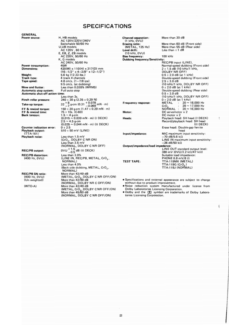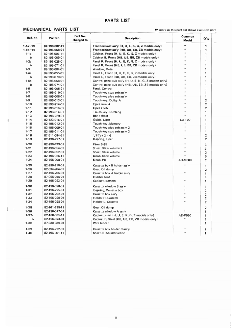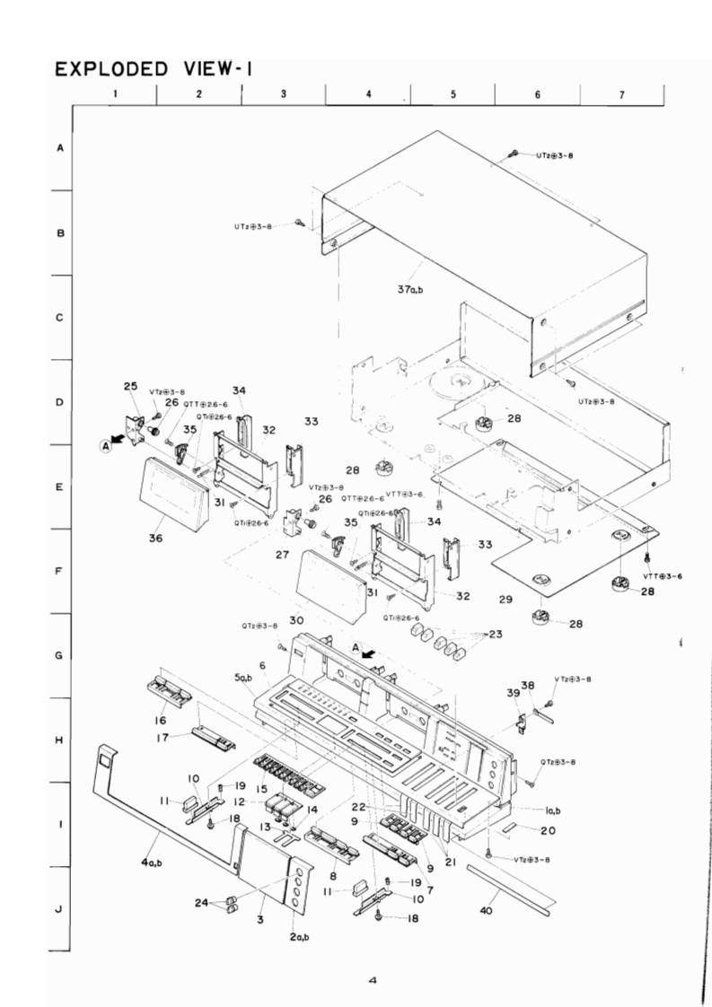 AIWAS/M Code No.83-028DATE OF ISSUE 12/1983SERVICEMANUAL11BA66MODEL NO.STEREO CASSETTEDECKA▣-VX22OTYPE.H,HB,U,UB,E,EB,K,G,Z ZBFollow the instructions carefully,which will allow the user to optimise the products'performanceand give many years of serivce.1.No scratch and melting shall be made to covered lead-wires of an6.General instructions for mechanism repaira.c.primary circuit including mains leads.1)Lubricants been stained the surfaces of transmitting portion2.No illegibility shall be given to the specification plate,the cau-of the belts,idlers,capstan and pinch roller shall be removed.tion labels,the fuse labels and others.because slippery and faulty tape travel shall be caused.3.When,on pattern sides of circuit boards,additional repair-parts2)When oiling.only one or two drops shall be applied so ashave been made up,the parts shall be firmly glued to circuitnot to run over and be dispersed.Note should be taken of theboards or other components,unless the parts can be attachedmetal fitting for the capstan and rotating portionsof thefirmly.3)idlers and pinch roller,especially.4.The following matters shall be maintained as they are.whenE-rings and poly slider washers shall be replaced wih newrepairing.ones,if once those have been removed.-No re-utiization1)Soldering of lead-wire endsdue to unreliability.*Care should be taken of the space distance in an a.c.pri4)Regular spare-parts shall always be used for repair,becausemary circuit as well as soldering.using irregular parts and tampering with the products shall2)Wiring and holding of lead wires with wire-clips and binderscause deterioration.mulfunction and damage.3)Materials of lead-wires"e.g.:For UL models,lead-wires to be used shall be approved or accepted by the UL.4)Location of all kinds of insulators5)Setting of voltage selector switch"Set the Voltage Selector Switch to 240V,220V,or 120V,According to your Local Voltage.5.After repaired,the insulation resistance or leakage current shallbe measured with 500 5V D.C and shall be not less than 1MS.Measuring PointConnect to Chasses or Outside of Pn JackRating More than IM2/500V DCPnca(日》Chassis()AC Power Cord(+】