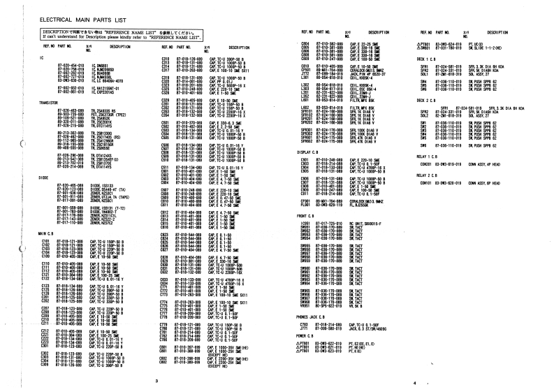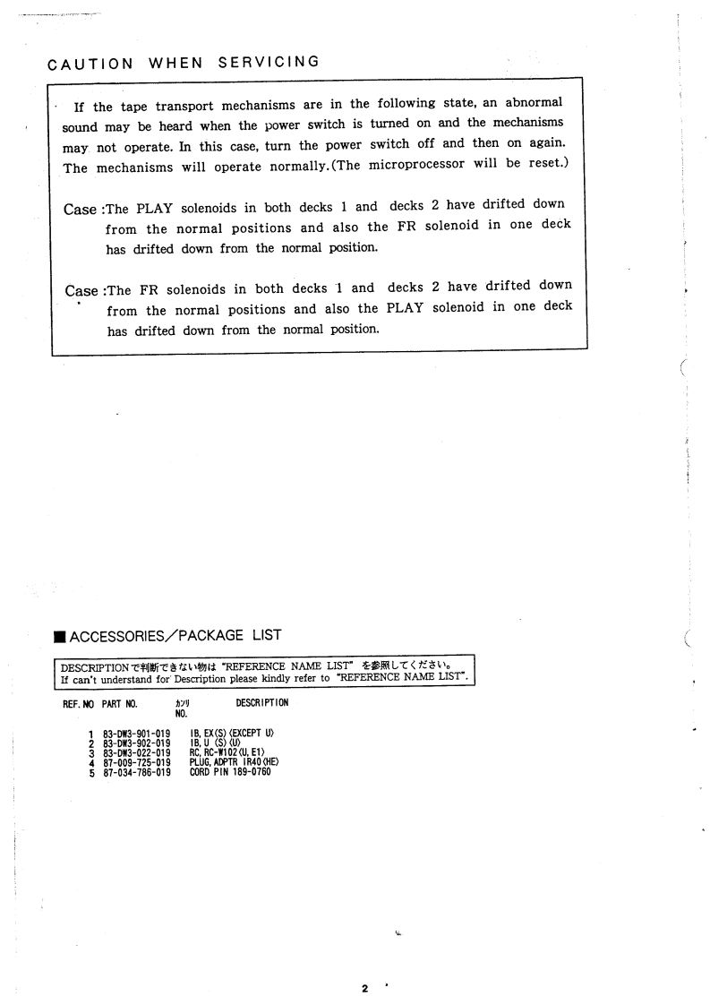 auaaiwaSERVIC正AD-WX727STEREO CASSETTE DECK·BASIC TAPE MECHANISM2ZM-1 P3N(D1)TYPE.HE.U.EE.E.E1.K2ZM-1 R3N(D2)REVISION PUBLISHINGSPECIFICATIONSTypeStereo cassette tape deckRecording systemAC biasTrack format4 tracks,2 channelsErasure systemAC erasePowerrequirementsAD-WX727HEMotorDC motor×2AC 110-120V/220-240V switchable,50Hz/60HzPlayback/recording head Permalloy headAD-WX727E,E1,EEAC 230V.50HzErasure headDouble gap Ferrite headAD-WX727KAC230-240V.50HzInputREC/LINE IN:100 mVAD-WX727U(input impedance 47 kQ,0 d3)*AC 120V,60HzOutputPLAY/LINE OUT:510 mV (0 dB)Power consumption18WOptimum load impedance 47 k orm0Frequency responseMetal tape:20-18,000Hz-20dB Rocording)PHONES:0.25 mW (oad impedance322,0dB)CrO:tape:20-17.000Hz(-20dB Recording)Outer dimensions(WXH×D)Normal tape 20-16,000Hz(-20 dB Recording】(1x55e 12 Te in)HOIANaSSignaHto-noise ratio 78 dB(Dolby C NR ON above 5 kHz,Weight4.9kg(10.81bs.)metal tape,peak level)Wow and flutter0.09%(WRMS)*The "0 VU"of this unit is indicated as "-4 dB"on thelevel meter.Design and specifications are subject to change withoutnoticeNoise reduction system manufactured under license fromDolby Laboratories Licensing Corporation"Dolby",the double-D symbol are tradenarks of DolbyLaboratories Licensing Corporation.S/M Code No.09-946-058-00l