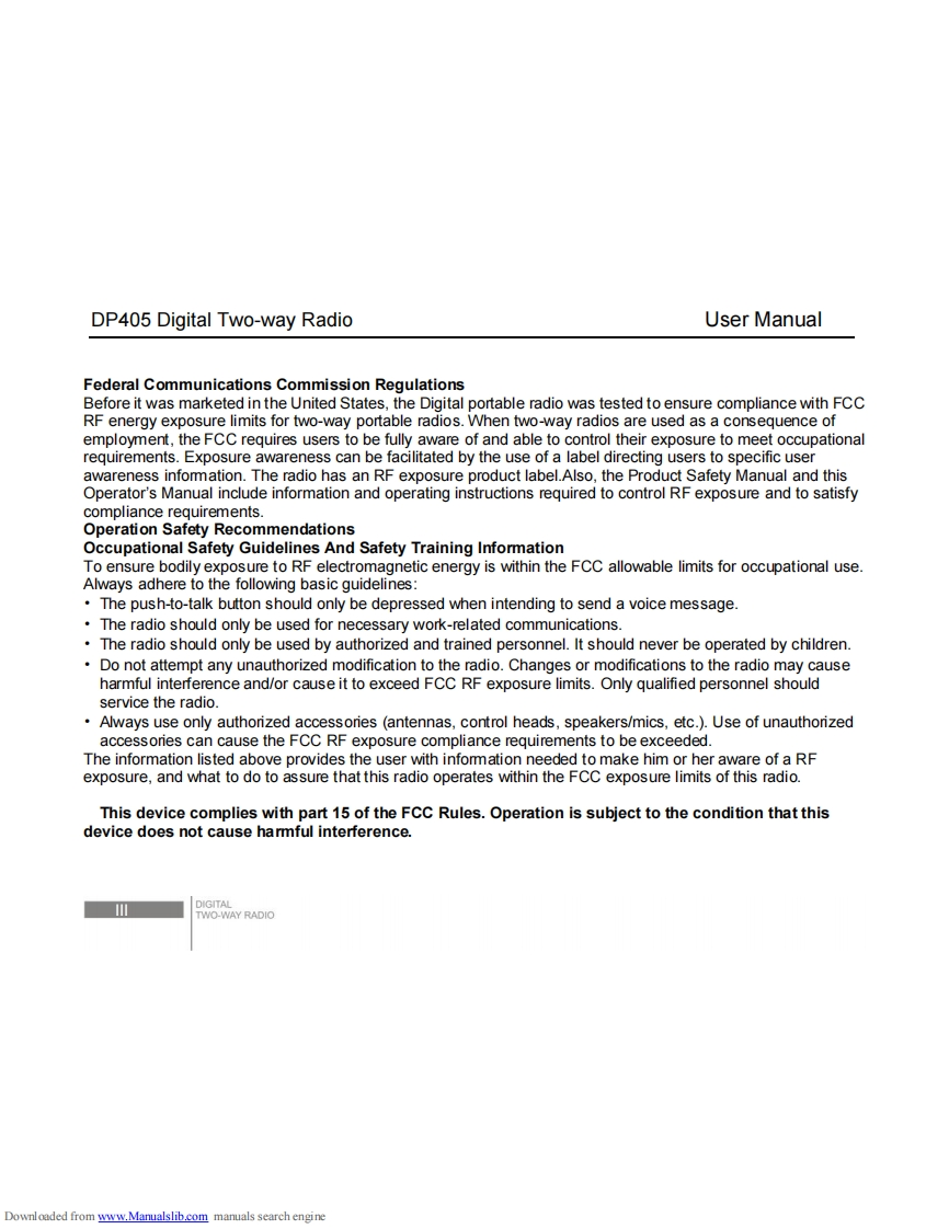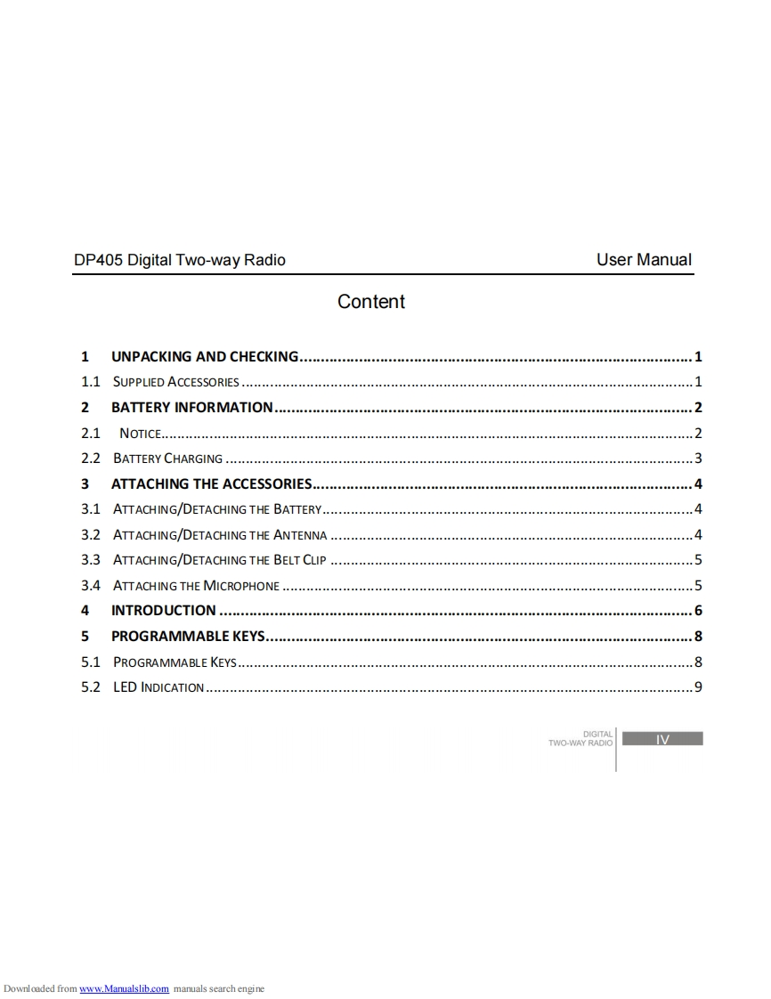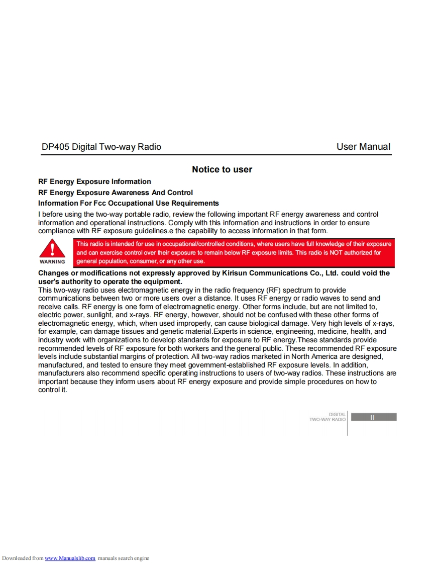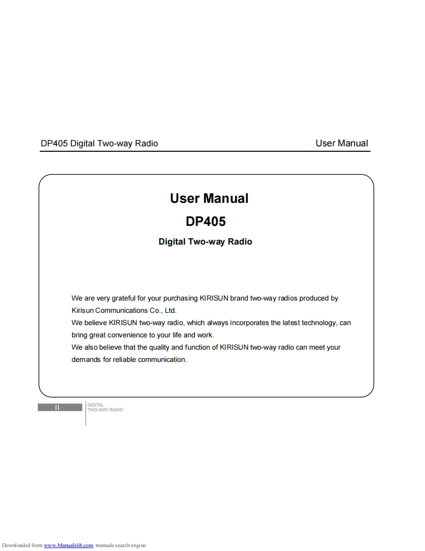 dp405_操作说明书手册找手册网30天前发布关注私信1.09MB24页036dp405_操作说明书手册此内容为付费资源,请付费后查看¥19¥21黄金会员免费钻石会员免费登录购买付费资源 第1页 / 共24页 第2页 / 共24页 第3页 / 共24页 第4页 / 共24页 第5页 / 共24页 试读已结束,还剩19页,您可下载完整版后进行离线阅读 THE END科立讯 文本预览 un1.11a..1-1-1INSTRUCTION MANUALDP405Digital Two-way Radio1100“11-■DIGITALhttp://en.kirisun.comDownloaded from www.Manualslib.com manuals search engine 查看更多 收起部分 喜欢就支持一下吧收藏