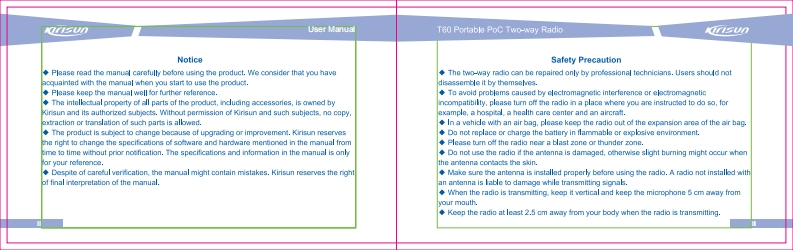 T60-用户操作说明书手册找手册网29天前发布关注私信4.99MB19页043T60-用户操作说明书手册此内容为付费资源,请付费后查看¥19¥21黄金会员免费钻石会员免费登录购买付费资源 第1页 / 共19页 第2页 / 共19页 第3页 / 共19页 第4页 / 共19页 第5页 / 共19页 试读已结束,还剩14页,您可下载完整版后进行离线阅读 THE END科立讯 文本预览 KrISUnUser ManualT60 Portable PoC Two-way RadiorisunKirisun Cemmunieation Co Ltdhttp:Nan.kirisun.comKirisun Communication Co.,Ltd. 查看更多 收起部分 喜欢就支持一下吧收藏