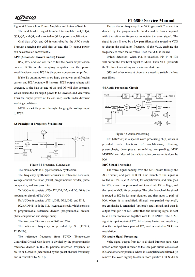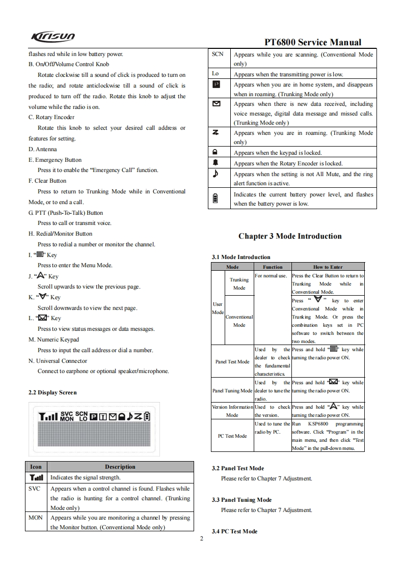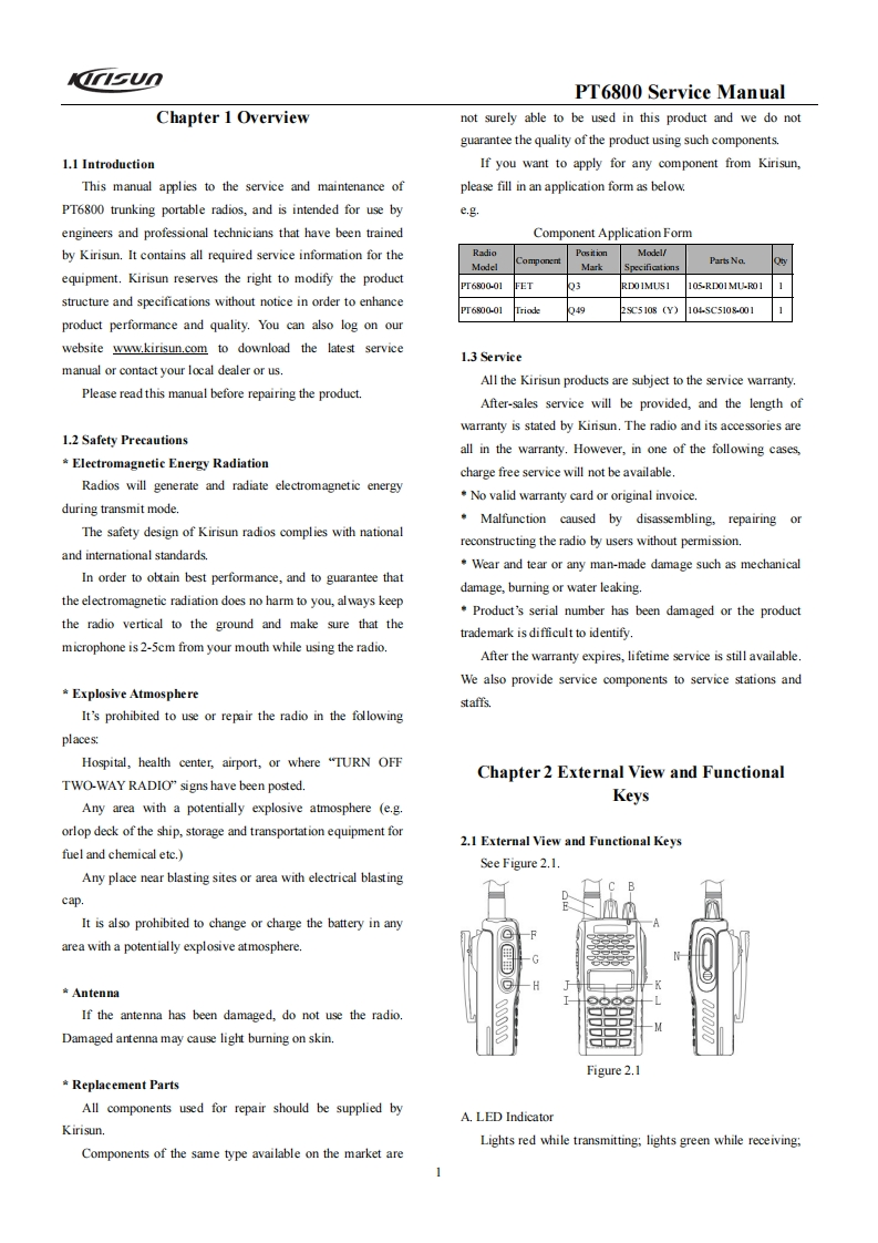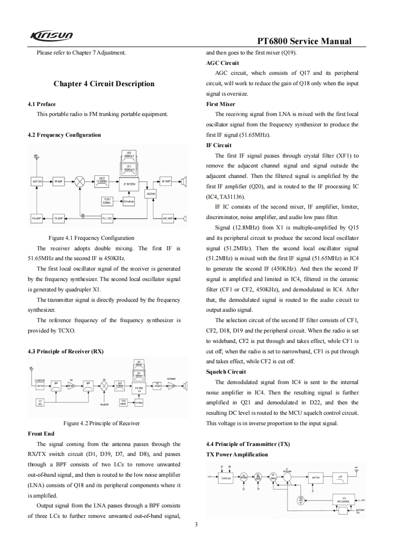 KrsunPT6800 Service ManualDangerous!ContentsDo not connect the AC power or DC power over 8.6V withChapterany connector or terminal of the radio.Otherwise it will causeChapter 2 Extemal View and Functional Keys.Ifire,electric shock or damage to the radio.Chapter 3 ModeChapter 4 Circuit Description........3Chapter 5 Function Description and Parameter Setting.....8Warning!Chapter 6 Disassembly for Repair..10Chapter7 Adjustment….12Do not reverse power connection.Chapter 8 Spec ifications...16It may cause harm to the radio if signal input on the antennaChapter 9 Servicing and Testing Equipment.....connector is larger than 20 dBm (100mW).Chapter 10Do not turn on the radio before the antenna or loadAppendix I Abbreviations.connection is completed.Appendix 2 Electronic PartsIf the antenna has been damaged,do not use the radio.Appendix 3 Structural Parts List.23Damaged antenna may cause light burning on skin.Appendix 4 Accessories.24Though the radio is waterproof;it's better to avoid putting itFigure 1 PT6800 Block Diagram25in rain or snow,or any other liquid to ensure its life andFigure 2 PT6800 Main Board Schematic Circuit Diagram......26performance.Figure 3PT6800 Main Board Top Layer Position Mark Diagram7Figure 4 PT6800 Main Board Bottom Layer Position Mark Diagram..........28Figure 5PT6800 Main Board Top Layer Position Value Diagram9Statement!Figure 6 PT6800 Main Board Bottom Layer Position Value Diagram.....30Figure 7PT6800 Key Board Schematic Circuit Diagram.3Kirisun Electronics(Shenzhen)Co.,Ltd owns the copyrightFigure 8 PT6800 Key Board Top Layer Position Mark Diagram.32of KSP6800 software.Figure 9 PT6800 Key Board Bottom Layer Position Mark Diagram....33Unauthorized duplication of KSP6800 software is strictlyFigure 10 PT6800 Key Board Top Layer Position Value Diagram.....34prohibited.Figure 11 PT6800 Key Board Bottom Layer Position Value Diagram..35Kirisun Electronics(Shenzhen)Co.,Ltd owns the copyrightFigure 12 PT6800 PTT Board Schematic Circuit Diagramof the MCU software.Figure 13 PT6800 PTT Board Top Layer Position Mark Diagram....37Kirisun Electronics(Shenzhen)Co.,Ltd owns the copyrightFigure 14 PT6800 PTT Board Bottom Layer Position Mark Diagram.......37of the radio outward appearance/structure/circuit design.Figure 15 KB-36C Schematic Circuit Diagram38Kirisun Electronics(Shenzhen)Co.,Ltd owns the copyrightFigure 16 KBC-60Q Schematic Circuit Diagram9of this service manual.Unauthorized publication is prohibited.Figure 17 PCB Layout 1...40Kirisun Electronics (Shenzhen)Co.,Ltd owns theFigure 18 PCB Layout 2..41trademarks“KIRISUN",Unn,and“科立讯”.