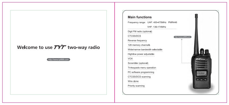 To customersThank you very much for using our two-way radio.This radio of modem design is a reasonable structurewith stable functions.It is designed to meet differentcustomers'need for high quality with easy operationand perfect capacity.We beleve you are pleased withts shape and multi-function.This manual is suitable for using the model of TH-446.