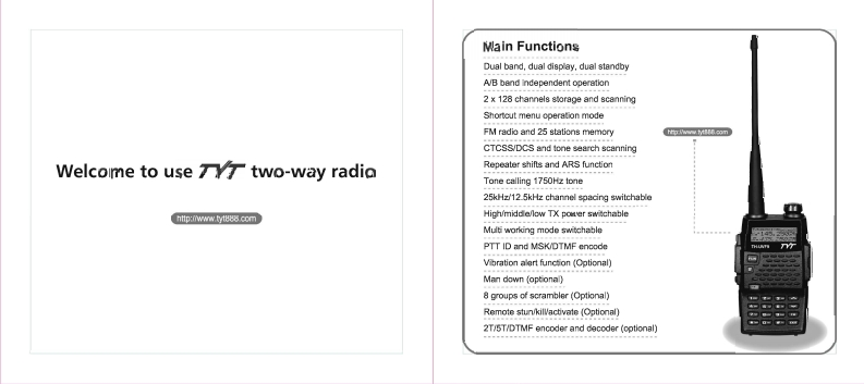 TO CUSTOMERSThank you very much for using our two way radioThis radio of modem design is reasonable structurewith stable functions.It is designed to meet differentoustomers'need for high quality with easy operationand perfect capablity.We believe you are pleased withits nice shape and excellent performance.This manual is sutable for using the model of TH-UVF9.
