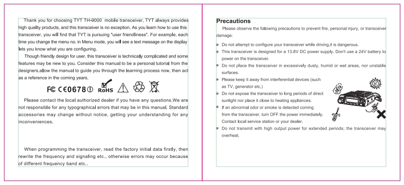 To customersThank you very much for using two-way radios.This product has a newly developed function menuand humanism operation design,making it easy to use.It will meet your requirement by the compact size andreasonable price.