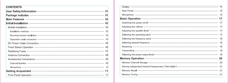 TH-9800 User ManualThank you vary much for choosing the TH-S00 quad band mobil tansceiver.The TH-9800 provides you with a relable,dear and ofciont communicaors sorvice which inenhanced by an erponomic design and intuitive user controls.Inherentty reliable you can depend on your TH-B600 no matier where you are in the harshMren单nrlThe TH-9800 is cost-otlectve.muls-functional and will moet al of your HF/VHFUHF bandcommunication needs no mater what the situation.For a ful explnsion of the many features.funcions and the care free maimenance of yournew mobile plere take the time to read the user manual endosed with your transceiver.