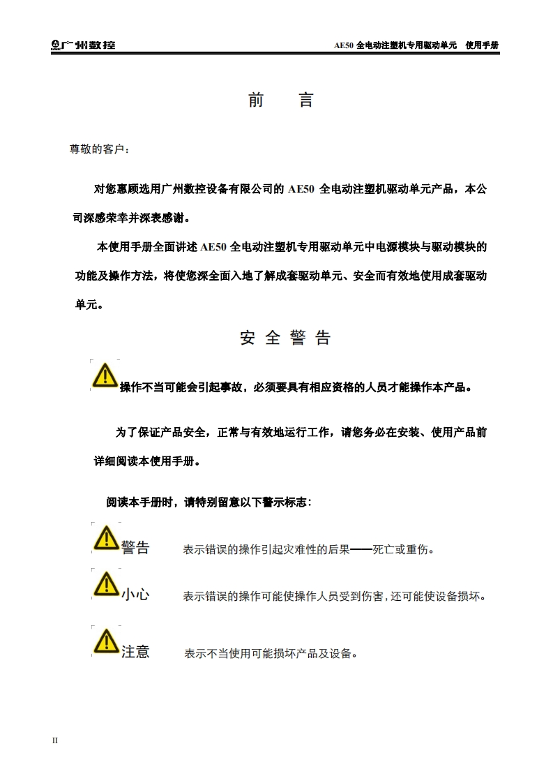 公G5装使用手册G59AE-50全电动注塑机专用驱动单元W州敏控受备有银公司GSK CNC EOUIPMENT CO..LTO.Http:(/www.osk.com.cn E-mail:sale1gsk.com.cn公可地量:厂州有意岗区观达路2号邮编:510530销业务:(020)8199329J01993250199081901983%0J(FAX】售后里务:(020)320210473202183202103(FAX1(020)®369288《热线,一号多线务)找术支持,1020)82260259州8019格有中心:[020)81995622内容可能因产丛支变面政生,积不另行通如2018年了刀毫2管21率丁月无1次印别中国·广州HTTP:JWWW GSK.COM.CN E-MAJLSALET@GSK.COM.CN「州敏座设备有眼公司GSK CNC EQUIPMENT CO..LTD.