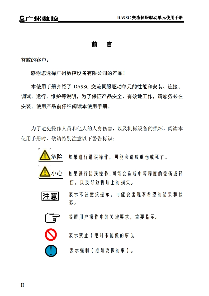 DA98C驱动使用手册2019年1月第1版定找手册网4小时前发布关注私信6.32MB116页044DA98C驱动使用手册2019年1月第1版定此内容为付费资源,请付费后查看¥29¥31黄金会员免费钻石会员免费立即购买您当前未登录!建议登陆后购买,可保存购买订单付费资源 第1页 / 共116页 第2页 / 共116页 第3页 / 共116页 第4页 / 共116页 第5页 / 共116页 第6页 / 共116页 第7页 / 共116页 第8页 / 共116页 第9页 / 共116页 第10页 / 共116页 试读已结束,还剩106页,您可下载完整版后进行离线阅读 THE END广州数控 文本预览 在本使用手册中,我们将尽力叙述各种与该交流伺服驱动单元操作相关的事项。限于篇幅限制及产品具体使用等原因,不可能对伺服驱动单元中所有不必做或不能做的操作进行详细的叙述。因此,本使用手册中没有特别指明的事项均视为“不可能”或“不允许”进行的操作。本使用手册的版权,归广州数控设备有限公司所有,任何单位与个人进行出版或复印均属于非法行为,广州数控设备有限公司将保留追究其法律责任的权利。 查看更多 收起部分 喜欢就支持一下吧收藏