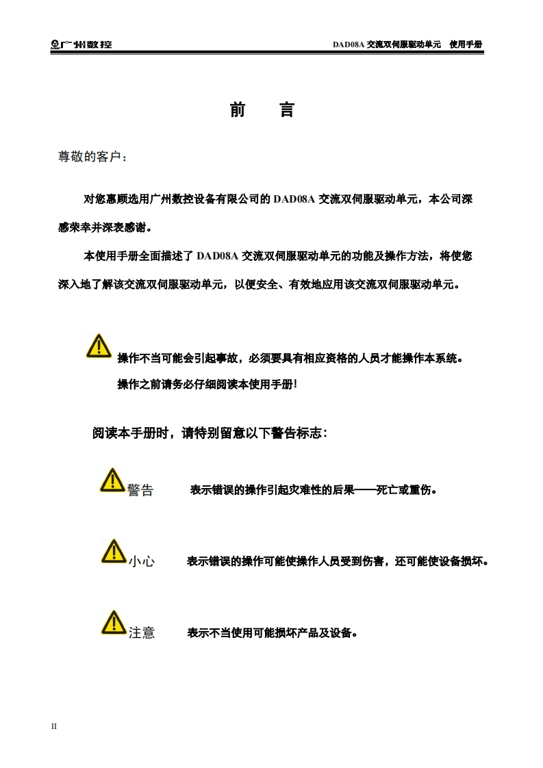 DAD08A交流双伺服驱动单元使用手册2020年10月第3版27定找手册网4小时前发布关注私信2.25MB62页020DAD08A交流双伺服驱动单元使用手册2020年10月第3版27定此内容为付费资源,请付费后查看¥29¥31黄金会员免费钻石会员免费立即购买您当前未登录!建议登陆后购买,可保存购买订单付费资源 第1页 / 共62页 第2页 / 共62页 第3页 / 共62页 第4页 / 共62页 第5页 / 共62页 第6页 / 共62页 第7页 / 共62页 第8页 / 共62页 第9页 / 共62页 第10页 / 共62页 试读已结束,还剩52页,您可下载完整版后进行离线阅读 THE END广州数控 文本预览 在本使用手册中,我们将尽力叙述各种与DAD08A交流双伺服驱动单元相关的事项。限于篇幅限制及产品具体使用等原因,不可能对本产品中所有不必做或不能做的操作进行详尽的叙述。因此,本使用手册中没有特别指明的事项均视为“不可能”或“不允许”进行的操作。举本使用手册的版权,归广州数控设备有限公司所有,任何单位与个人进行出版或复印均属于非法行为,广州数控设备有限公司将保留追究其法律责任的权利。 查看更多 收起部分 喜欢就支持一下吧收藏