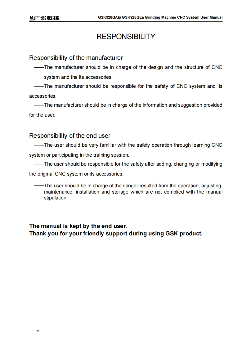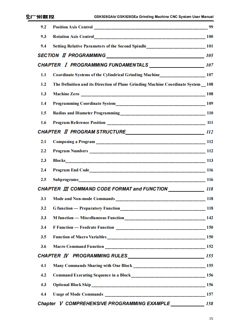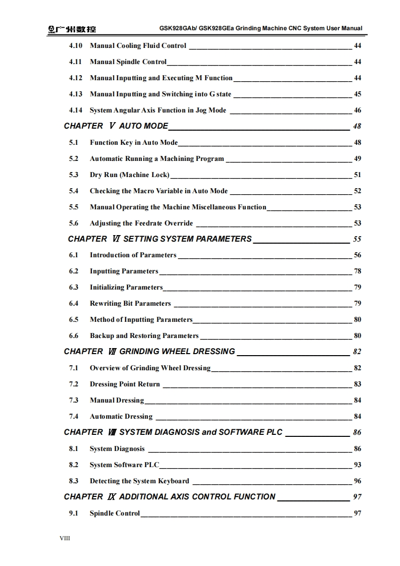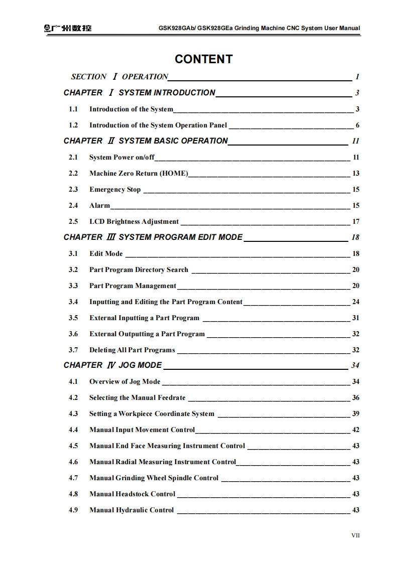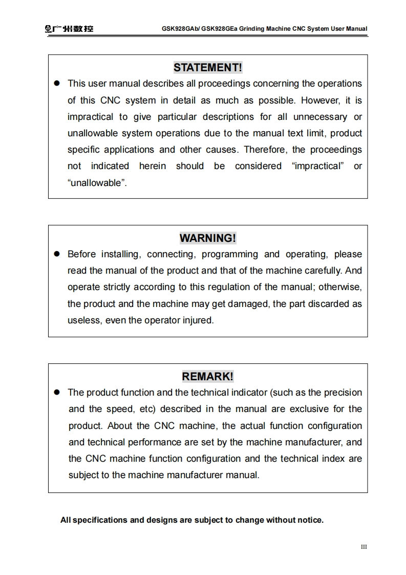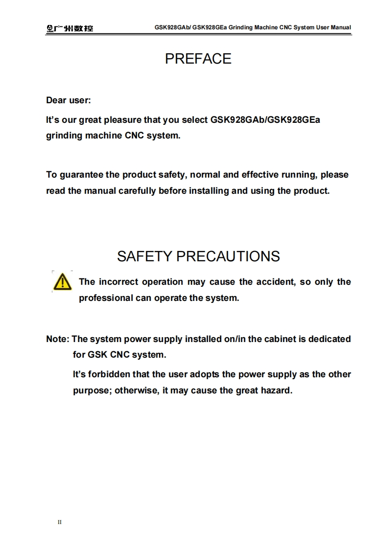 产州敬控GSK928GAb/GSK928GEa Grinding Machine CNC System User ManualThis user manual describes all proceedings concerning theoperations of this CNC system in detail as much as possible.However,it is impractical to give particular descriptions for all unnecessary orunallowable system operations due to the manual text limit,productspecific applications and other causes.Therefore,the proceedings notindicated herein should be considered "impractical"or "unallowable".The copyright of the user manual is owned by GSK CNCEquipment Co.,Ltd(Hereinafter referred to as GSK).It is against thelaw for any organization or individual to reproduce this manual in anyform without the permission of GSK and GSK reserves the right toinvestigate its law duty.