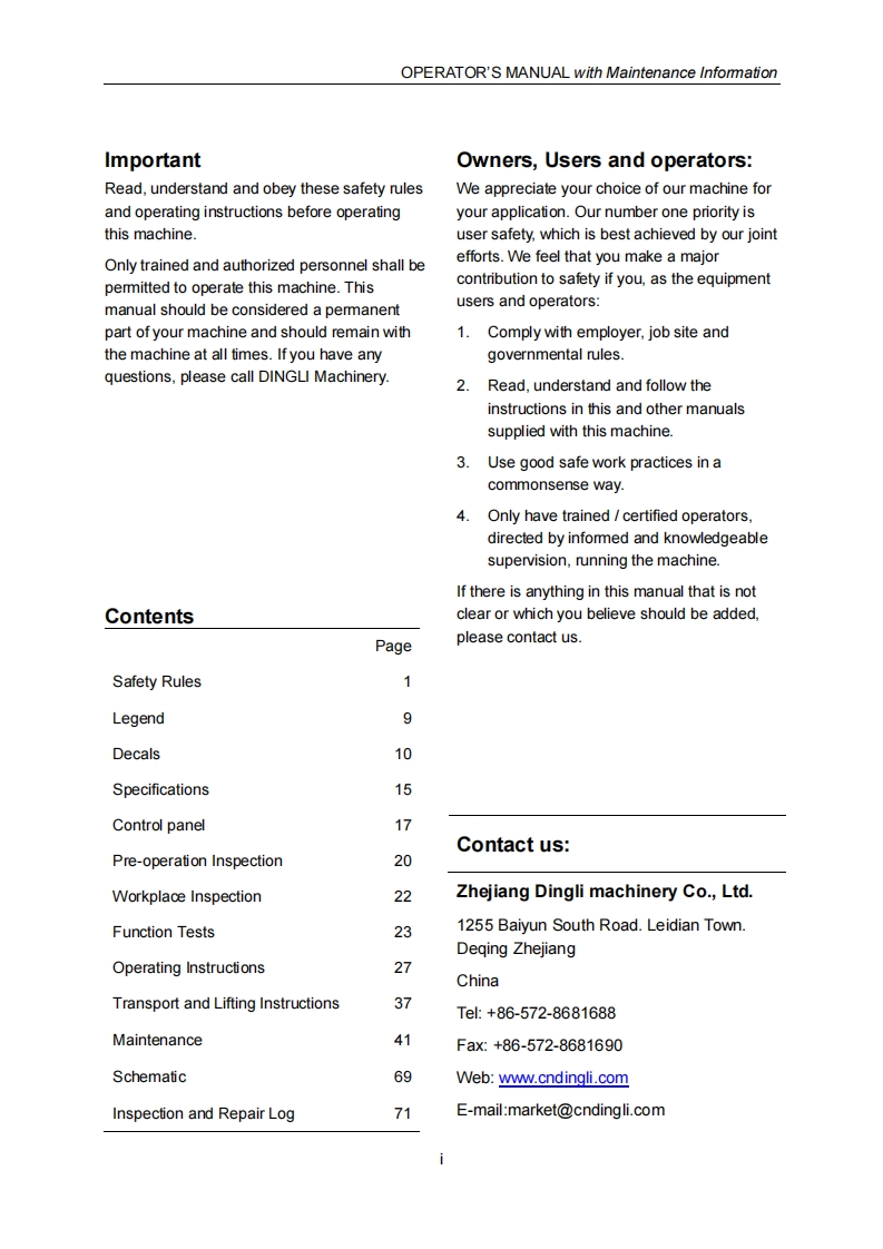 SELF-PROPELLED SCISSOR LIFTSOPERATOR'S MANUALwith Maintenance InformationS06-E/S06-EC(Series 3)E-Tech S06-EA1mWARNINGTHE MANU FACTURER SHALL NOT BE HELD LIABLE IN CASE OF FAULTSOR ACC IDEN TS DUE TO NEGLIGENCE,INCAPACITY,INSTALLATION BYUNQUALIFIED TECH NICIANS AN D IMPROPER USE OF THE MACHINEDO NOT OPERATE THIS MACH INE UNTIL YOU READ AND UNDERSTANDALL THE DAN GERS,W ARNIN GS AND CAUTIONS IN THIS MANUALPart Number:SM0110113Zhejiang Dingli machinery Co.,Ltd.2013-08