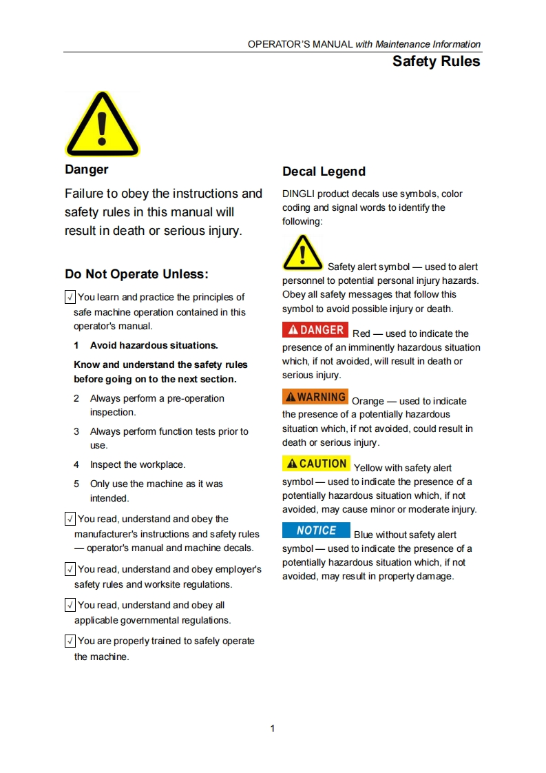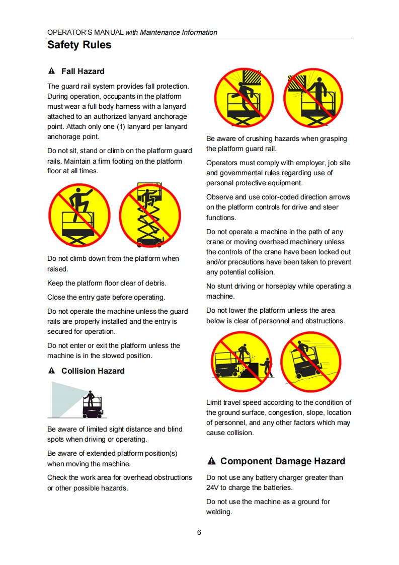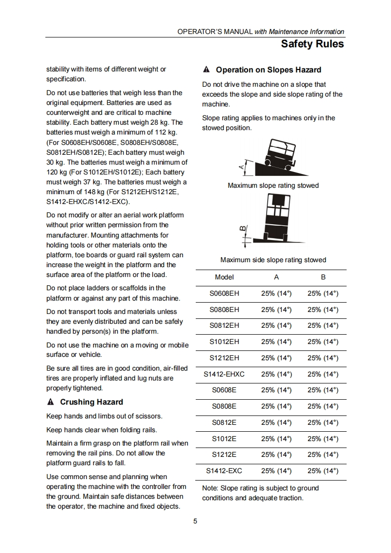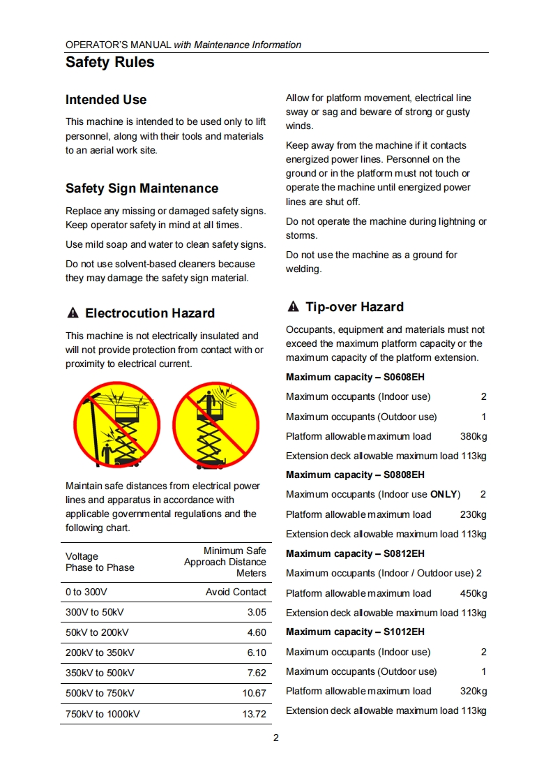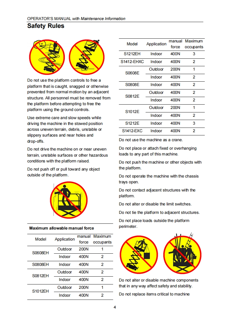 SELF-PROPELLED SCISSOR LIFTSOPERATOR'S MANUALwith Maintenance InformationFor S0608EH/S0808EH/S0812EH/S1012EH/S1212EH/S1412-EHXCForS0608E/S0808E/S0812E/S1012ES1212E/S1412-EXCHydraulic Motor /DC Motor DriveWARNINGTHE MANUF ACTURER SHALL NOT BE HELD LIABLE IN CASE OF FAULTSOR ACCIDENTS DUE TO NEGLIGENCE,INCAPACITY,INSTALLATIONBYUNQUALIFIED TECHNICIANS AND IMPROPER USE OF THE MACHINEDO NOT OPERATE THIS MACHINE UNTIL YOUREAD AND UNDERSTANDALL THE DANGERS,WARNINGS AND CAUTIONS IN THIS MANUALPart Number:SM0110111A Rev4.0CEZhejiang Dingli Machinery Co.,Ltd.Fourth Edition,October 2018 Printing