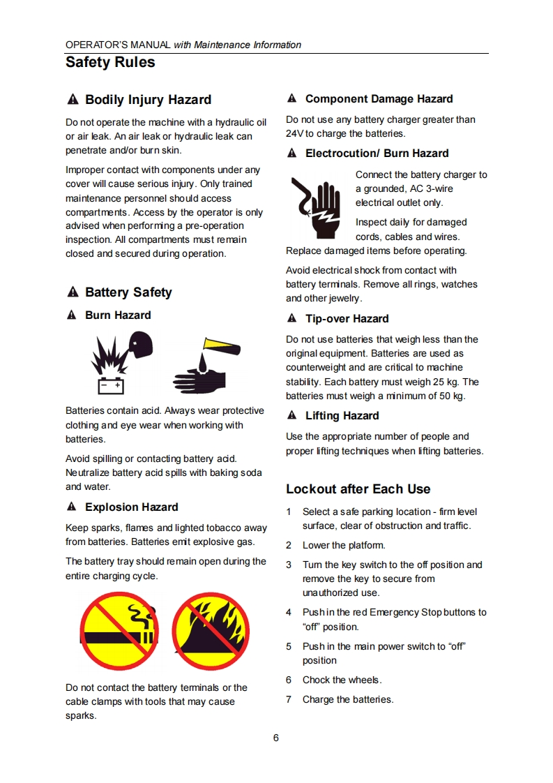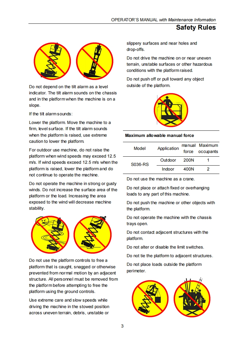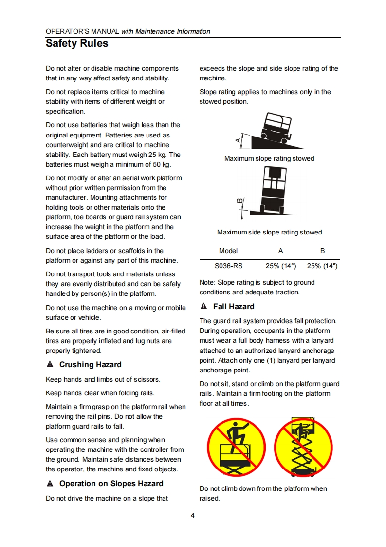 SELF-PROPELLED SCISSOR LIFTSOPERATOR'S MANUALwith Maintenance Information(For S036-RS)A四WARNINGTHE MANUFACTURER SHALL NOT BE HELD LIABLE INCASE OF FAULTSOR ACCIDENTS DUE TO NEGUGENCE,INCAPACITY,INSTALLATION BYUNQUALIFIED TEC HNIC IANS AND IMPROPER USE OF THE MACHINEDO NOT OPERATE THIS MACHINE UNTIL YOU READ AND UNDERSTANDALL THE DANGER S,WARNINGS AND CAUTIONS IN THIS MANUALPart Number:SM0115111A Rev2.2CEZhejiang Dingli Machinery Co.,Ltd.Second Edition,September 2018 Printing