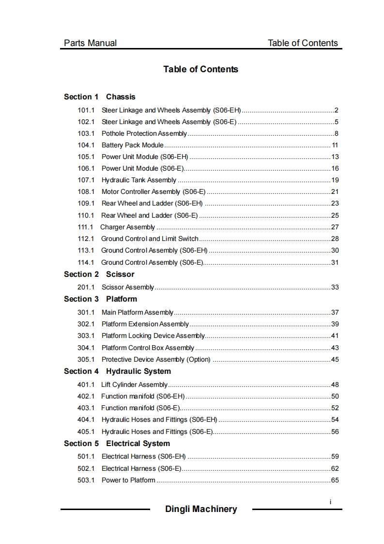 SELF-PROPELLED SCISSOR LIFTSPARTS MANUAL(S06-EH/S06-E)(Series 3)A四WARNING6誉2DO NOT OPERATE THIS MACHINE UNTIL YOU READ AND UNDERSTANDALL THE DANGERS,WARN IN GS AND CAUTIONS IN THIS MANUALPart Number:SM0117229A Rev1.0Zhejiang Dingli Machinery Co.,Ltd.First Edition,August 2018 Printing