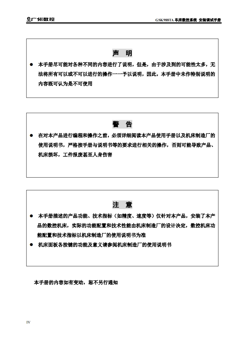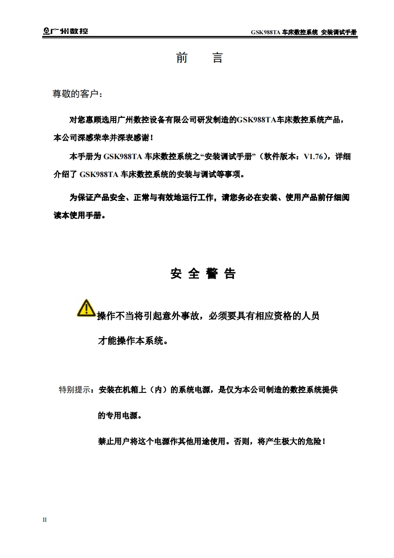GSK988TA安装调试手册2020年5月第5版定06找手册网5小时前发布关注私信15.11MB336页042GSK988TA安装调试手册2020年5月第5版定06此内容为付费资源,请付费后查看¥29¥31黄金会员免费钻石会员免费立即购买您当前未登录!建议登陆后购买,可保存购买订单付费资源 第1页 / 共336页 第2页 / 共336页 第3页 / 共336页 第4页 / 共336页 第5页 / 共336页 第6页 / 共336页 第7页 / 共336页 第8页 / 共336页 第9页 / 共336页 第10页 / 共336页 试读已结束,还剩326页,您可下载完整版后进行离线阅读 THE END广州数控 文本预览 L在本手册中,我们将尽力叙述各种与广州数控设备有限公司研发制造的GSK988TA车床数控系统操作相关的事项。限于篇幅限制及产品具体使用等原因,不可能对此系列数控系统中所有不必做和/或不能做的操作进行详细的叙述。因此,本使用手册中没有特别指明的事项均视为“不可能”或“不允许”进行的操作。半本手册的版权,归广州数控设备有限公司所有,任何单位与个人进行出版或复印均属于非法行为,广州数控设备有限公司将保留追究其法律责任的权利。1 查看更多 收起部分 喜欢就支持一下吧收藏