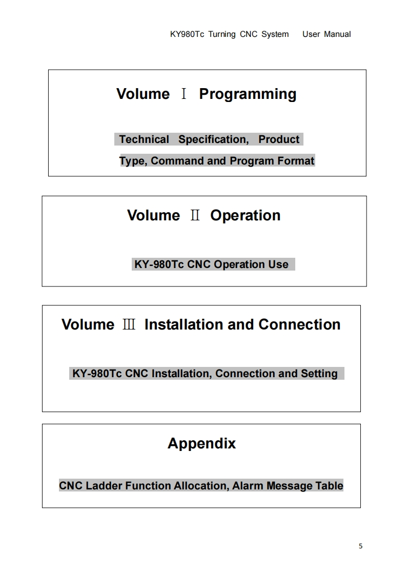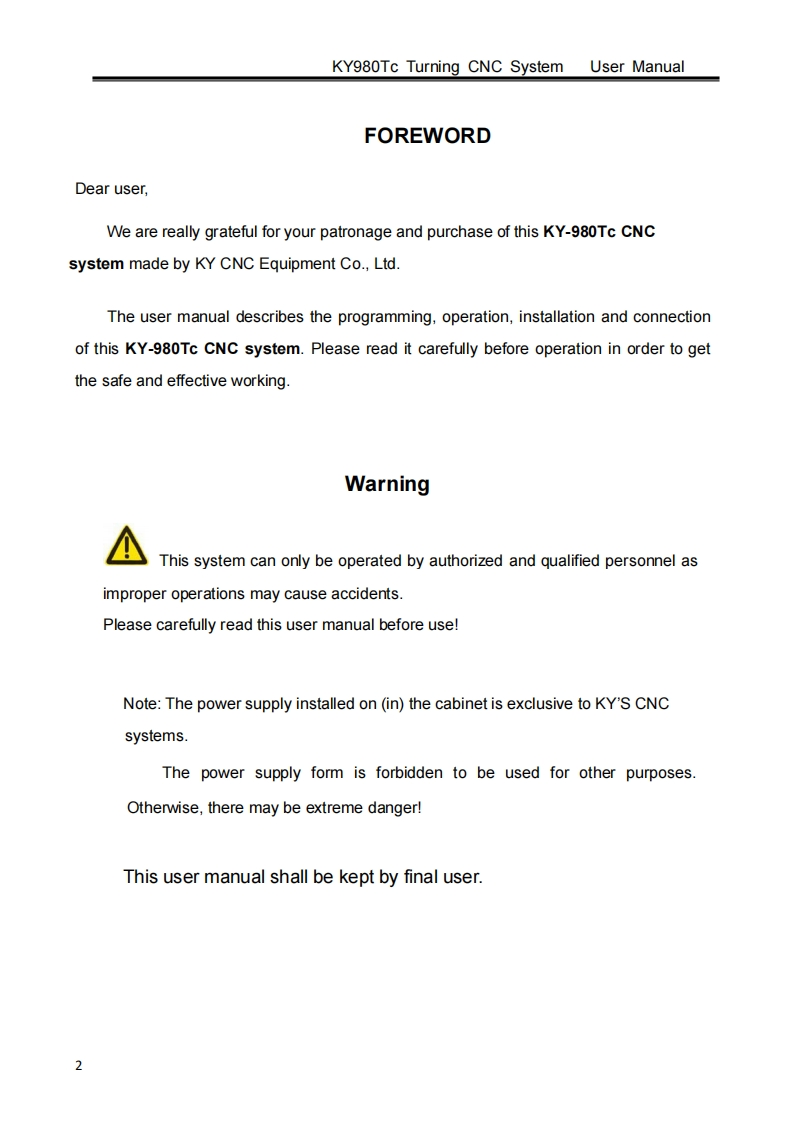 This user manual describes all items concerning the operation ofthe system in detail as much as possible.However,it is impractical to giveparticular descriptions of all unnecessary and/or unavailable operationsof the system due to the manual content limit,pstract specific operationsand other causes.Therefore,the operations not specified hereinshall be considered impossible or unallowable.kThis user manual is the property of KY980Tc CNC EquipmentCo.,Ltd.All rights are reserved.It is against the law for any organizationor individual to publish or reprint this manual without the express writtenpermission of KY980Tc and the latter reserves the right to ascertain theirlegal liability.