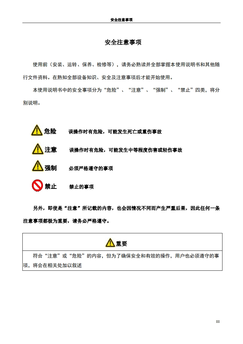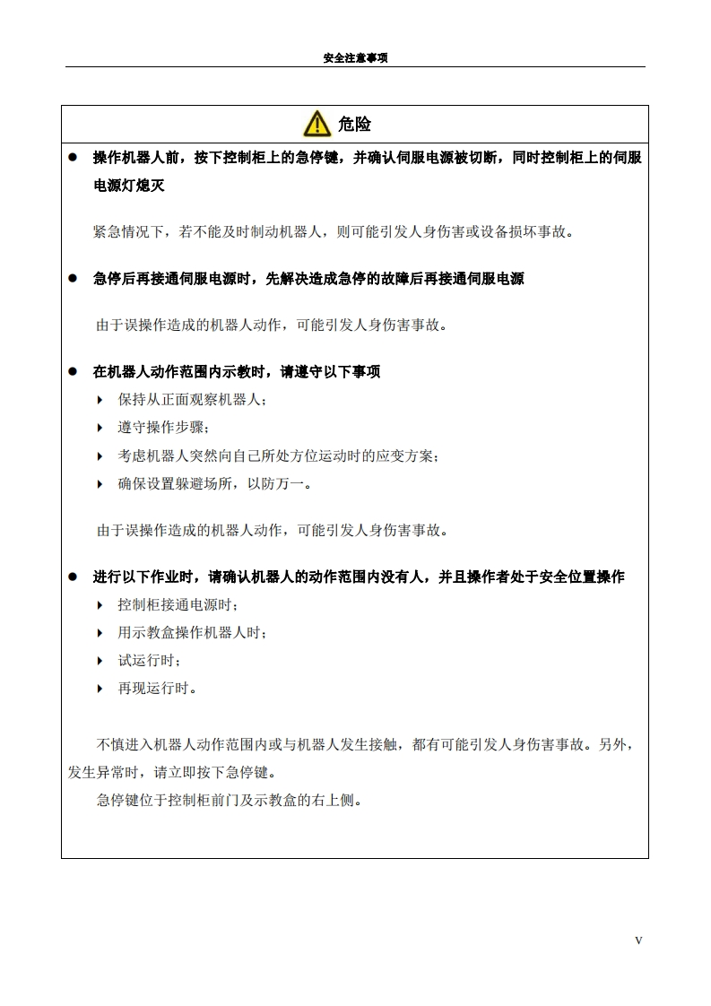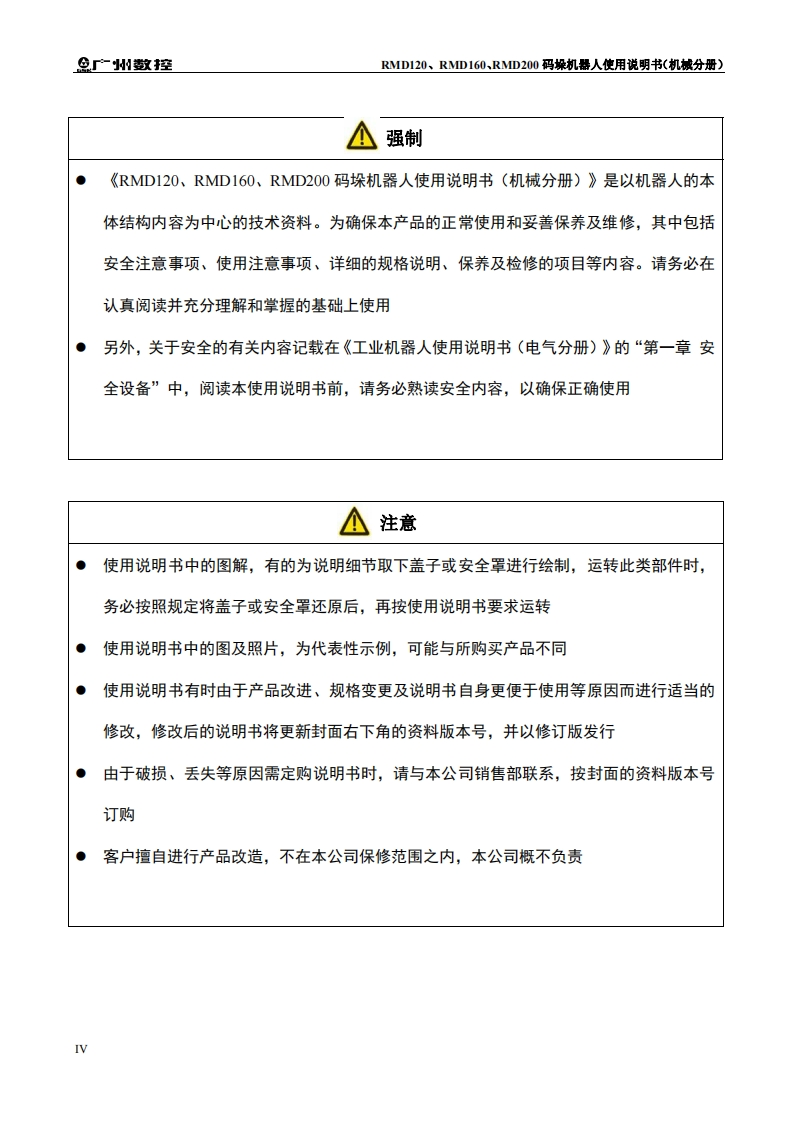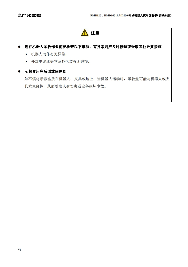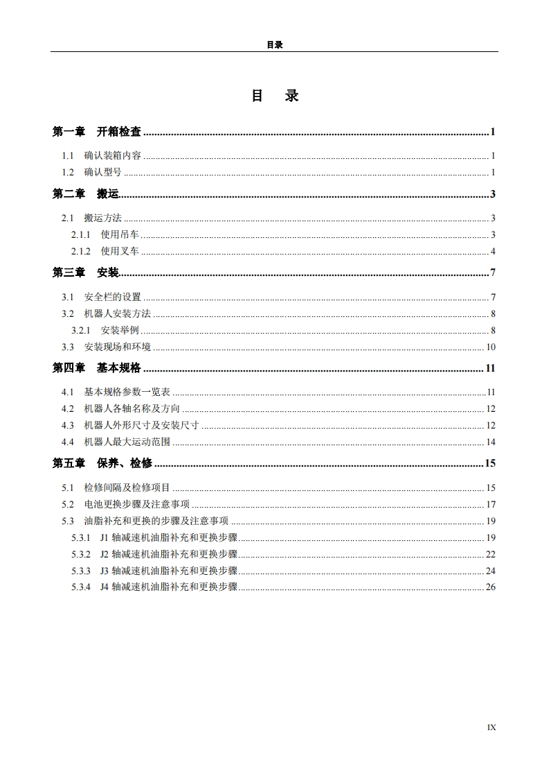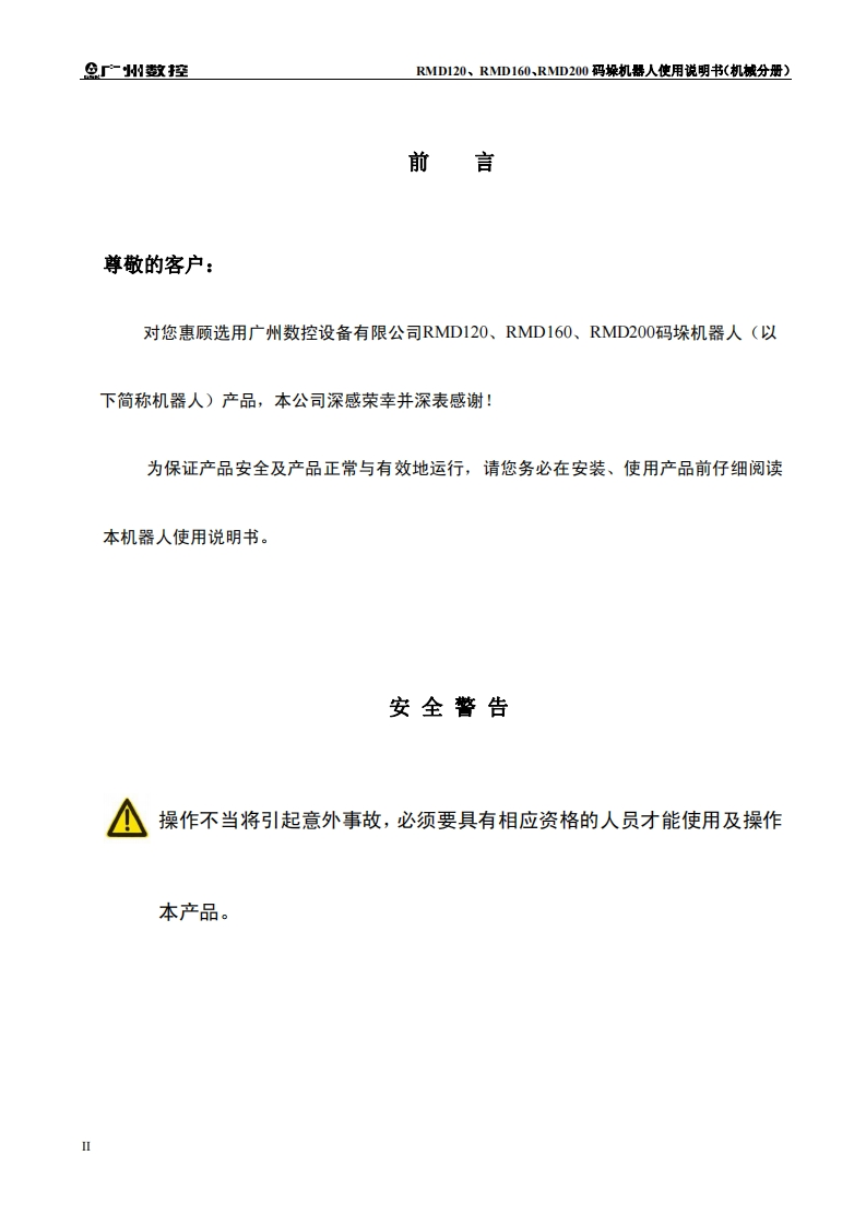 RMD120_RMD160_RMD200机器人说明书(机械分册)2019年3月第1版样找手册网1小时前发布关注私信1.93MB38页046RMD120_RMD160_RMD200机器人说明书(机械分册)2019年3月第1版样此内容为付费资源,请付费后查看¥29¥31黄金会员免费钻石会员免费立即购买您当前未登录!建议登陆后购买,可保存购买订单付费资源 第1页 / 共38页 第2页 / 共38页 第3页 / 共38页 第4页 / 共38页 第5页 / 共38页 第6页 / 共38页 第7页 / 共38页 第8页 / 共38页 第9页 / 共38页 第10页 / 共38页 试读已结束,还剩28页,您可下载完整版后进行离线阅读 THE END广州数控 文本预览 半在本码垛机器人产品使用说明书中,我们将尽力叙述各种与该产品使用相关的事项。限于篇幅限制及产品具体使用等原因,不可能对产品中所有不必做和/或不能做的操作进行详细的叙述。因此,本产品使用说明书中没有特别指明的事项均视为“不可能”或“不允许”进行的操作。米本产品使用说明书的版权,归广州数控设备有限公司所有,任何单位与个人进行出版或复印均属于非法行为,广州数控设备有限公司将保留追究其法律责任的权利。I 查看更多 收起部分 喜欢就支持一下吧收藏