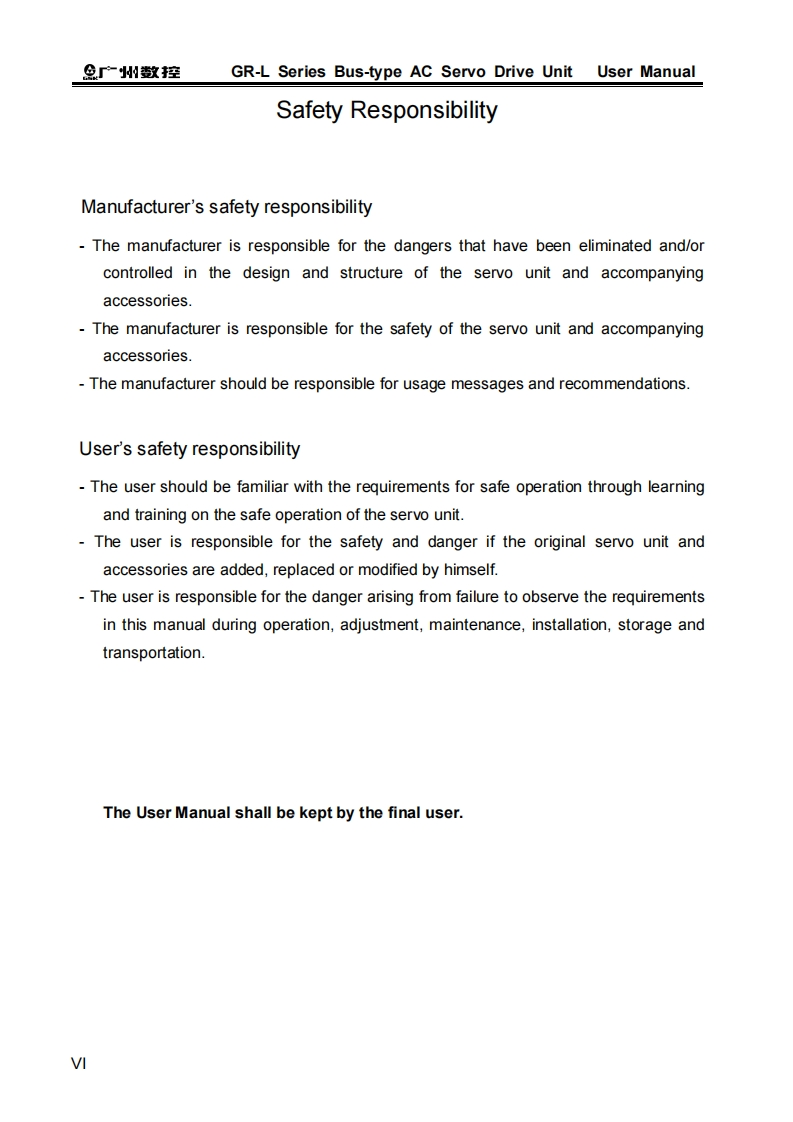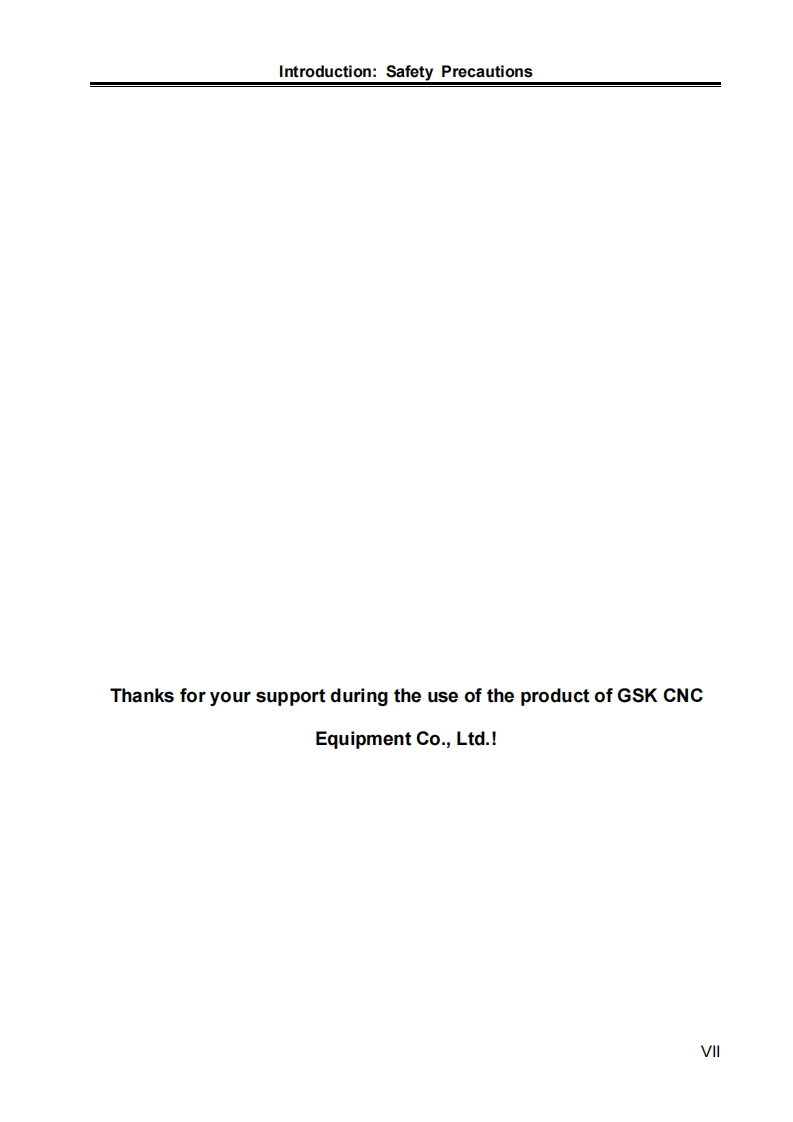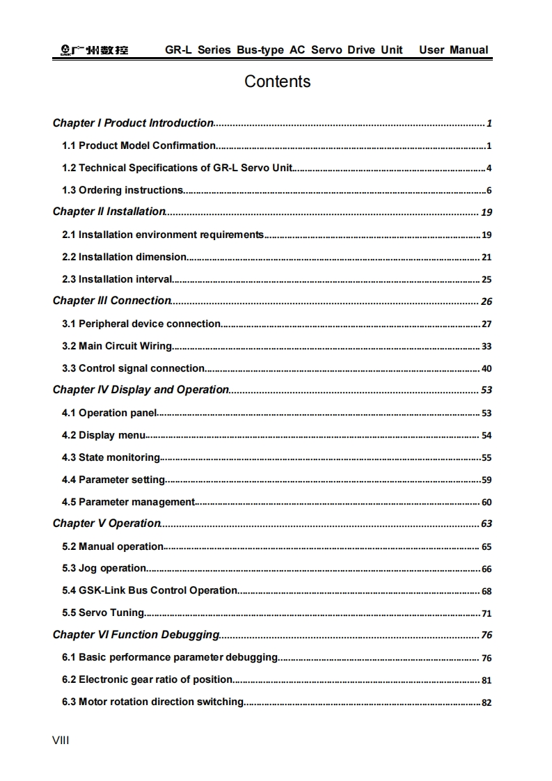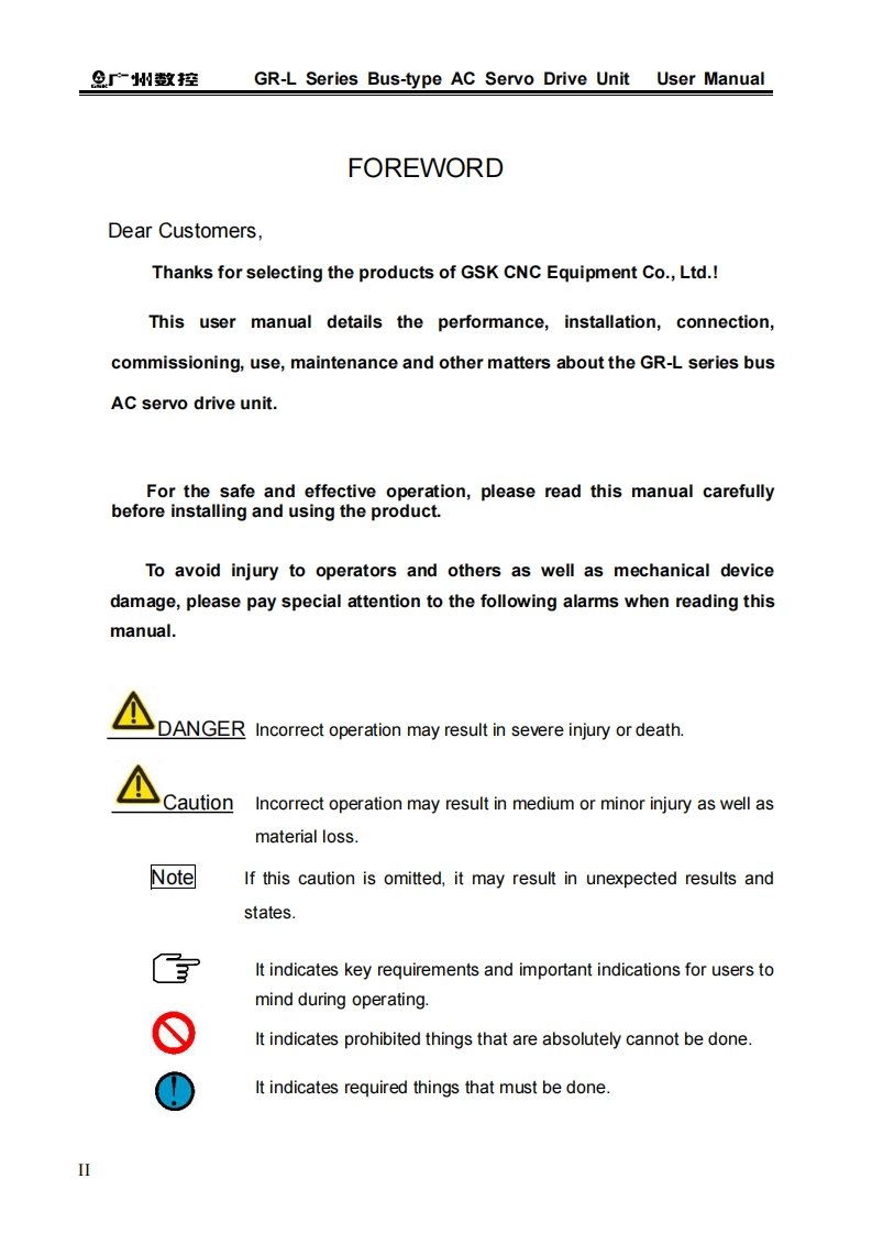This manual is intended to describe all matters regarding the operationof the GR-L series bus type Ac servo drive unit.However,the limit of length andactual operating conditions of the robot may prevent us from elaborating allunnecessary or impossible operations of the product.Therefore,operations notspecified herein shall be considered“impossible”or“unallowable”.Tis User Manual is the property of GSK CNC Equipment Co.Ltd.Allrights are reserved.It is against the law for any organization or individual to publishor reprint this manual,and GSK reserves the right to ascertain their legal liability.