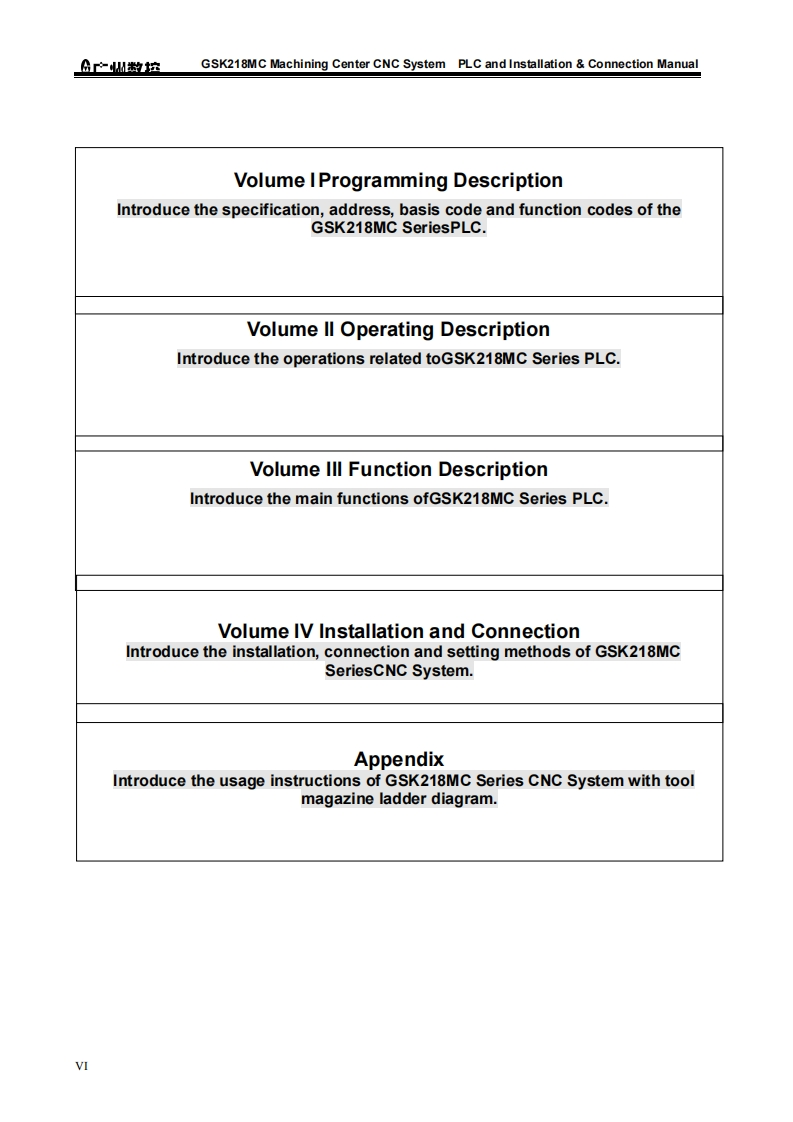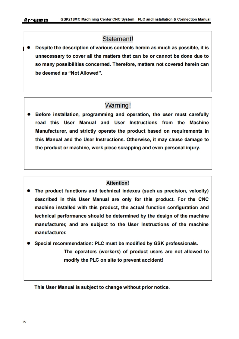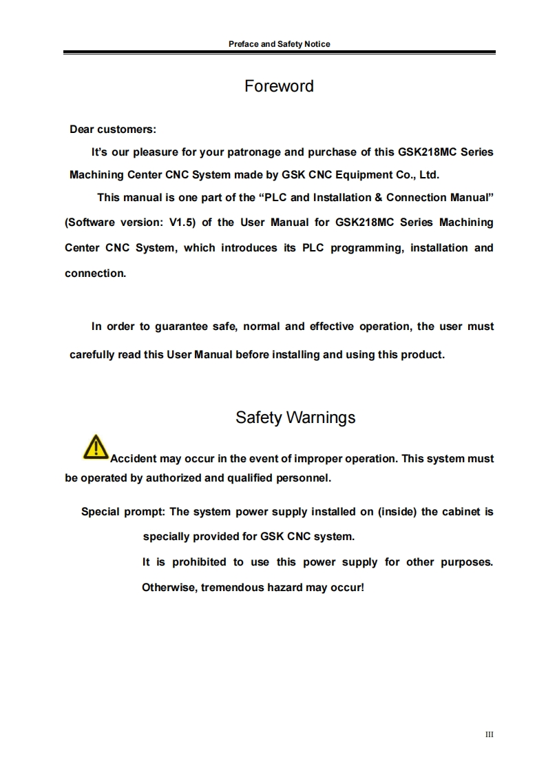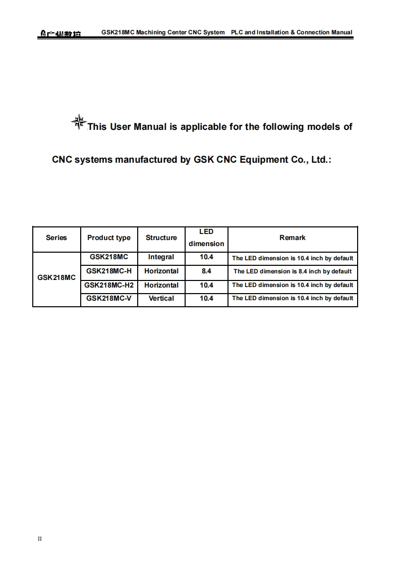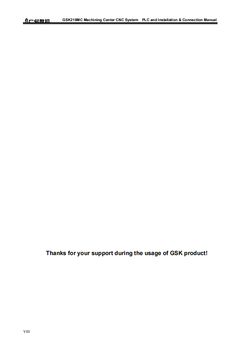 This User Manual describes all items concerning the operations of theGSK218MC Series Machining Center CNC System as much as possible.However,it is impractical to give detailed descriptions of all unnecessary or unallowableoperations for this series CNCsystem due to text limit,product specificapplications and other causes.Therefore,operations not specified herein shall beconsidered“impossible'”or“unallowable”.This Usor Manual is the property of GSK CNC Equipment Co,Ltd.Allrights are reserved.It is against the law for any organization or individual topublish or reprint this manual,and GSK reserves the right to ascertain their legalliability.