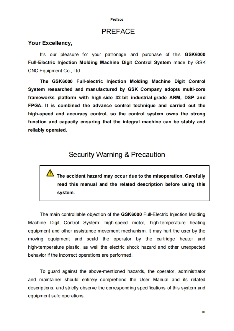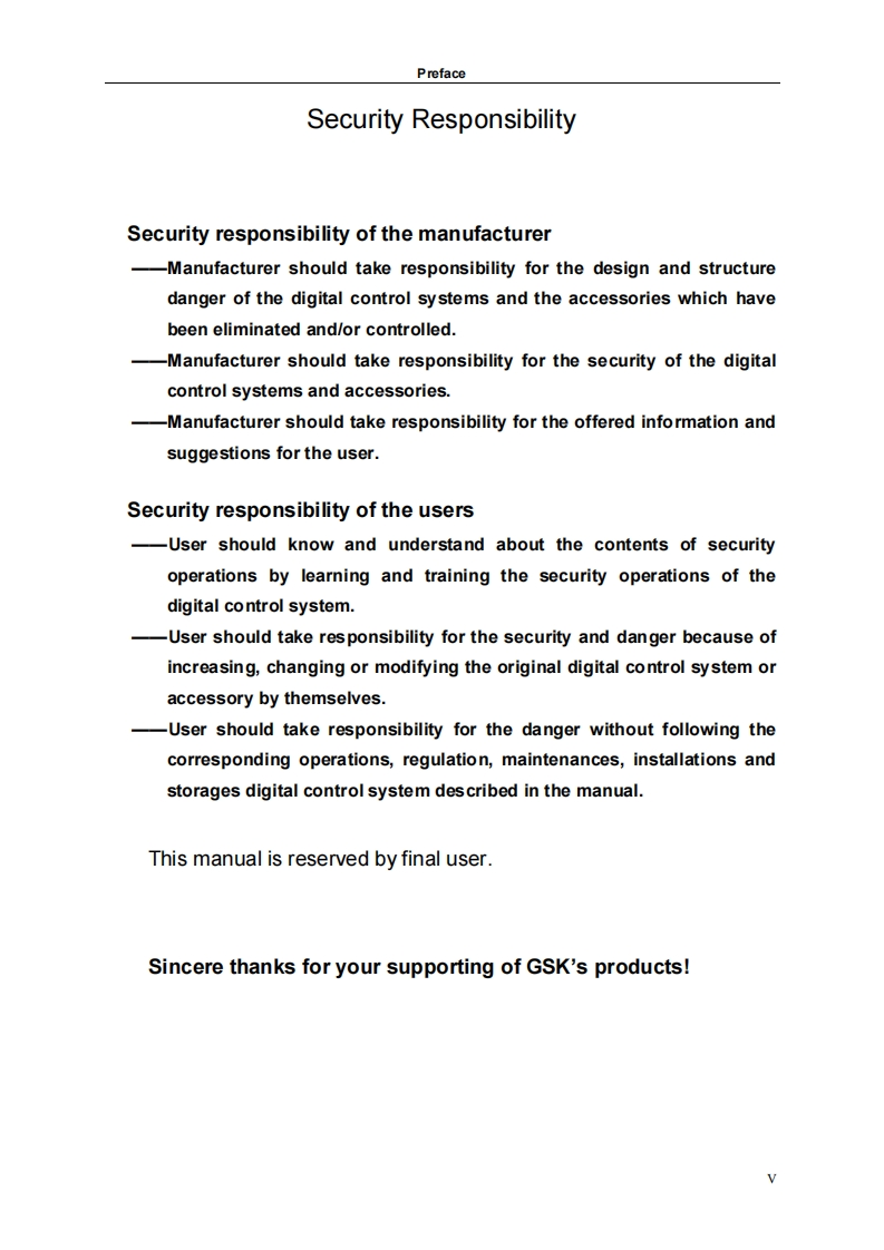 This user manual describes all proceedings concerningthe operations of this CNC system in detail as much aspossible.However,it is impractical to give particulardescriptions for all unnecessary or unallowable systemoperations due to the manual text limit,product specificapplications and other causes.Therefore,the proceedings notindicated herein should be considered impractical orunallowable.This user manual is the property of GSK CNC Equipment Co.Ltd.All rights are reserved.It is against the law for any organizationor individual to publish or reprint this manual without the expresswritten permission of GSK and the latter reserves the right toascertain their legal liability.