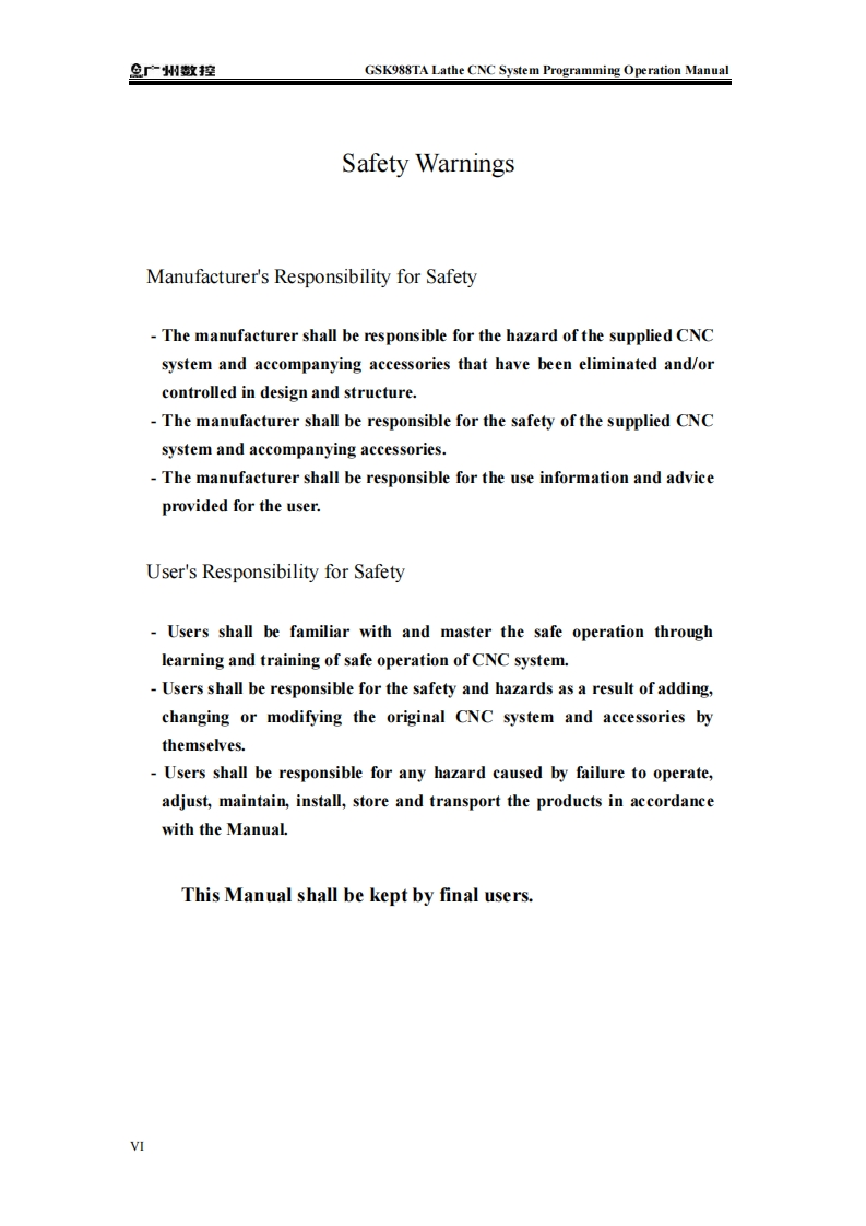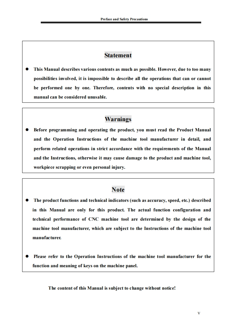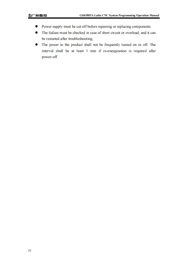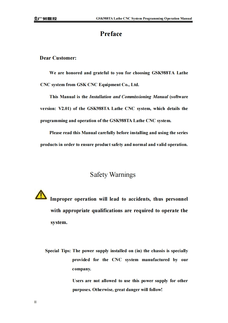 μIn this Manual,we will try our best to describe various matters,related to the operation of the GSK988TA lathe CNC system developed andmanufactured by GSK CNC Equipment Co.,Ltd.It is not possible to describein detail all the operations that need not be done and/or cannot be done in thesystem due to length constraints and specific product usage.Therefore,anything not specifically indicated in this Manual shall be deemed to be theoperation that is "impossible"or "not permitted".iht of this Manual belongs to GSK CNC EquiLtd.,and it is illegal for any units or individuals to publish or copy it.GSKCNC Equipment Co.,Ltd.reserves the right to investigate their legalliabilities.
