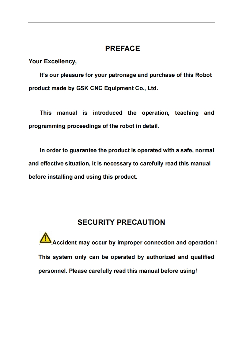 This user manual describes all proceedings conceming theoperations of in detail as much as possible.However,it is impractical togive particular descriptions for all unnecessary or unallowable systemoperations due to the manual text limit,product specific applications andother causes.Therefore,the proceedings not indicated herein should beconsidered impractical or unallowable.This user manual is the property of GK CNC Equipment oLtd.All rights are reserved.It is against the law for any organization orindividual to publish or reprint this manual without the express writtenpermission of GSK and the latter reserves the right to ascertain their legalliability.It is necessary to ensure that this operation manual reaches to the ultimate user of thisproduct.