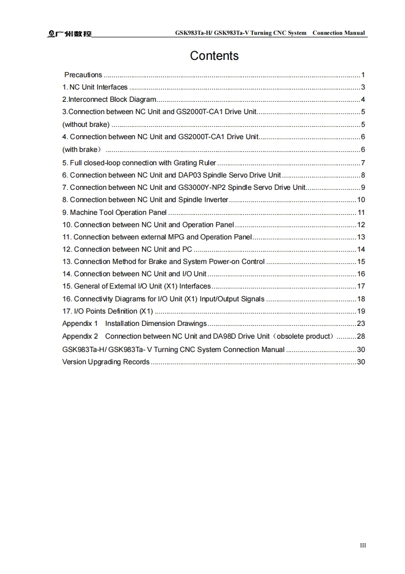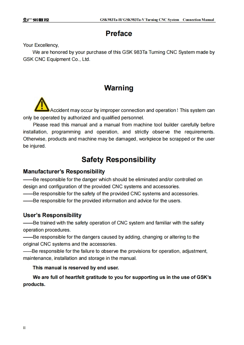 In this user manual we have tried to describe the mattersconcerning the operation of this CNC system to the greatest extent.However,it is impossible to give particular descriptions for allunnecessary or unallowable operations due to length limitation andproducts application conditions:Therefore,the items not presentedherein should be regarded as "impossible or "unallowable "Copyright is reservedto GK CNC Equipment Co..Ltd.is illegal for any organization or individual to publish or reprint thismanual.GSK CNC Equipment Co.,Ltd.reserves the right to ascertaintheir legal liability.