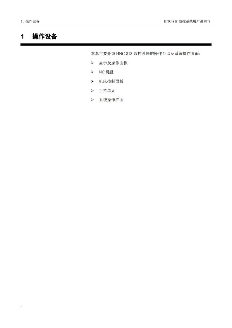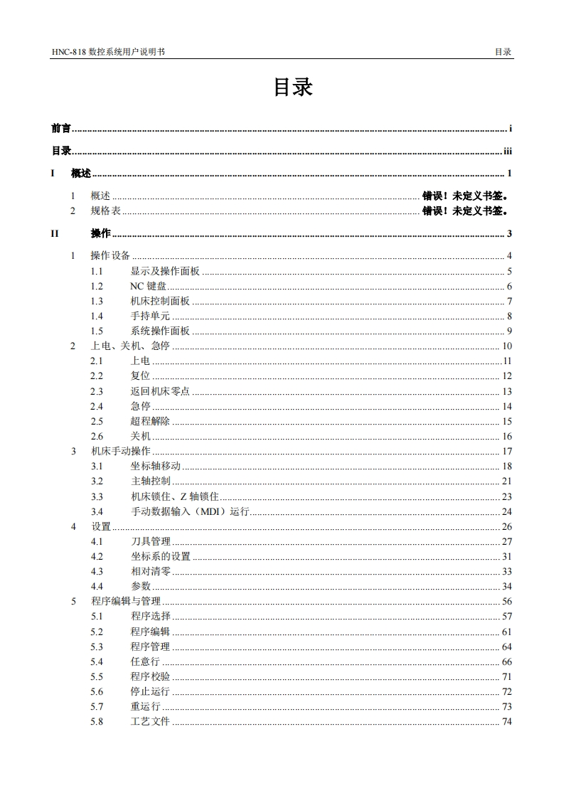 前言三本系列说明书全面地介绍了HNC-818数控系统的特性、系统组成、各部分的系统命令及其使用、操作步骤、用户编程方法及示例等,是用户快速学习和使用本系统的基本说明书。本说明书的更新和升级事宜,由武汉华中数控股份有限公司授权并组织实施。未经本公司授权或书面许可,任何单位或个人无权对本说明书内容进行修改或更正,本公司概不负责由此而造成的客户损失。HNC-818数控系统用户说明书中,我们将尽力叙述各种与该系统操作相关的事件。由于篇幅限制及产品开发定位等原因,不能也不可能对系统中所有不必做或不能做的事件进行详细的叙述。因此,本说明书中没有特别描述的事件均可视为“不可能”或“不允许”的事件。此说明书的版权归武汉华中数控股份有限公司,任何单位与个人进行出版或复印均属于非法行为,我公司将追究其法律责任。