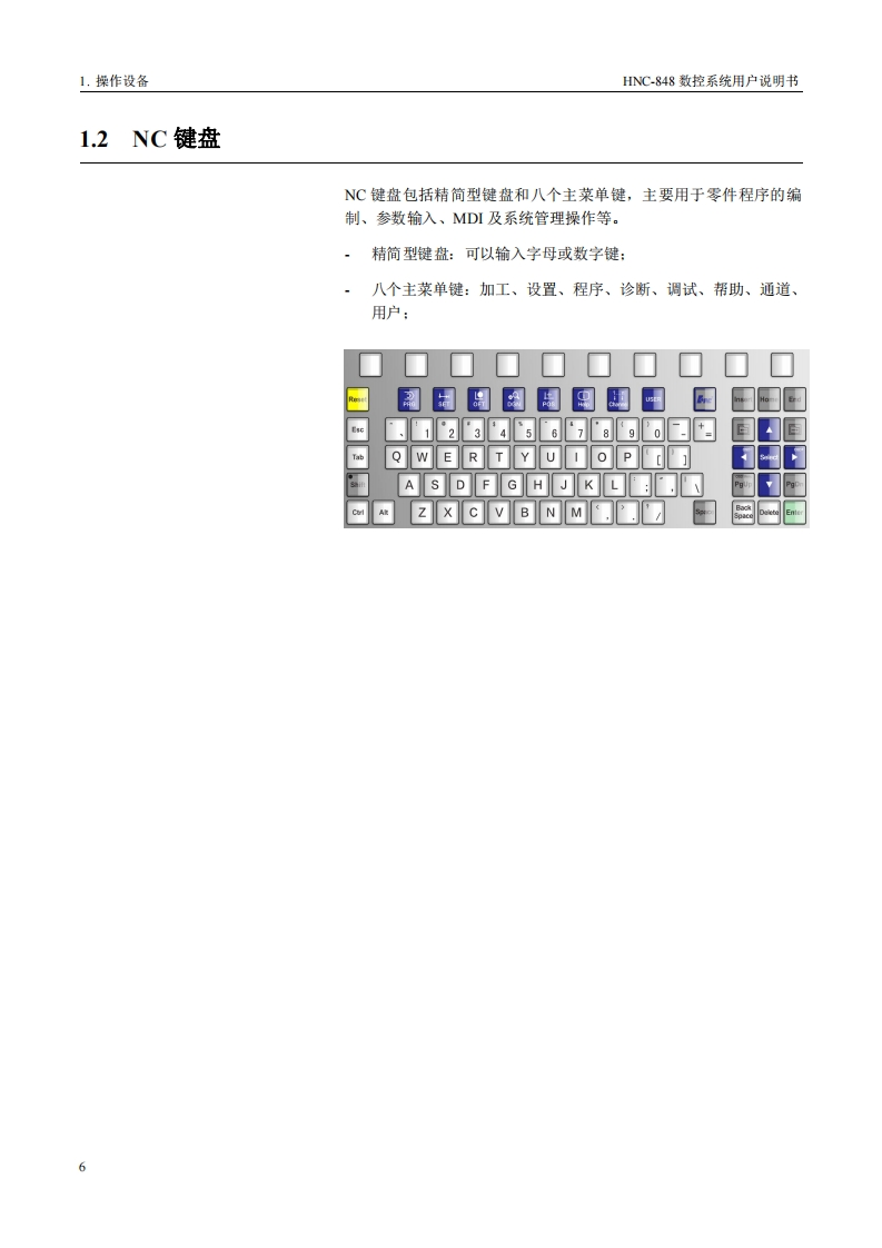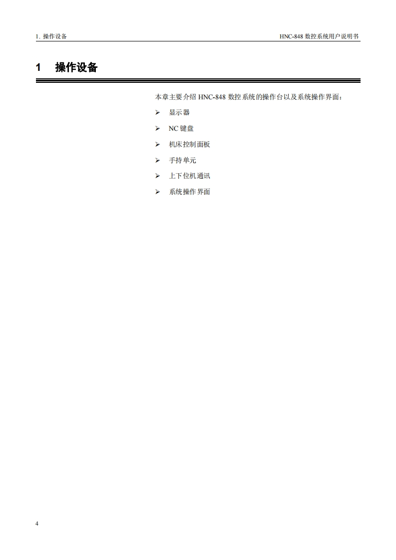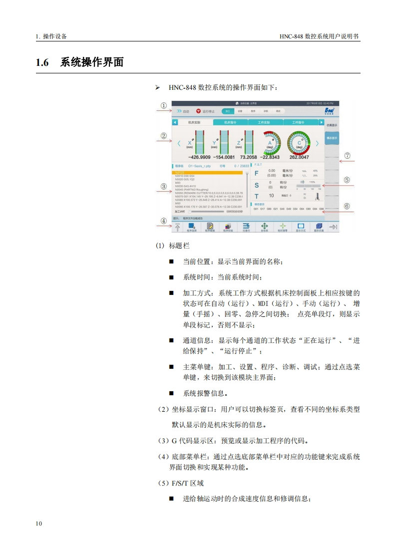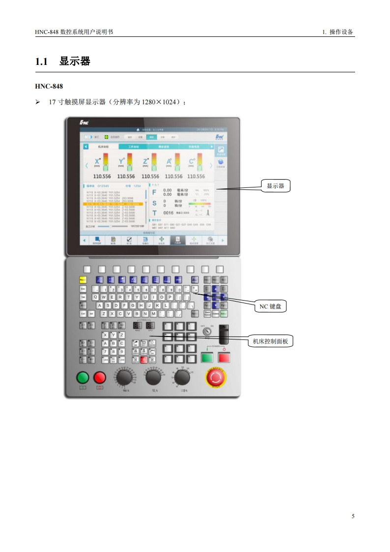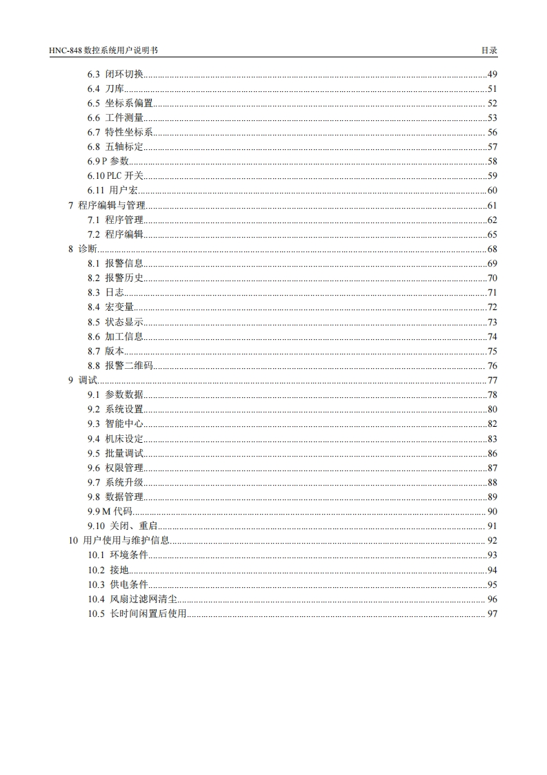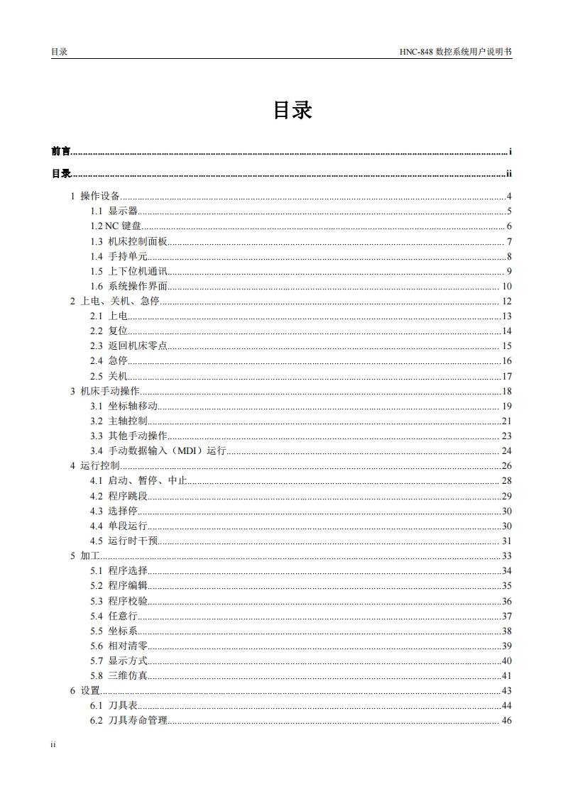 前言本系列说明书全面地介绍了HNC-848数控系统的特性、系统组成、各部分的系统命令及其使用、操作步骤等,是用户快速学习和使用本系统的基本说明书。本说明书的更新和升级事宜,由武汉华中数控股份有限公司授权并组织实施。未经本公司授权或书面许可,任何单位或个人无权对本说明书内容进行修改或更正,本公司概不负责由此而造成的客户损失。HNC-848数控系统用户说明书中,我们将尽力叙述各种与该系统操作相关的事件。由于篇幅限制及产品开发定位等原因,不能也不可能对系统中所有不必做或不能做的事件进行详细的叙述。因此,本说明书中没有特别描述的事件均可视为“不可能”或“不允许”的事件。此说明书的版权归武汉华中数控股份有限公司,任何单位与个人进行出版或复印均属于非法行为,我公司将追究其法律责任。