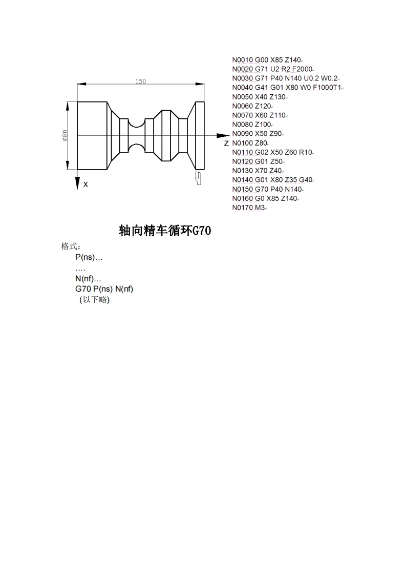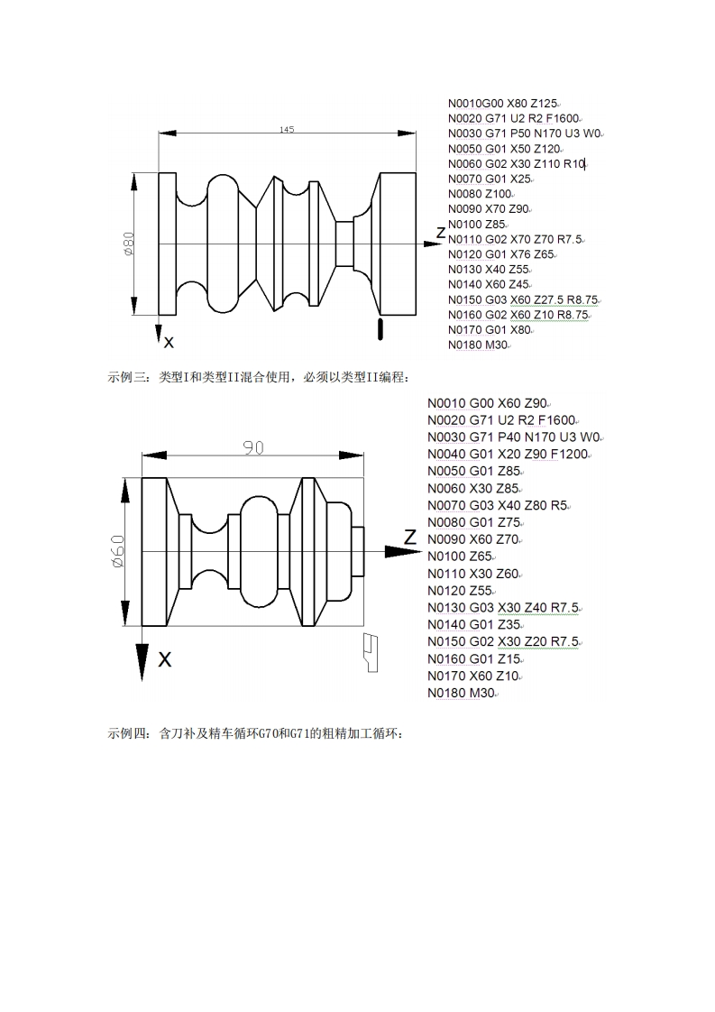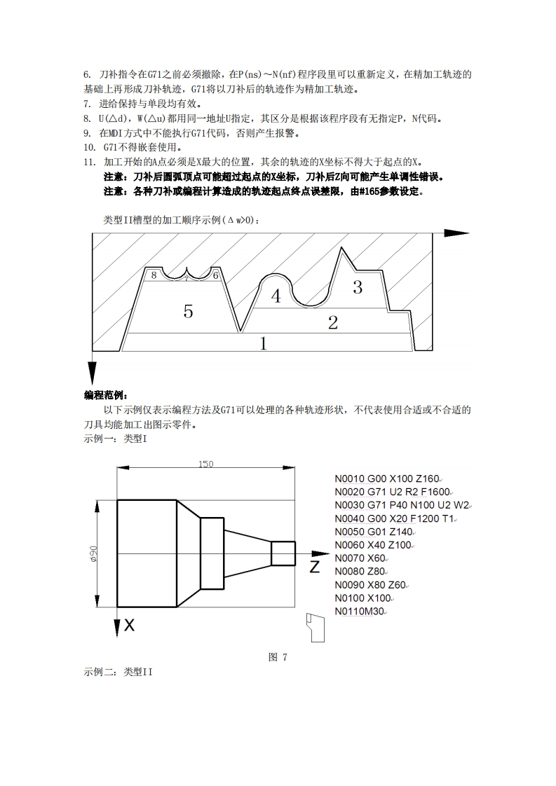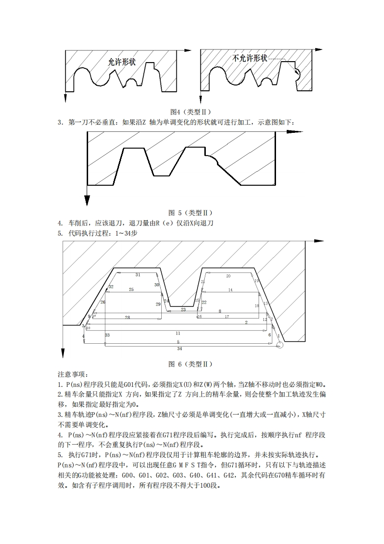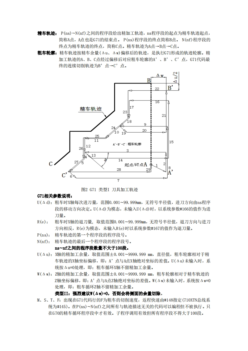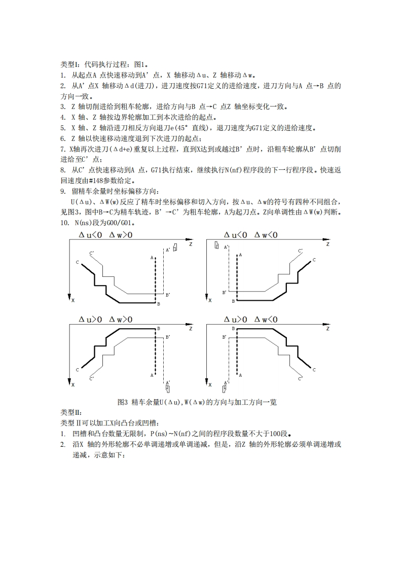 轴向粗车循环G71G71用于在精车轨迹之间沿横向切除多余的材料,并留下精车的加工余量。G71有两种粗车加工循环:类型I和类型IIG71程序格式:G71U(△d)R(e)FS_T_;第一段G71G71Pns)N(nf)U(△u)W(△w):第一段G71N(ns)GO/G1 X (U)Z (W).:G71第一段:ns段只能G00/G01;精车轮廓轨迹N.·..F:精车轮廓轨迹N..N..N(nf).:G71最后一段:nf段只能G00/G01:为保证程序能正确执行:1.两段G71应按顺序连续两段编程。2.P(ns)~N(nf)程序块应紧接着G71程序行。从P(ns)段到N(nf)段之间的程序定义了精车轨迹,G71将在这些轨迹的空间切除材料(粗车),并留下精车余量。类型I:P(s)段未出现Z(W)指令,用于端面外向工件方向加工,X/Z坐标均沿一个单调方向不得出现凹坑或凸台。类型II:P(s)段有Z(W)指令(进给量0或非0),可加工凹坑或凸台,Z坐标沿一个方向单调增加,而X坐标可以递增或递减。类型I类型Ⅱ:可加工的典型结构图1:类型I与类型II区分代码意义:G71代码分为三个部分:1:第一段G71给定粗车时的切削量、退刀量和切削速度、主轴转速、刀具功能。2:第二段G71给定精车轨迹的程序段区间、精车余量的程序段.3:P(ns)~N(nf)定义精车轨迹的若干连续的程序段,执行G71时,这些程序段仅用于计算粗车的轨迹,实际加工时刀具沿这些程序轨迹构成的空间沿Z向切削多余材料。系统根据精车轨迹、精车余量、进刀量、退刀量等数据自动计算粗加工路线,沿与Z轴平行的方向切削,通过多次进刀→切削→退刀的切削循环完成工件的粗加工。G71的起点和终点相同。相关定义: