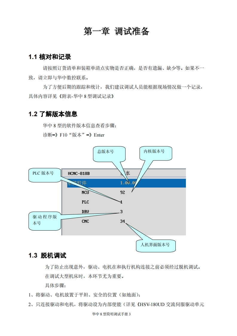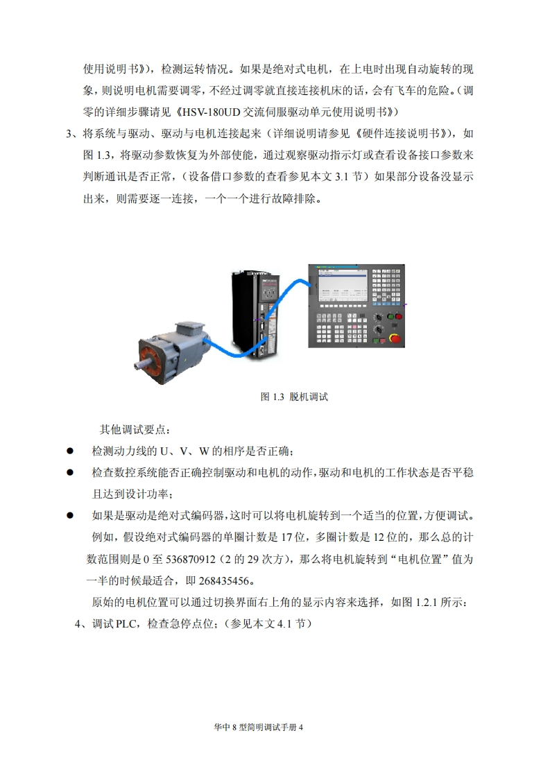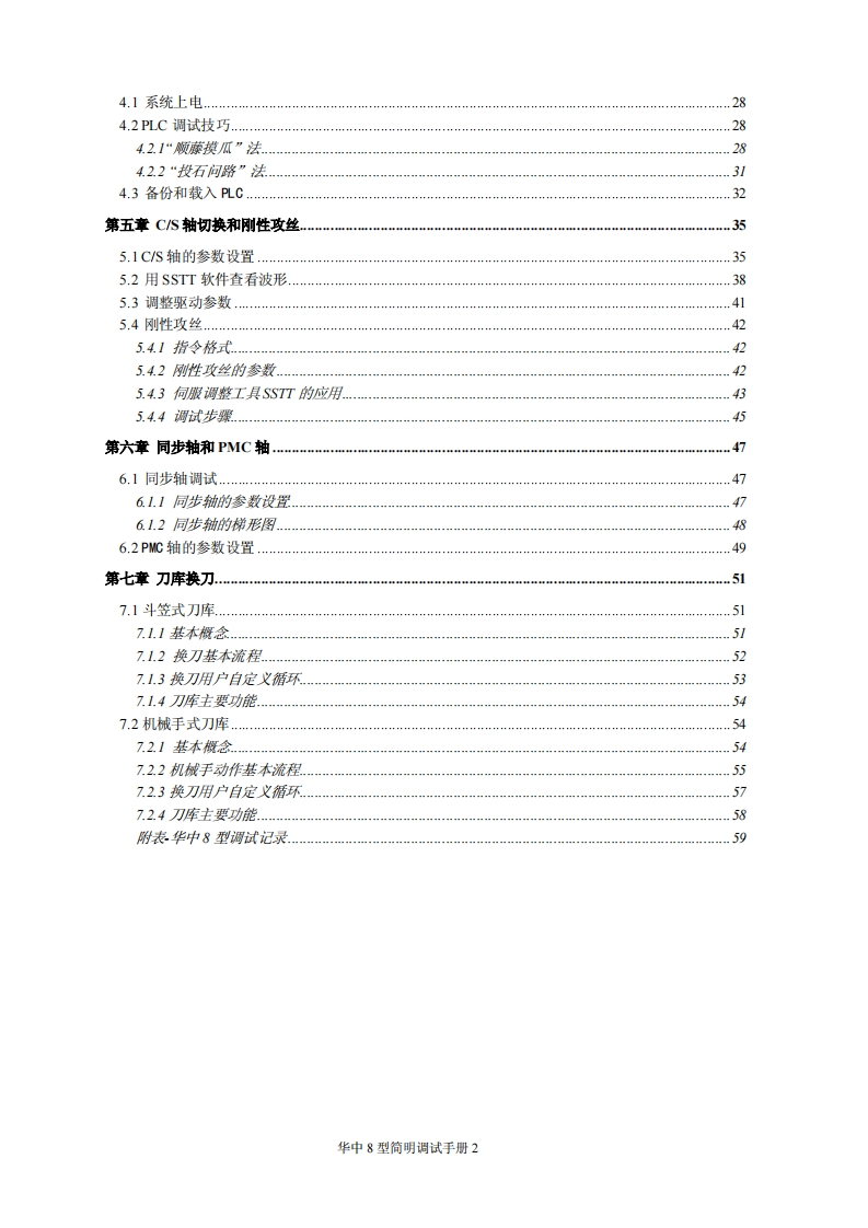 目录第一章调试准备.31.1核对和记录.31.2了解版本木信息.…31.3脱机调试31.4分步上电原则.5第二章硬件连接……2.1连接要求简介…62.2数控系统的典型连接72.3数控系统典型设计概述82.4铣床数控系统设计举例.82.41系统简介…2.4.2总体框图..102.43输入输出开关量的定义102.44电气原理图简介14第三章系统基本参数设定.203.1核对设备参数203.1.1设备参数203.1.2轴号与设备号203.2参数设置方法.213.3主要参数说明.….233.3.1轴重点参数.233.3.2主轴相关参数233.3.3同服相关参数.243.3.4轴速度相犬参数243.3.5轴回零相关参数253.3.6其他关键参数263.3.7P参数.26第四章PLC调试….28华中8型简明调试手册1
