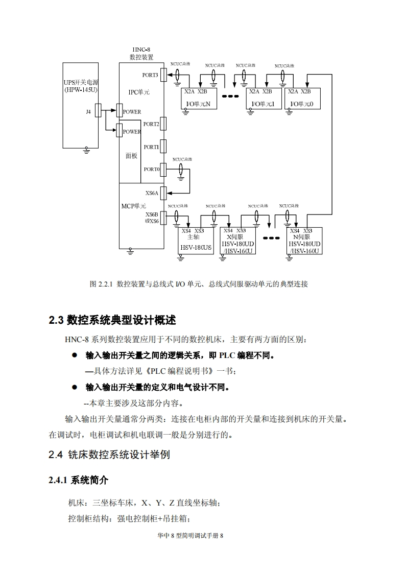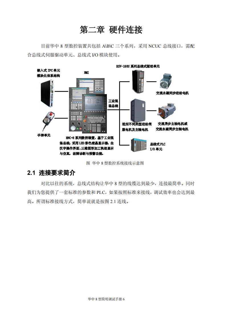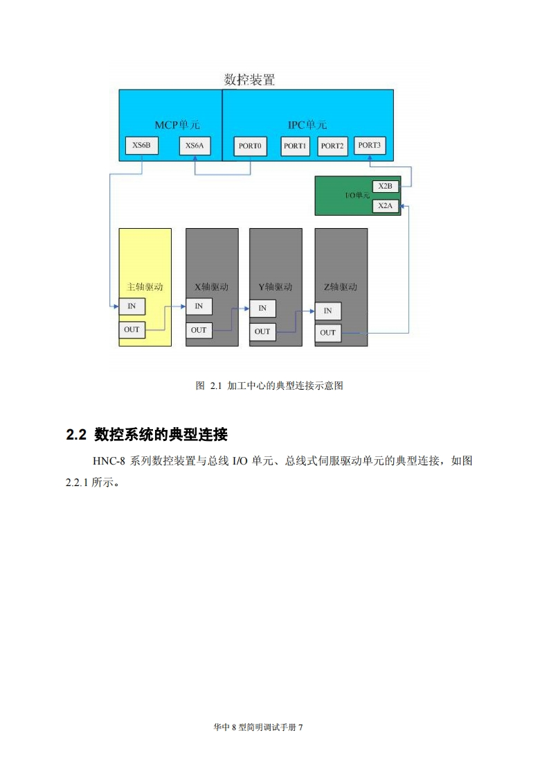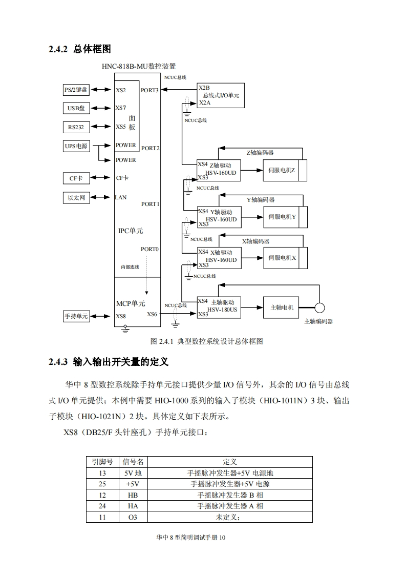 目录第一章调试准备.31.1核对和记录.31.2了解版本木信息.…31.3脱机调试31.4分步上电原则.5第二章硬件连接……2.1连接要求简介…62.2数控系统的典型连接72.3数控系统典型设计概述82.4铣床数控系统设计举例.82.41系统简介…2.4.2总体框图..102.43输入输出开关量的定义102.44电气原理图简介14第三章系统基本参数设定.203.1核对设备参数203.1.1设备参数203.1.2轴号与设备号203.2参数设置方法.213.3主要参数说明.….233.3.1轴重点参数.233.3.2主轴相关参数233.3.3同服相关参数.243.3.4轴速度相犬参数243.3.5轴回零相关参数253.3.6其他关键参数263.3.7P参数.26第四章PLC调试….28华中8型简明调试手册1