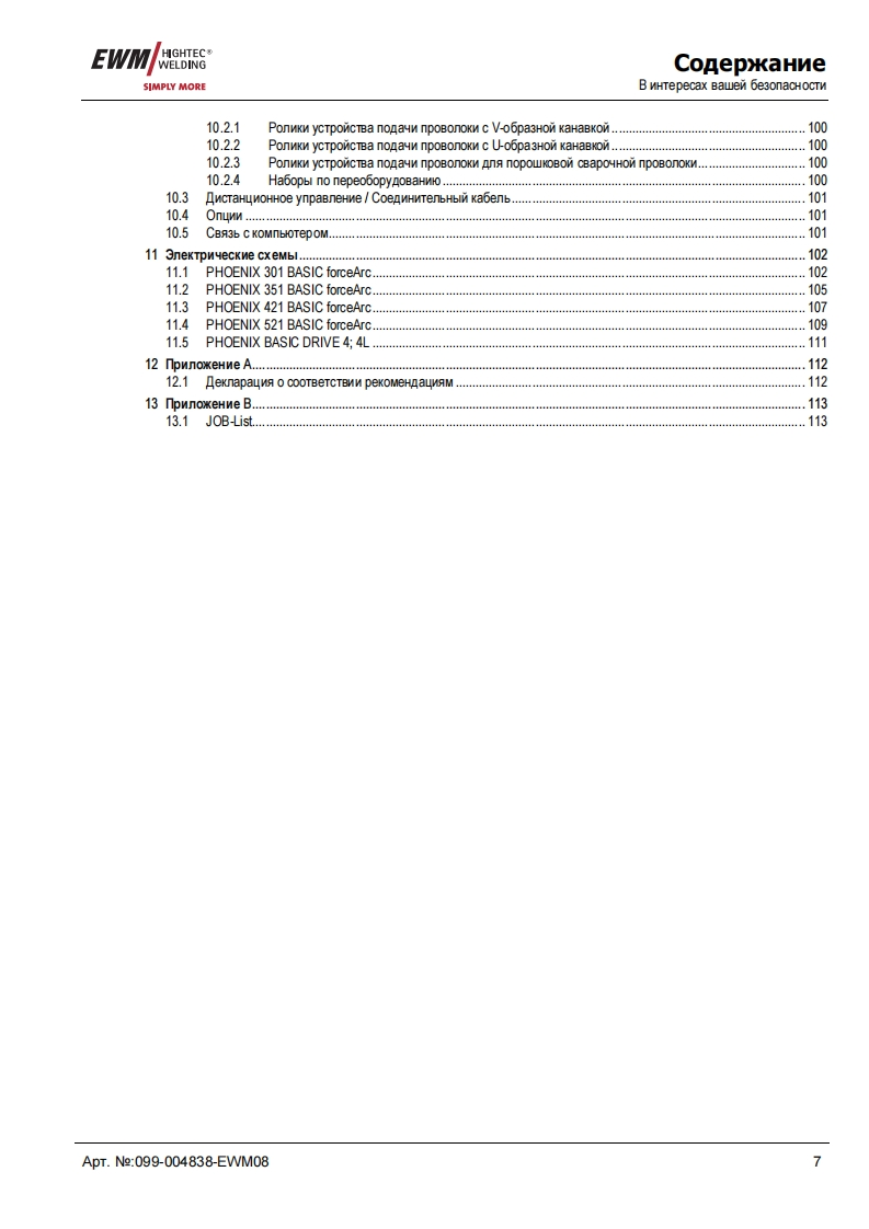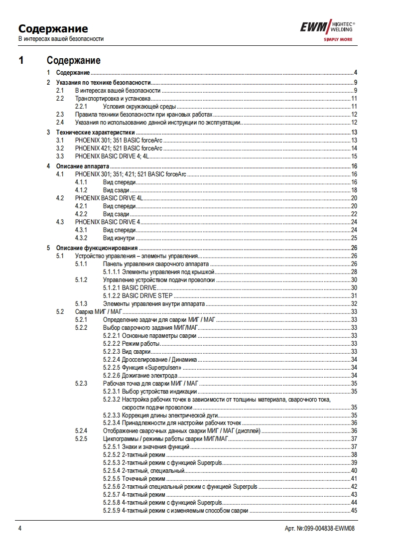 EWMHIGHTEC®”TE GAR>WELDINGHIGHTECWELDINGSIMPLY MORE3P R E M I U M Q U A L I T YYEARS WARRANTEWMHIGHTEC WELDING GmbHDr.Gunter-Henle-StraBe 8 D-56271 MundersbachFon+492680181-0Fax+492680181-244www.ewm.de info@ewm.deRUPyKoBOACTBo no 3KcnnyataynnCBapka MIT/MA,BWr n pyyHa cBapkaPHOENIX 301.351.421.521 BASIC forceArcPHOENIX 301,351,421,521 BASIC PULS forceArcPHOENIX BASIC DRIVE 4,4Lnepen BBOAOM B 3kcnnyaTaywo 0693aTenbHo npoyTMre AaHHyo MHCTpyKyMo no 3KcnnyaTayMn!B npoTMBHOM cnyuae BbI MoxeTe noABeprHyTbca onaCHOCTM!06cnyxnBaHne annapaTa MoryT BbinonHAT TonbKo nMua,o3Ha KoMneHHble C CooTBeTCTByHOWMMM WHCTPyKUMAMM noTexHnKe 6e3onacHocTn!Ha annapaTax NMeloTca ycnoBHble 0603HayeHn,noATBepxAaroue COoTBeTCTBMe Tpe6oBaHMAM cneAyHouMxHopMaTMBHbIX AoKyMeHTOB EC:Peko MeHnayMa EC"HM3KOBonbTHa annapaTypa"(2006/95/EG)PekomeHgaya EC/EMV(2004/108/EG)B cooTBeTCTBMM co cTaHAapraMn IEC 60974,EN 60974,VDE 0544 annapaTbI MoryT 3KcnnyaTmpoBaTbca BnoMeweHNAX c noBblweHHoM 3neKTpNyeckon onacHOCTbO.CooTBeTcTByeT Tpe6oBaHMAM:rOCT 12.2.007.0-75,rOCT 12.2.007.8-75,HopMbI 8-95ME05CooTBeTCTByeT Tpe6oBaHMAM:r0CT18130-79,「0CT13821-77,r0CT12.2.007.0-75,「0CT12.2.007.8-75,HopMb18-95CA©2008MoryT BHOCNTbCA N3MeHeHMA!ApT.Ne:099-004838-EWM08no CoCTOHNIO Ha:10.04.2008