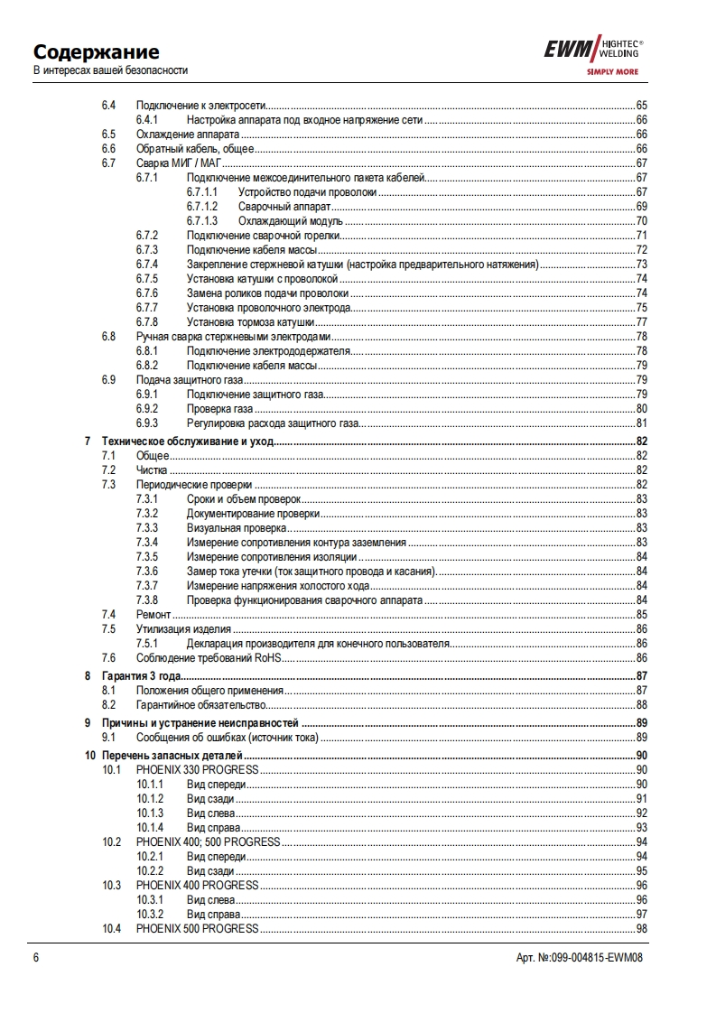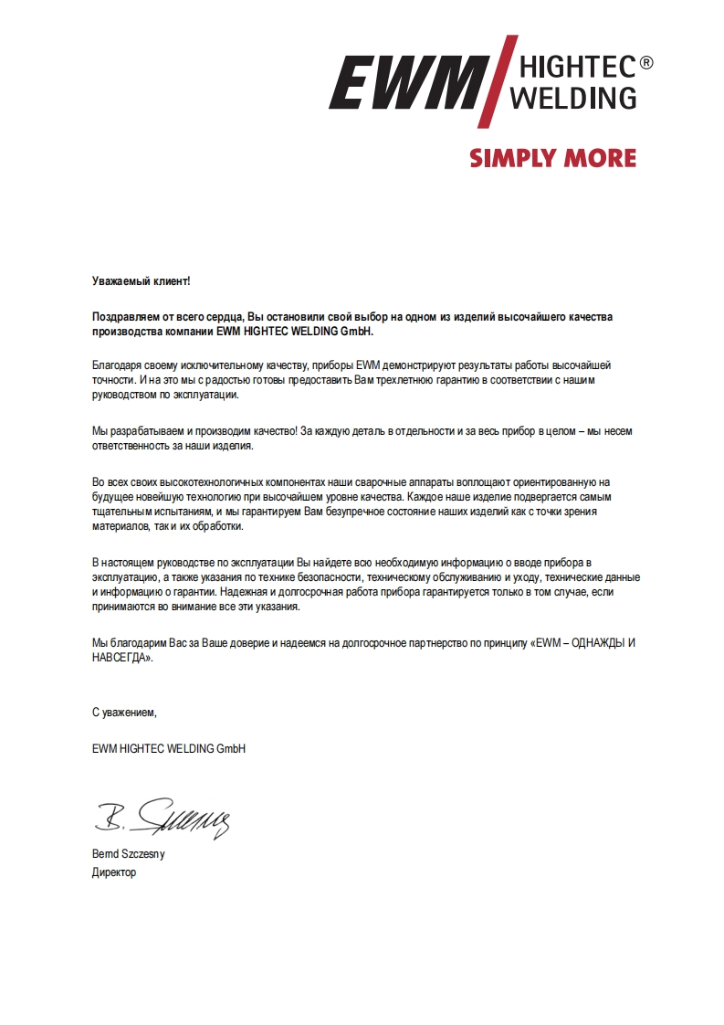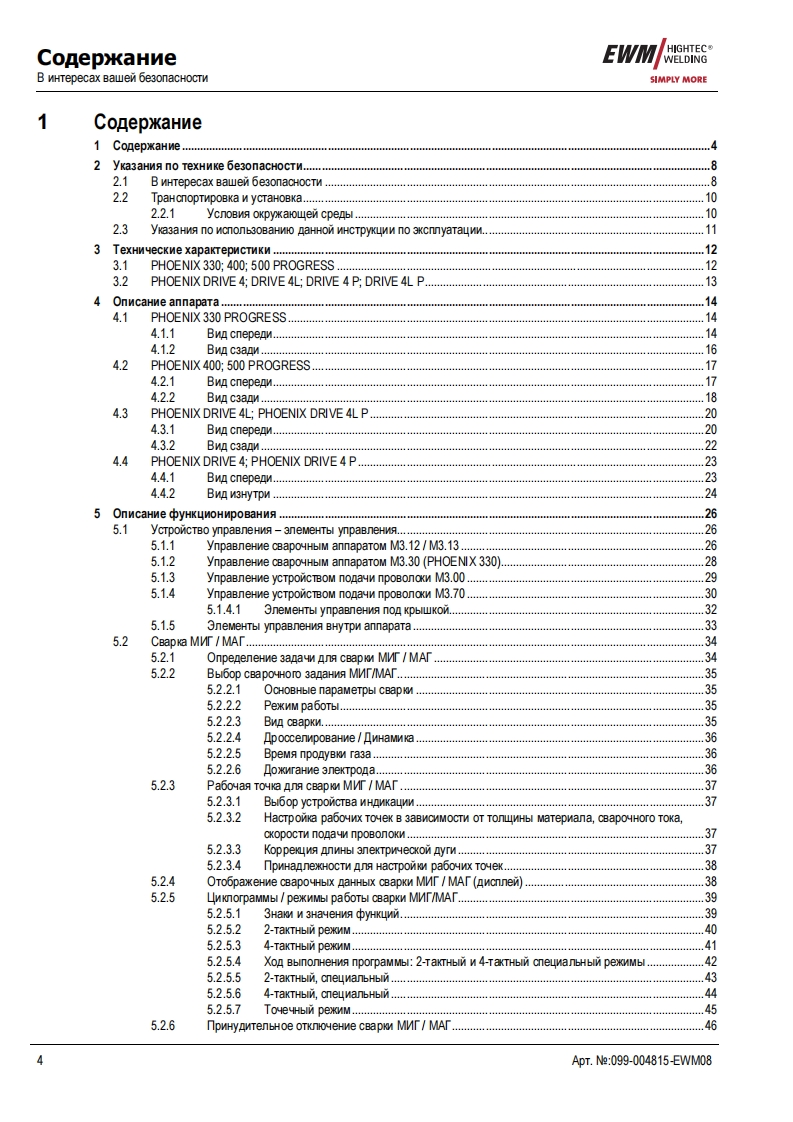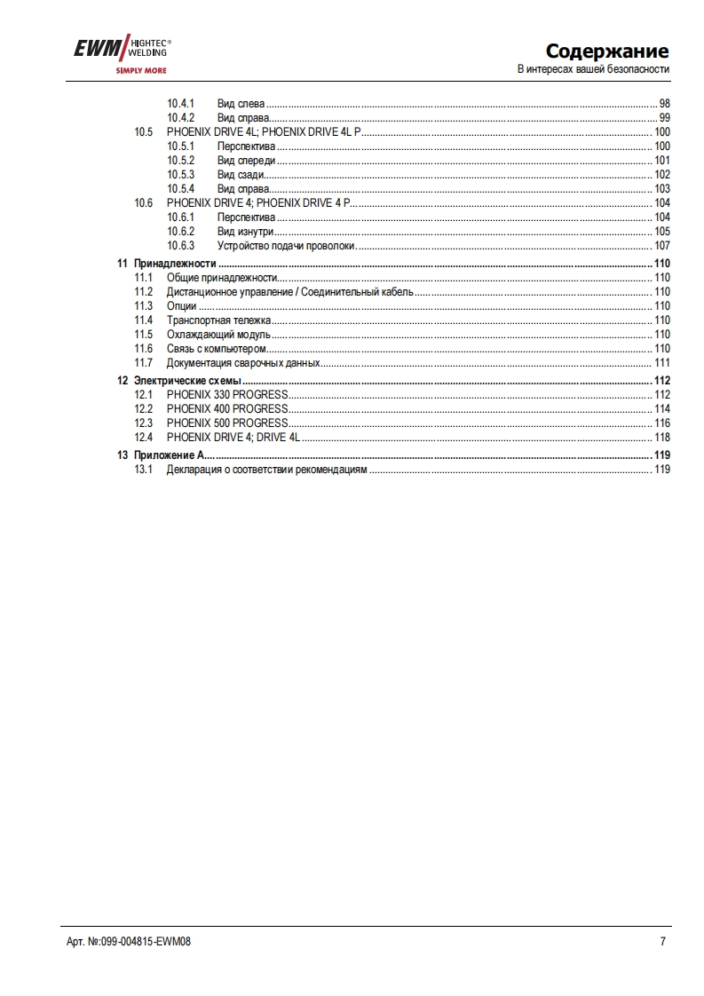 EWMHIGHTEC®JAHRE GARANTIRWELDINGHIGHTECWELDINGSIMPLY MORE3P R E M I U M Q U A L I T YYEARS WARRANTEWMHIGHTEC WELDING GmbHDr.-Gunter-Henle-StraBe 8 D-56271 MundersbachPhone:+49268018101Fax:+492680181244www.ewm.de info@ewm.deRUMHCTpyKyna no 3KcnnyataynnCBapka MIT/MAI n pyyHa cBapkaPHOENIX 330,400,500 PROGRESS PULSPHOENIX DRIVE 4,4L,4P,4LPnepeA BBOAOM B 3KcnnyaTayno o63aTenbHo npoyTTe AaHHyo HCTpyKywo no 3KcnnyaTayMn!B npoTMBHOM cnyuae BbI MoxeTe noABeprHyTbca onacHOCTM!O6cnyxnBaHme annapaTa MoryT BbinonHATb TonbKo nMua,03Ha KoMneHHble C COoTBeTCTByHOW MMM MHCTPyKMAMM noTexHnKe 6e3onacHoCTM!Ha annapaTax nMeroTc ycnoBHble 0603HayeHn,noATBepxKAarowme CooTBeTCTBMe Tpe6oBaHNAM cneAyHOuMxHopMaTWBHbIX AoKyMeHTOB EC:PekoMeHnayMa EC "Hn3KOBOnbTHa annapaTypa"(2006/95/EG)PexomeHgay EC/EMV(2004/108/EG)B cooTBeTCTBMM co CTaHAapTaMM IEC 60974,EN 60974,VDE 0544 annapaTbl MoryT 3KcnnyaTmpoBaTbca BnoMeweHNAX C noBblweHHON 3nekTpNyeckon onacHOCTbHO.CooTBeTcTByeT Tpe6oBaHMAM:TOCT 12.2.007.0-75,rOCT 12.2.007.8-75,HopMbI 8-95ME05CooTBeTCTByeT Tpe6oBaHMAM:r0CT18130-79,f0CT13821-77,「0CT12.2.007.0-75,「0CT12.2.007.8-75,HopMb18-95CA©2007MoryT BHOCNTbCA N3MeHeHNA!ApT.Ne:099-004815-EWM08no cocTOHNO Ha:16.05.2007