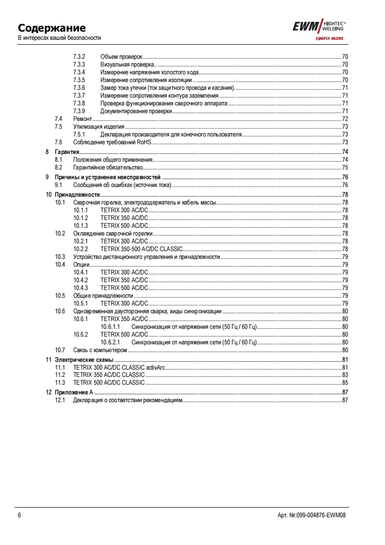 EWMHIGHTEC®发EGAWELDINGHIGHTECOWELDINGPM1 U M QUA11TYSIMPLY MOREYEARS WARRANTEWMHIGHTEC WELDING GmbHDr.Gunter-Henle-StraBe 8 D-56271 MundersbachF0n+492680181-0Fax+492680181-244www.ewm.de info@ewm.deRUPyKoBOACTBo no 3KcnnyataynnCBapoyHbin annapat n cBapkn BMr n pyyHon cBapknCTep/HeBbIMN 3neKTponaMnTETRIX 300,350,500 AC/DC CLASSIC activArcnepeA BBOAOM B 3kcnnyaTaywo 0693aTenbHo npoyTHTe AaHHyo MHCTpyKyMo no 3kcnnyaTayMn!B npoTHBHOM cnyuae Bbl MoxeTe noABeprHyTbca onacHOCTn!O6cnyxnBaHne annapaTa MoryT BbinonHATb TonbKo nMua,03Ha KoMneHHble C COoTBeTCTByHOWMMM MHCTPyKUMAMM noTexHnKe 6e3onacHocTn!Ha annapaTax MMeroTc ycnoBHble 0603HayeHM,noATBepxAaroume CooTBeTCTBMe Tpe6oBaHMAM cneAyHOMxHopMaTMBHbIX AoKyMeHTOB EC:PeKoMeHAaya EC "Hn3KOBonbTHa annapaTypa"(2006/95/EG)PekoMeHgaya EC/EMV(2004/108/EG)B cooTBeTCTBMM co cTaHAapraMM IEC 60974,EN 60974,VDE 0544 annapaTbl MoryT 3KcnnyaTmpoBaTbca BnoMeweHNAX c noBblweHHON 3nekTpNyeckon onacHOCTbHO.CooTBerCTByeT Tpe6oBaHMAM:TOCT 12.2.007.0-75,rOCT 12.2.007.8-75,HopMbI 8-95MEO5CooTBeTCTByeT Tpe6oBaHMAM:「0CT18130-79,「0cT13821-77,「0CT12.2.007.0-75,「0CT12.2.007.8-75,HopMb18-95CAConepxaHne MHCTpyKuMM no 3KcnnyaTayMn He o60CHOBbIBaeT npeTeH3MM Co CToPoHbI nokynaTenABTopckne npaBa Ha 3Ty MHCTpyKuNHo no 3 Kcnnyatayww npMHannexaT N3roTOBNTeno.nepeneyaTka,Aaxke B Bnge Bblnepxek,TonbKo c nMcbMeHHoro pa3peweHnA.©2008MoryT BHOCHTbCA M3MeHeHMA!ApT.e:099-004876EWMM08no CoCTORHNO Ha:11.06.2008