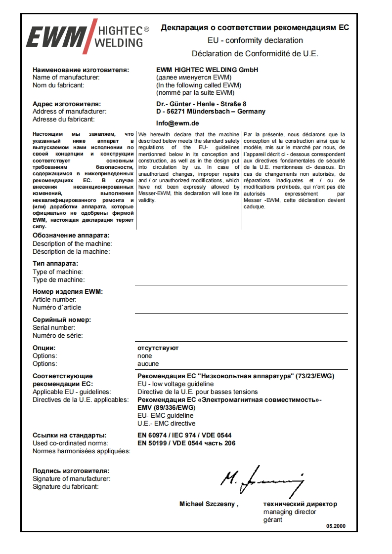EWMHIGHTEC®WELDINGEWM HIGHTEC WELDING GmbHDr.-Gunter-Henle-StraBe 8;D-56271 MundersbachPh0ne:+49(0)2680.181-0:FaX:+49(02680.181-244Internet:www.ewm.de:E-mail:info @ewm.deNHCTpykuna no 3kcnnyataunnTRITON 160 DODCnepeHocHon annapaT an cBapkn BMr(B0nb中paMOBbIM3 neKTpoOM B NHepTHOM「a3e)Mpy4Hon cBapkn cTepxHeBbIMn 3nektponaMn Ha 160 ADCnepen BBOAOM B 3kcnnyataunio 0693aTenbHo npoTnTe naHHyIo MHCTpyKunko no3kcnnyaTaunn!B npoTHBHOM cnyuae Bbl MoxeTe noABeprHyTbca onacHOCTM!O6cnyxn BaHne annapata MoryT BbInonHATb ToNb Ko nnua,03HakoMneHHble CCOOTBeTCTByIOW MMN MHCTpyKUMAMN no TexHNKe 6e3onacHOCTM!Ha annapaTax nMe oTca ycnoBHble 0603HayeHN9,noATBepxnalowne CooTBeTCTBMeTpe6o BaHnAM cnenyiounx HopMaT MBHbIX Aoky MeHTOB EC:PekoMeHnaua EC "HN3KOBonbTHa annapaTypa"(73/23/EWG)PekoMeHnaua EC/EMV (89/336/EWG)(0603HayeHne CE ABnseTc 0693aTenbHbIM Tonbko na cTpaH-uneHOB EC).CooTBeTCTByeT Tpe6oBaHMAM:TOCT 12.2.007.0-75,rOCT 12.2.007.8-75,HopMbI 8-95ME05CooTBeTCTByeT Tpe6oBaHMAM:T0CT18130-79,「0CT13821-77,「0CT12.2.007.0-75,CAr0CT12.2.007.8-75,HopMb18-95B CooTBeTCTBMM co cTaHnapTOM VDE 0544(EN /IEC 60974)annapaTbl MoryT3KcnnyaTnpoBaTbCa B noMewleHNAX c noBblweHHoN 3nekTpnyeckon onacHOCTbO.©1999MoryT BHOCNTbCA N3MeHeHWA!ApT.Nr.:099-000060-EWM08no cocTOaHNHO Ha:23.02.1999