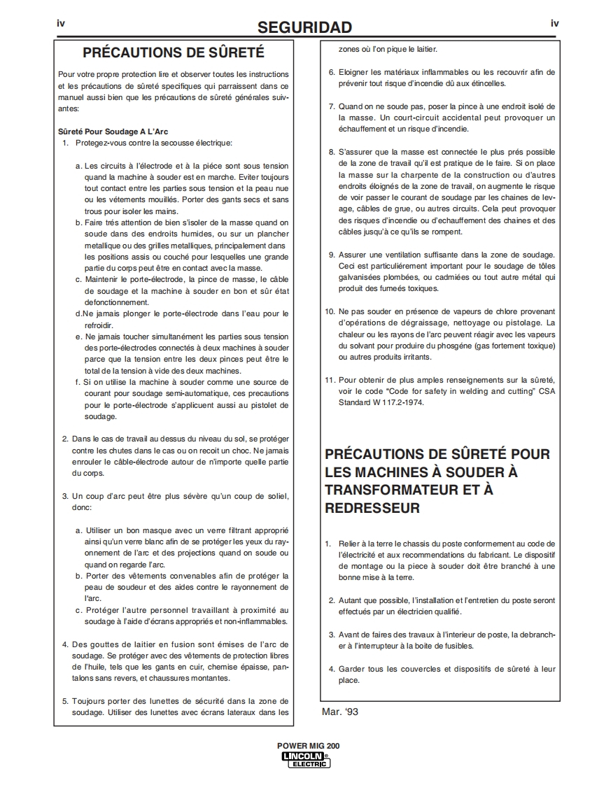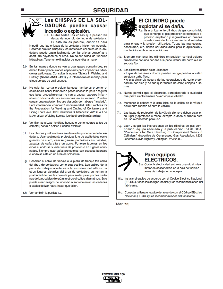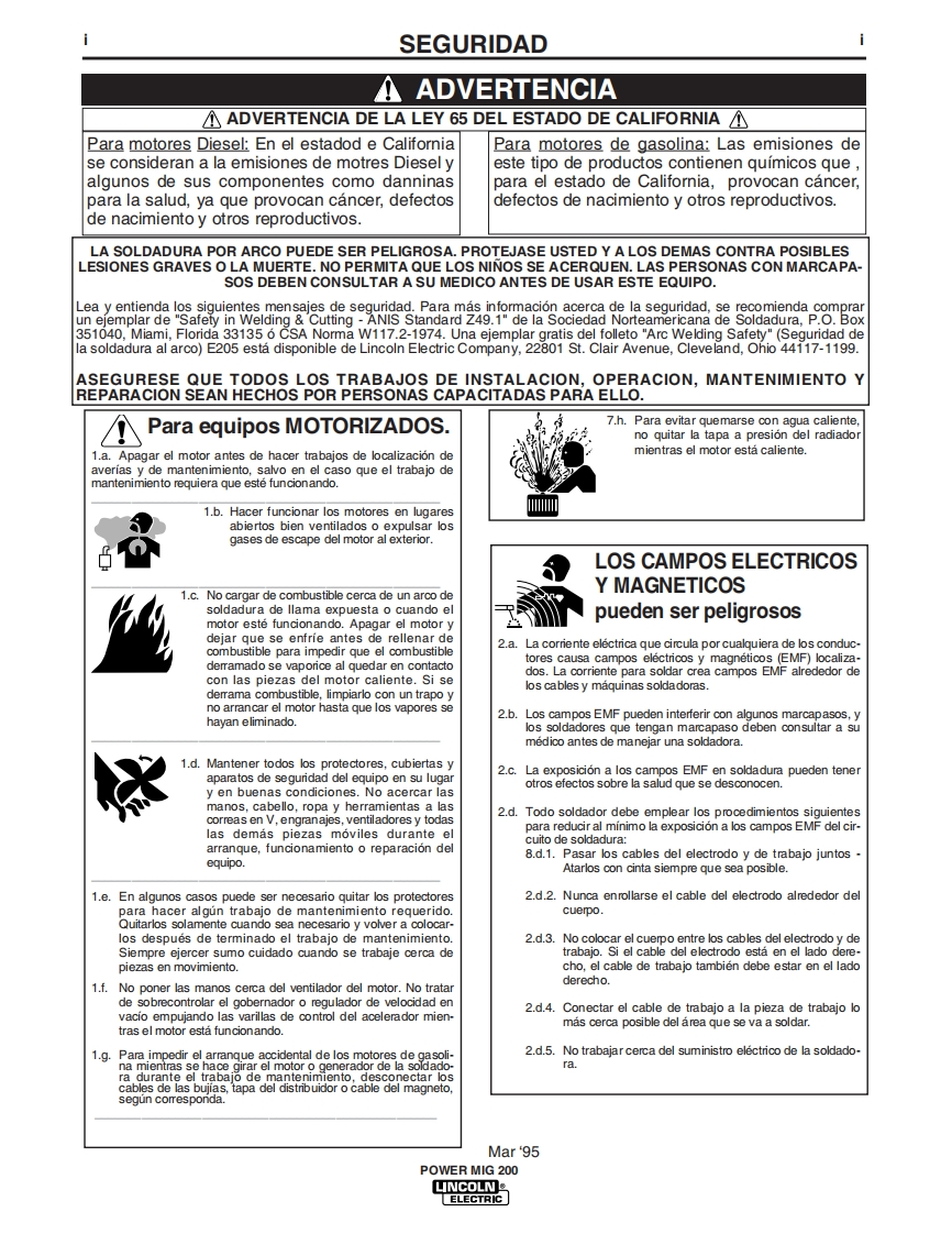 IMS693POWER MIGTM 200Junio,2002Para uso con maquinas codigo 10564This manual covers equipment which is nolonger in production by The Lincoln Electric CoSpecifications and availability of optionalfeatures may have changed.La Seguridad Depende deUstedEl equipo de soladura por arco ycorte de Lincoln esta disenado yconstruido pensando en laseguridad.Sin embargo,suseguridad en general puede serincrementada mediante unainstalacion adecuada...asi comouna operacion inteligente de suparte.NO INSTALE,OPERE OREPARE ESTE EQUIPO SINLEER ESTE MANUAL Y LASPRECAUCINESDESEGURIDADAQUICONTENIDAS.Y,lo masimportante,piense antes deactuar y sea muy cuidadoso.Fecha de compra:Numero de serie:Numero de codigo:Modelo:Lugar de compra:MANUAL DEL OPERADOR1S09002★LINCOLNELECTRICLider Mundial en Productos de Soldadura y CorteVentas y Servicio a traves de las Subsidiarias y Distribuidores en todo el mundoCleveland,Ohio 44117-1199 U.S.A.Tel.216.481.8100 FAX:216.486.1751 WEB SITE:www.lincolnelectric.com