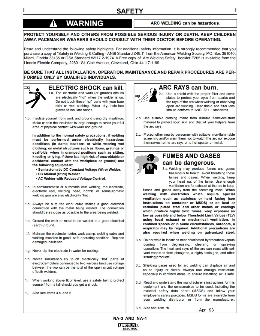 SVM 121-AJune,1997NA-3 AND NA-4AUTOMATIC WELDING SYSTEMSFor use with machines having Code Numbers:NA-3NNA-3SNA-4Safety Depends on YouLincoln arc welding and cuttingequipment is designed and builtwith safety in mind.However,your overall safety can beincreased by proper installation..and thoughtful operation onyour part.DO NOT INSTALL.OPERATE OR REPAIR THIS6EQUIPMENT WITHOUT READ-ING THIS MANUAL AND THESAFETY PRECAUTIONS CON-TAINED THROUGHOUT.And,most importantly,think beforeyou act and be careful.SERVICE MANUALLINCOLN®World's Leader in Welding and Cutting ProductsELECTRICPremier Manufacturer of Industrial MotorsSales and Service through Subsidiaries and Distributors Worldwide22801 St Clair Ave.Cleveland,Ohio 44117-1199 U.S.A.Tel.(216)481-8100