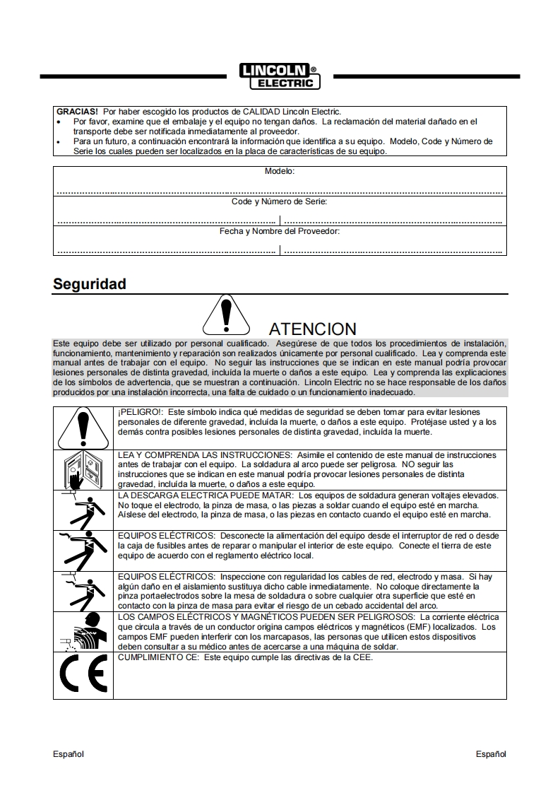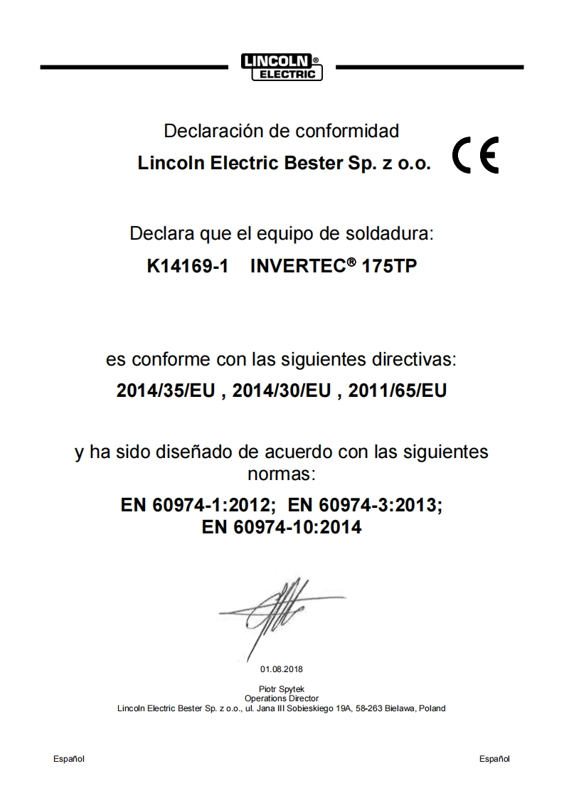 80003691704/2018REV0OINVERTEC®175TPMANUAL DE INSTRUCCIONESINVERTEC::gLINCOLN包回日间175PELECTRICSPANISHLINCOLNELECTRICLincoln Electric Bester Sp.z o.o.ul.Jana Ill Sobieskiego 19A,58-263 Bielawa,Polandwww.lincolnelectric.eu