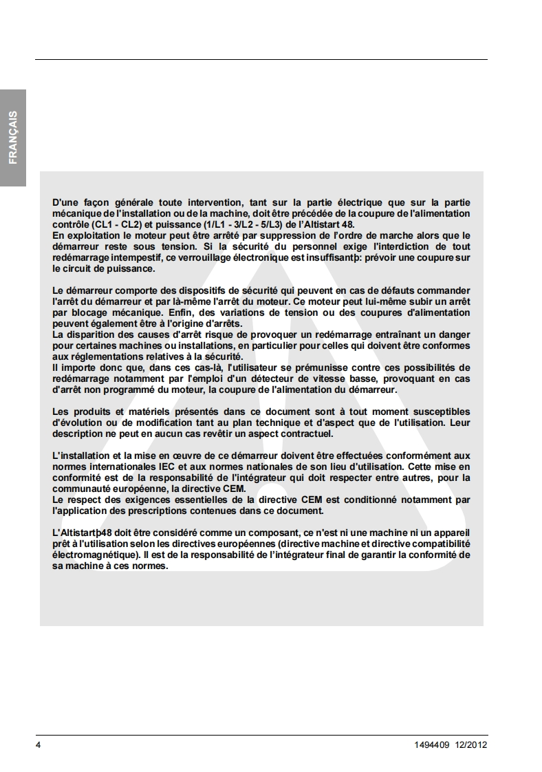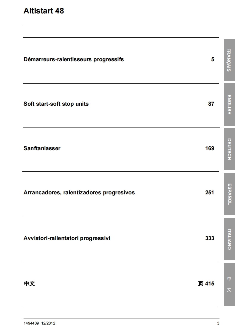 Altistart 48Guide d'exploitationUser manualBenutzerhandbuchGuia de explotacionGuida all'impiego用户手册122012Demarreurs-ralentisseurs progressifs,00©@Soft start-soft stop units,Sanftanlasser,Arrancadores,ralentizadoresprogresivos,Avviatori-rallentatoriprogressvi,软起动器Schneiderwww.schneider-electric.comPElectric