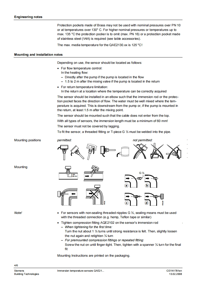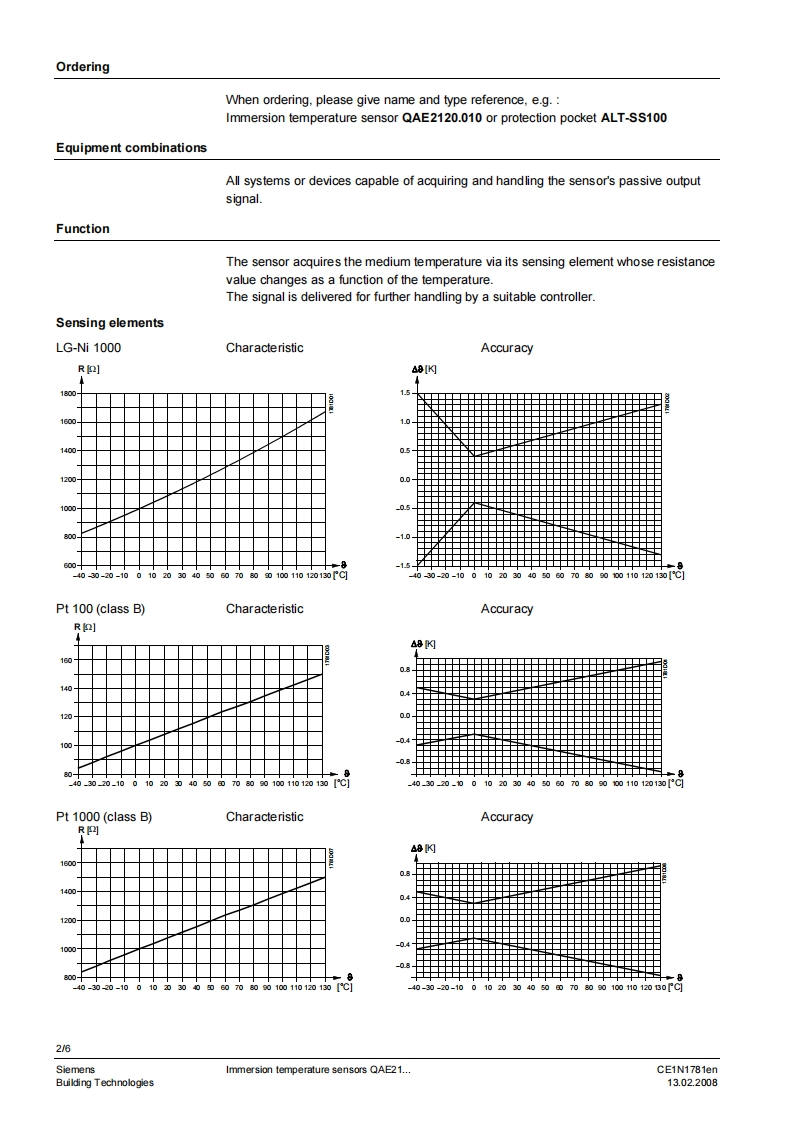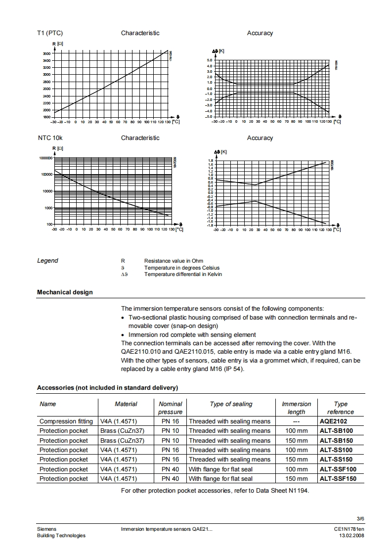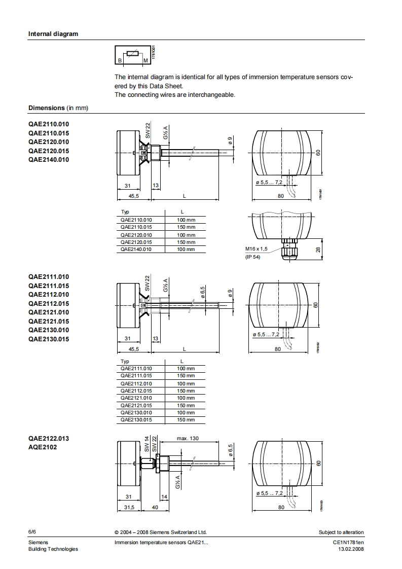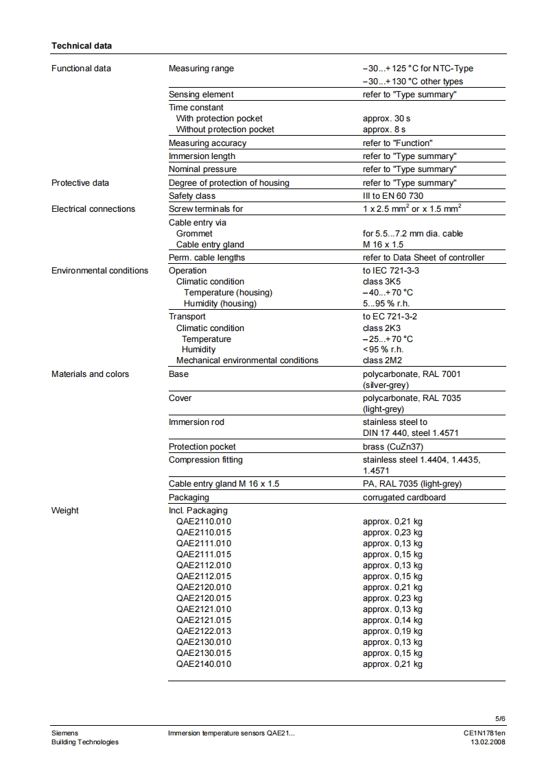 SIEMENS1781SIEMENS豆0*2120010Symaro TMImmersion TemperatureSensorsQAE21...Passive sensors for acquiring the water temperature in pipes and tanks.UseThe QAE21...immersion temperature sensors are for use in ventilation and air condi-tioning plants for:Controlling or limiting the flow temperatureLimiting the return temperatureControlling the DHW temperatureType summaryTypOutfitImmersionNominalSensingDegree oflengthpressureelementprotectionQAE2110.010Including protection pocket with threaded nipple G %A100mmPN10Pt100IP 54QAE2110.015Including protection pocket with threaded nipple G%A150mmPN10Pt1001P54QAE2111.010With clamp for protection pocket100mmPN可Pt100IP 42 (IP 54)3QAE2111.015 With clamp for protection pocket150mmPN可Pt100IP42(IP54))QAE2112.010With clamp for protection pocket100mmPN+Pt1000IP42(IP54))QAE2112.015With clamp for protection pocket150mmPN切Pt1000IP 42 (IP 54)3)QAE2120.010Including protection pocket with threaded nipple G%A100mmPN10LG-M1000I1P420P54)QAE2120.015Including protection pocket with threaded nipple G%A150mmPN10LG-M1000IP420P54)QAE2121.010With clamp for protection pocket100mmPN可LG-N1000IP42(P54QAE2121.015With clamp for protection pocket150mmPNLG-M1000IP42(0P54)QAE2122.013Including compression fitting with threaded nipple G %Amax.130 mmPN16LG-M1000IP42(IP54)可QAE2130.010With clamp for protection pocket100mmPNNTC 10kIP42(IP54)到QAE2130.015With clamp for protection pocket150mmPN+)NTC 10kIP42(IP54)到QAE2140.010 Including protection pocket with threaded nipple G %A100mmPN10T1IP420P54))1)Protection pocket required(not included as standard)2)Adjustable immersion length3IP 54 with cable entry gland M16(not included as standard)4)Depending on the type of protection pocket usedCE1N1781en13.02.2008Building Technologies