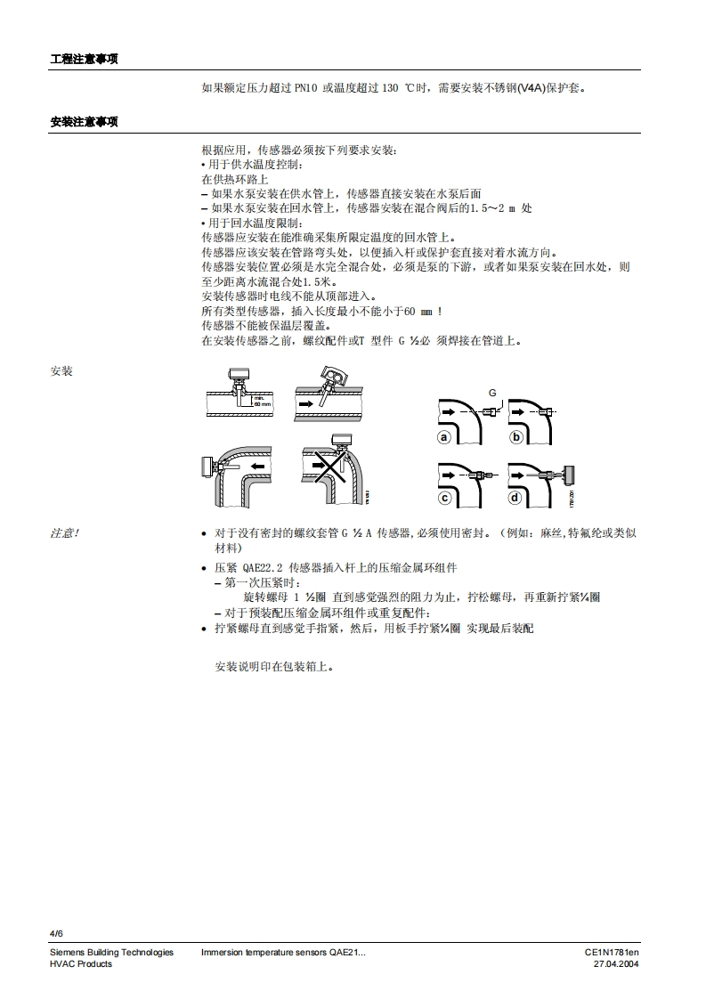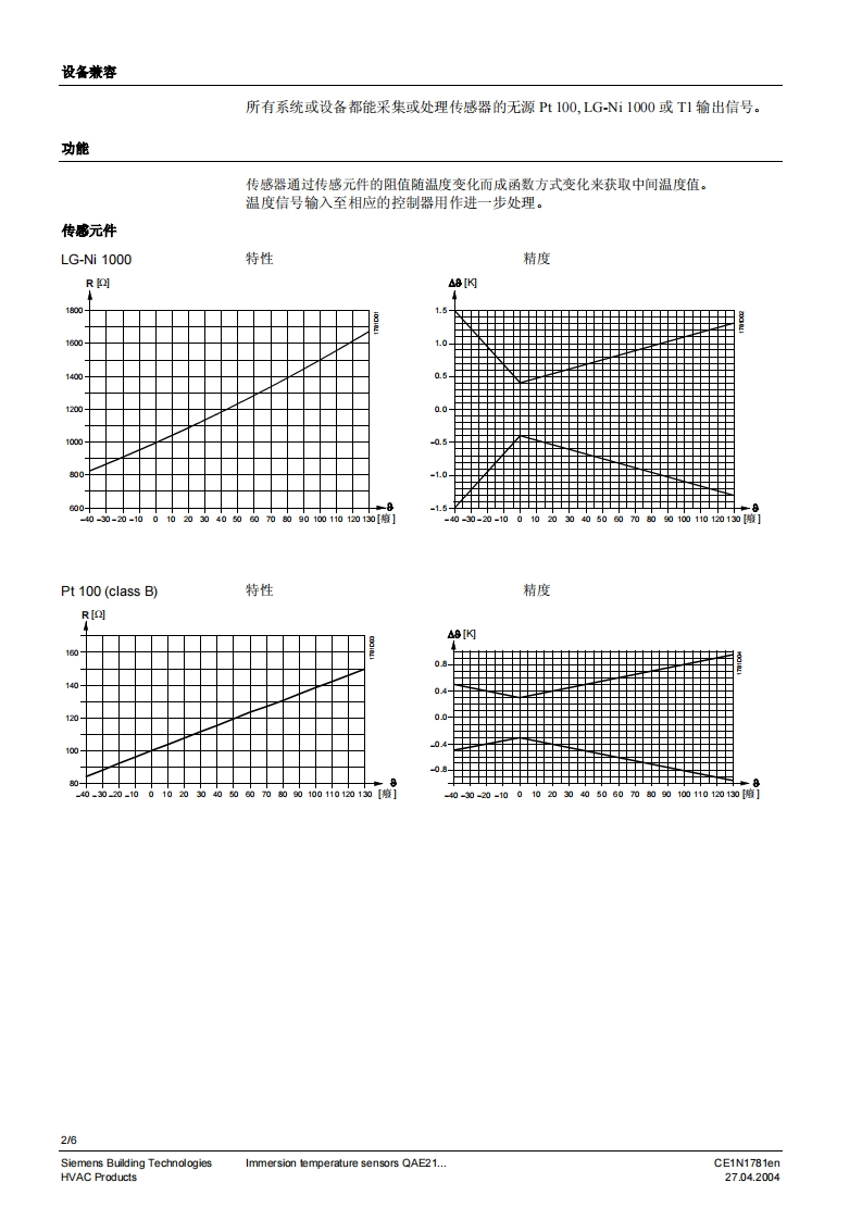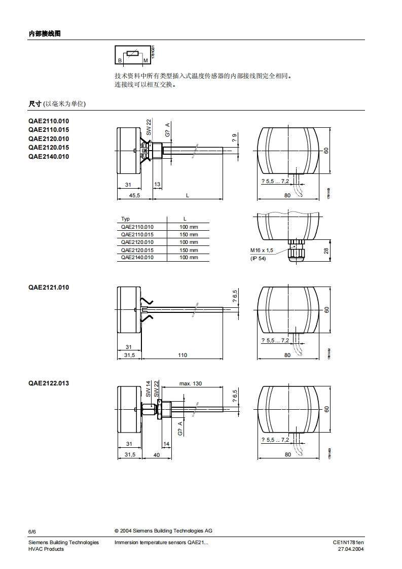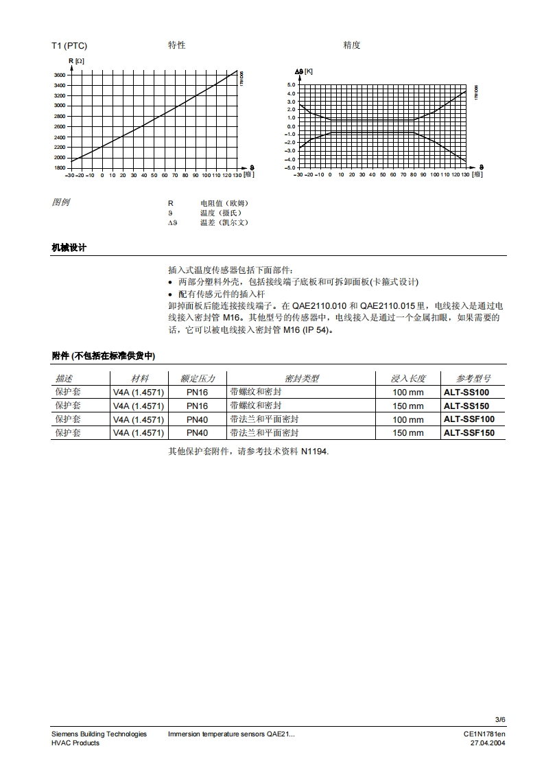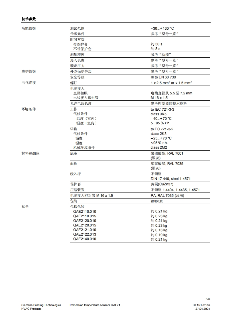 SIEMENS1781SIEMENS02120010Symaro TM插入式温度传感器QAE21...无源插入式温度传心器用于采集水管与水箱中的温度。用逢QAE21..插入式温度传感器用于:·控制或限定水流温度·限定回水温度·控制生活用水温度型号一览型号外部构件浸入长度额定压力传感元件防护等级QAE2110.010配有保护套和螺纹套管GhA100mmPN10Pt100IP 54QAE2110.015配有保护套和螺纹套管GhA150mmPN 10Pt100IP 54QAE2120.010配有保护套和螺纹套管GhA100mmPN 10LG-Ni1000IP42(0P54)可QAE2120.015配有保护套和螺纹套管G?A150mmPN 10LG-Ni1000IP420P54))QAE2121.010配有用于保护套的夹子可100mmPNLG-Ni 1000 IP 42 (IP 54)3QAE2122.013配有压力装置和螺纹保护套GAmax.130 mm 2PN 16LG-Ni1000IP42(P54)可QAE2140.010配有保护套和螺纹套管GA100mmPN 10T1IP42(P54)可1)需要保护套2)可调节浸入长度3)P54带电线接入密封管M16(标准中不包括)4)根据所使用保护套的型号订货订购时,请给出名称和型号类型或订货号码。例如:插入式温度传感器QAE2120.010或保护套ALT-SS100CE1N1781enSiemens Building Technologies27.04.2004HVAC Products